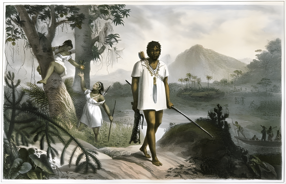 Embora não tenha viajado para além do Rio de Janeiro, Debret obteve informações de outros viajantes para representar a vida dos índios no interior do Brasil.