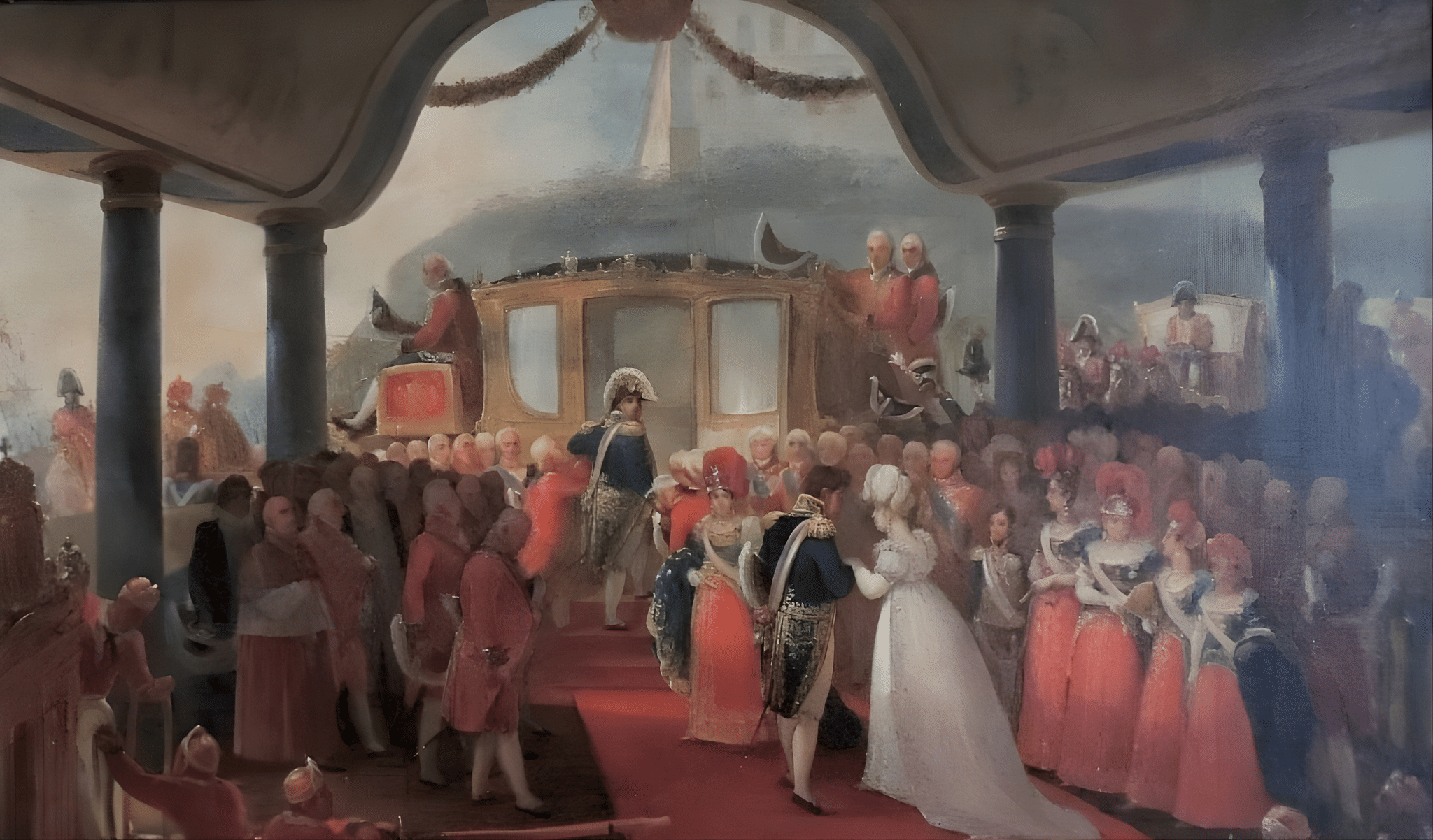 Em 1817, Maria Leopoldina de Habsburgo-Lorena (também conhecida como Habsburgo Lorena ou Áustria) chegou ao Rio de Janeiro para se casar com o Imperador Pedro I do Brasil. Os dois noivos são retratados acompanhados pelo Rei João VI de Portugal.