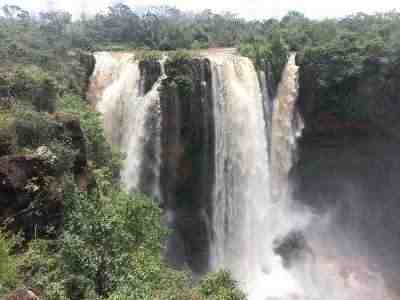 Ao se aproximar da cachoeira, o som poderoso da água caindo cria uma atmosfera mágica, enquanto a paisagem ao redor é adornada por uma rica vegetação nativa e formações rochosas que emolduram a cena.