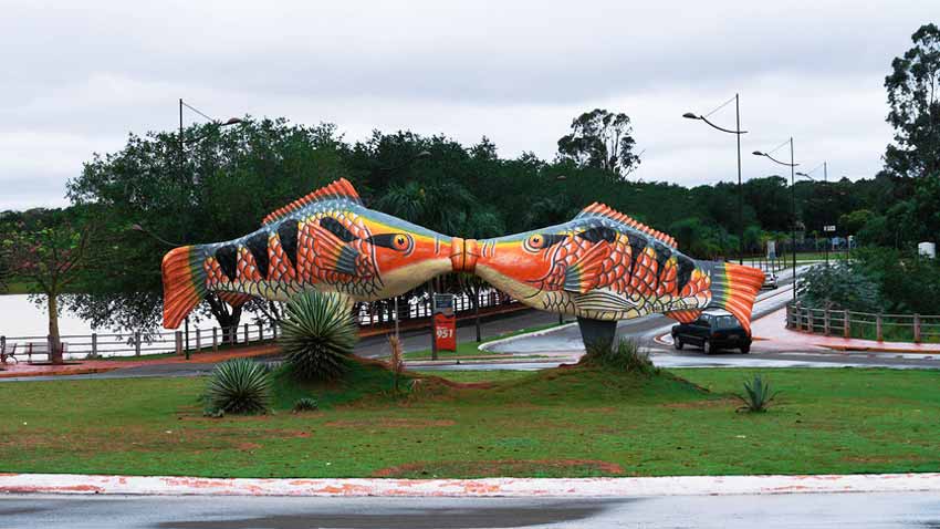 O monumento é feito de concreto armado e retrata dois peixes carás se beijando. É uma boa dica para apreciar o pôr do sol.