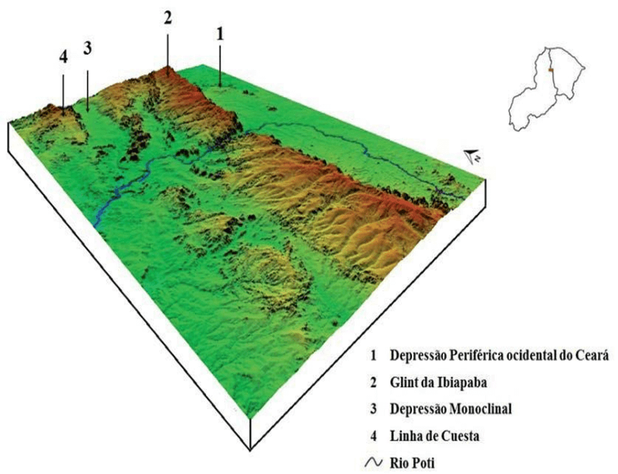 No segmento ocidental do Estado do Ceará, na zona que hoje corresponde à divisa com o Estado do Piauí, esse soerguimento colocou terrenos sedimentares (os arenitos da Bacia Sedimentar do Parnaíba, bem antigos, de cerca de 430 milhões de anos) e terrenos cristalinos também antigos (de 2,2 bilhões de anos, formado por gnaisses e outras rochas metamórficas) lado a lado (Figura 1).