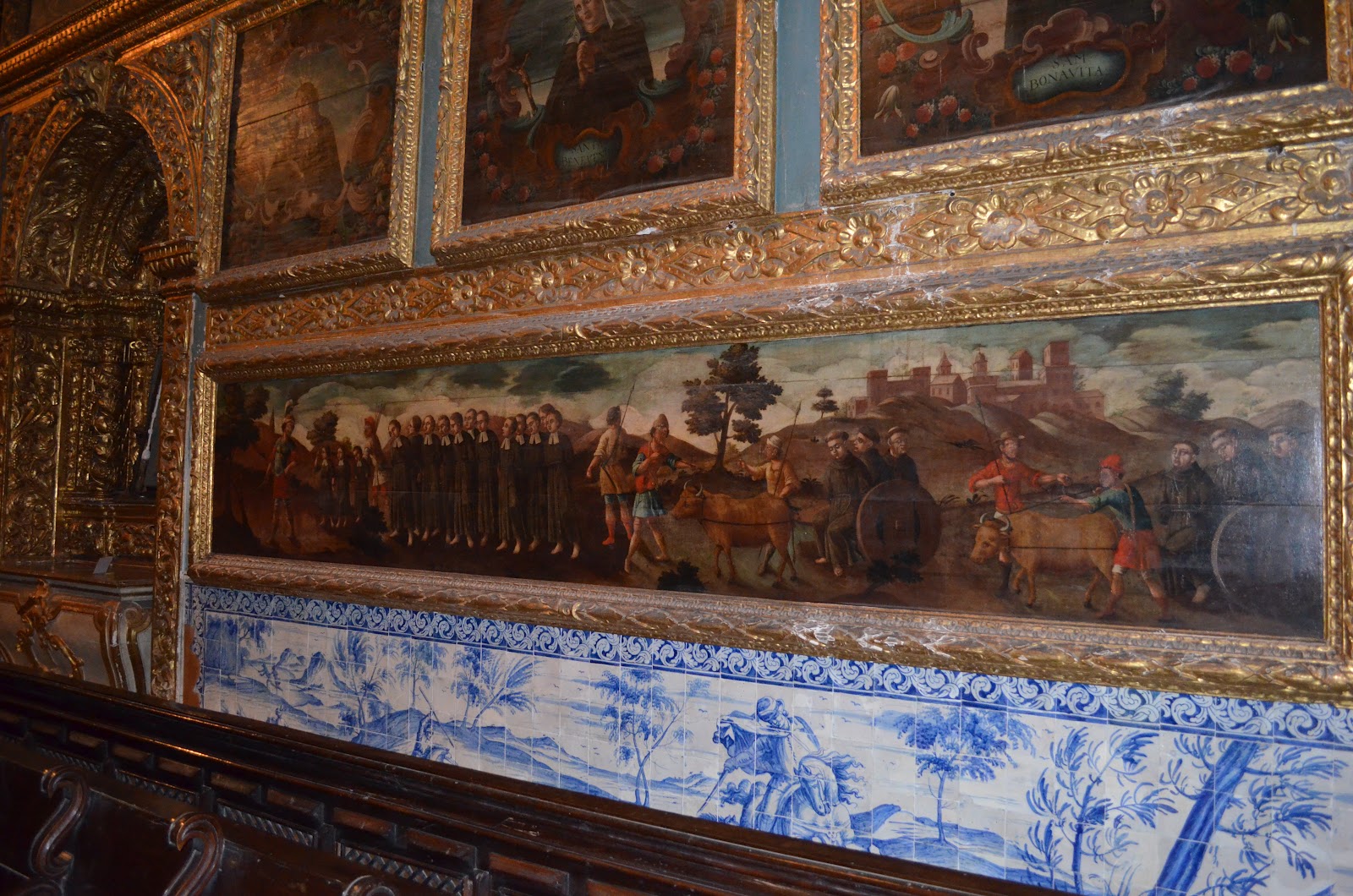 “Dois longos painéis, nas paredes laterais, mostram os mártires franciscanos.” Os frades missionários corriam caminhos da Europa e dos outros continentes. Um dia, cinco frades passaram por Coimbra, rumo a Marrocos, na África, onde iam levar o evangelho aos muçulmanos.