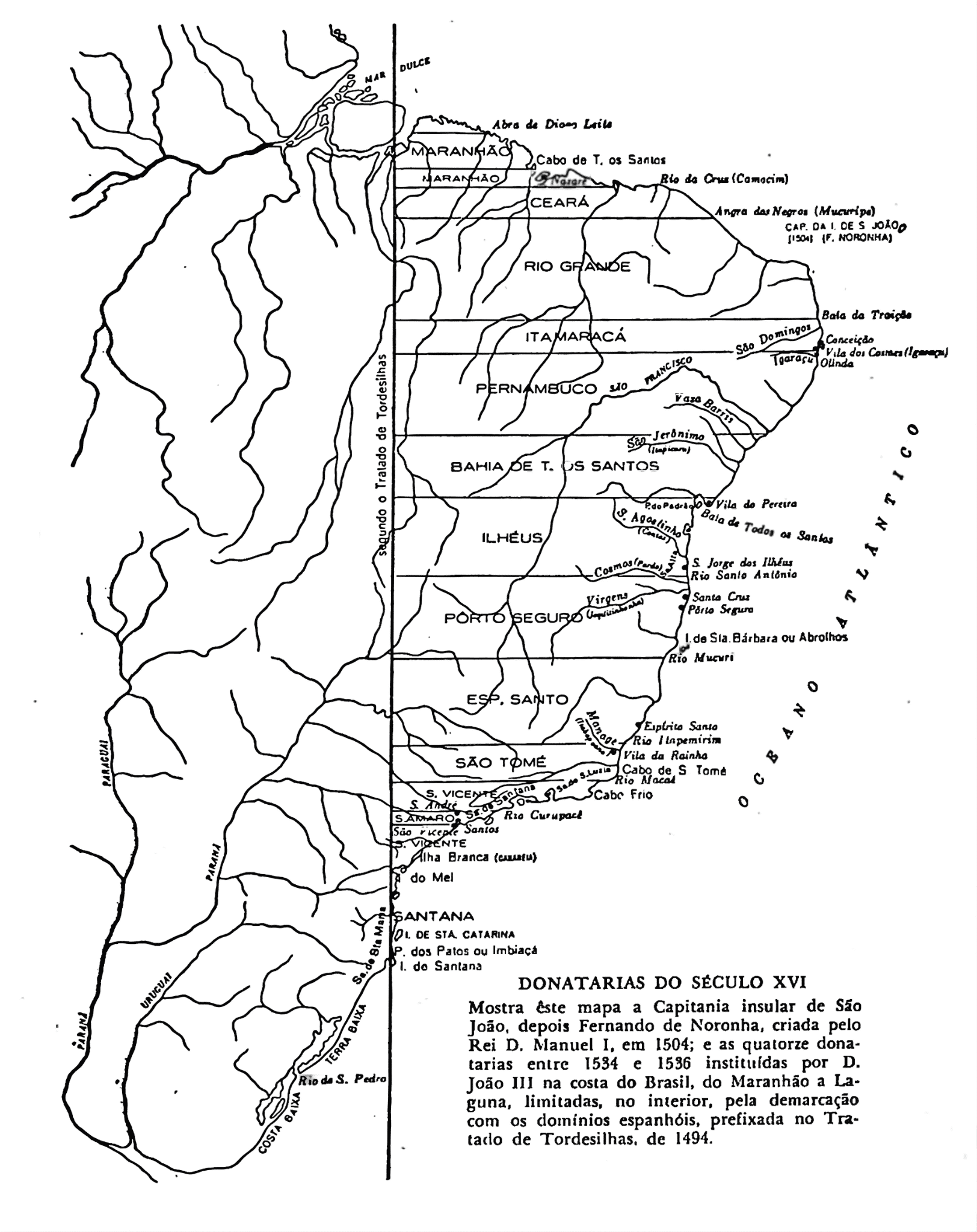 - Pernambuco (Nova Lusitânia) — 60 léguas de litoral, entre os rios Igaraçu e São Francisco; outorgada a Duarte Coelho.