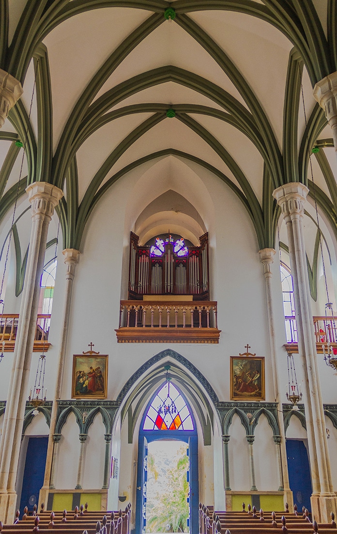 A imponente fachada da Igreja Nossa Senhora Mãe dos Homens, construída em estilo neogótico, pode ser vista de longe. Sua estrutura, feita de pedra-sabão e mármore, guarda diversas curiosidades que encantam turistas e visitantes.
