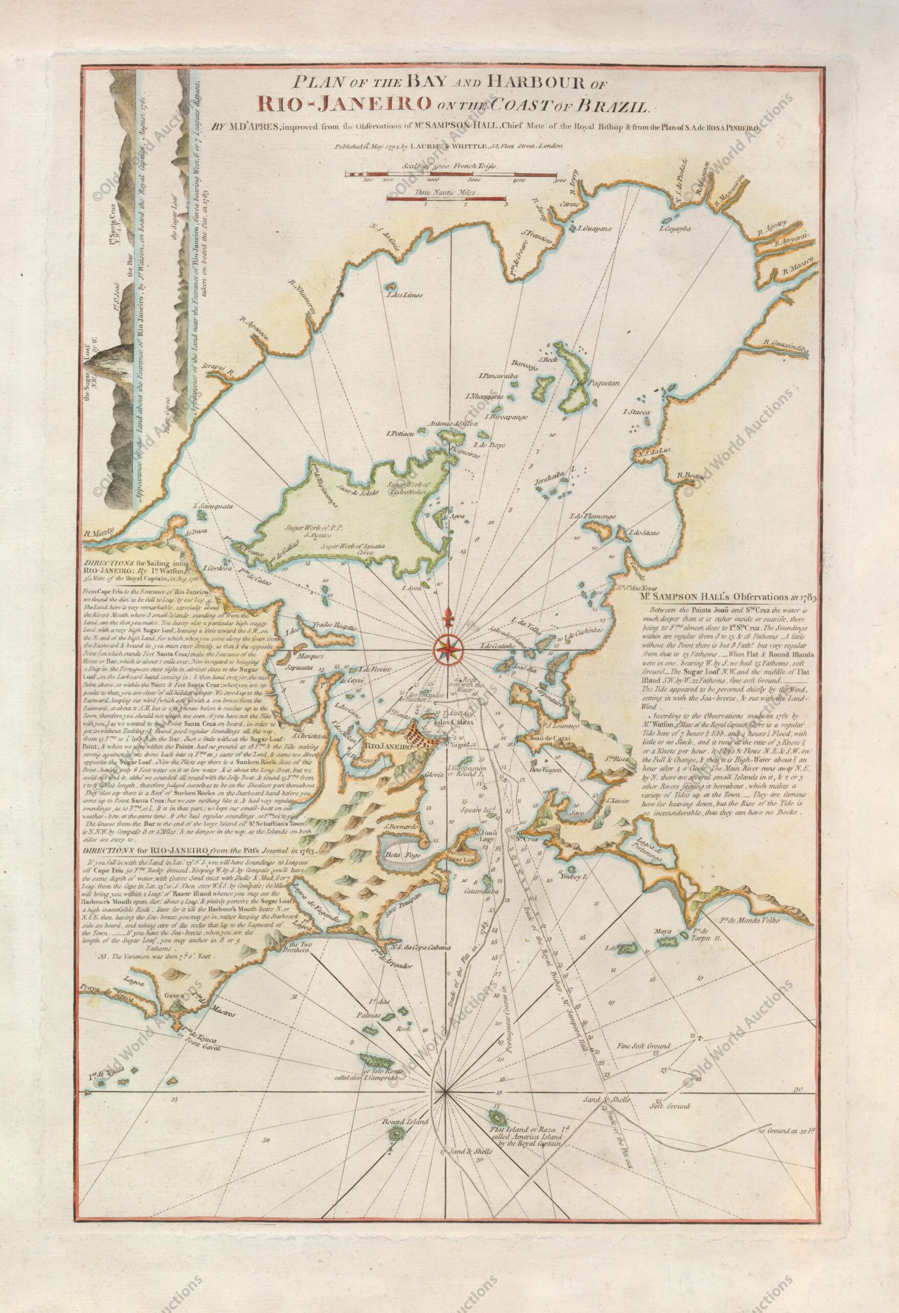 Dieser seltene Plan von Rio de Janeiro basiert auf dem Werk von D’Apres de Mannevillette mit Verbesserungen von Sampson Hall, dem Ersten Offizier der Royal Bishop, und dem Plan von Simão Antonio da Roza Pinheiro.