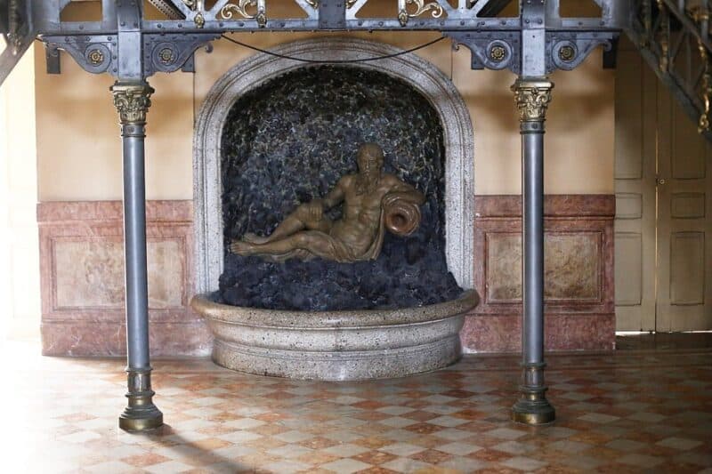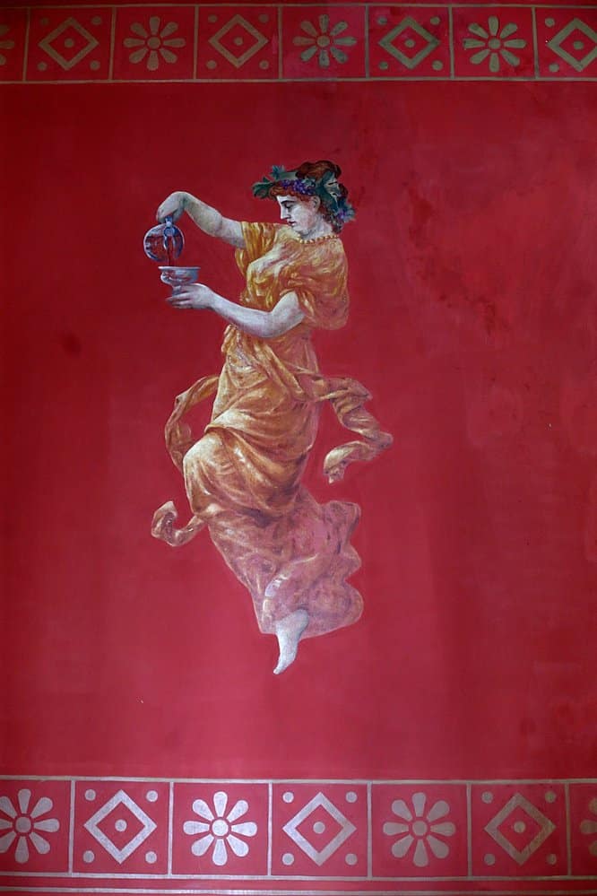 Der Pompejanische Saal ist der älteste, er hat den Brand von 1911 und die Bombardierung von 1912 überstanden. Er ist eine Hommage an die Zivilisation von Pompeji mit Fresken und Gemälden, die von griechischen Balken umrahmt sind – eine davon ist die mythologische Bacchantin – Priesterin des Bacchus.