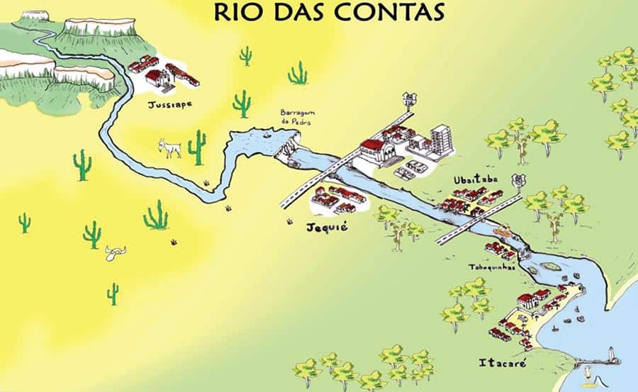 - Die wichtigsten Orte, die er durchfließt: Piatã (Quelle), Abaíra, Jussiape, Dom Basílio, Tanhaçu, Jequié, Jitaúna, Itagibá, Ubatã, Ubaitaba, Aurelino Leal und Itacaré.