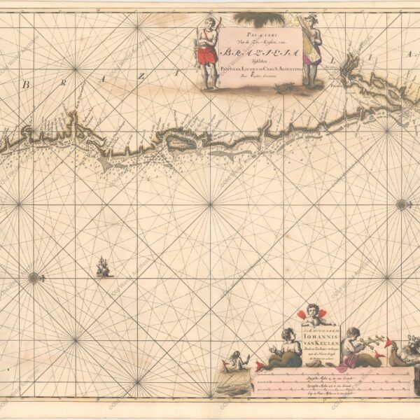 Mapa da costa brasileira do Rio Paraíba ao Cabo de Santo Agostinho de 1683 „Pas-Kaart, van de Zee-Kusten, van, Brazilia, Tusschen, Punto de Lucena en Cabo S. Augustino“, Keulen, Johannes van Este raro e clássico mapa marítimo cobre a costa brasileira do Rio Paraíba ao Cabo S. Augustino. É preenchido com […]