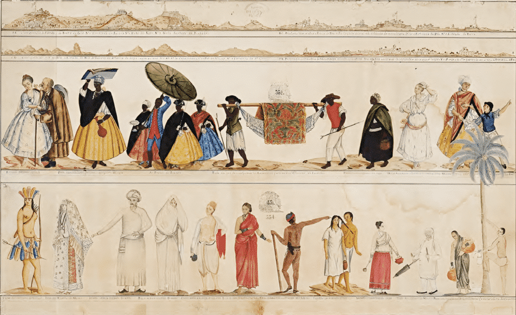 In view of this complementarity between text and image, it’s important to emphasise the importance of each character ‘s clothing as the main indicator of the figure’s identity, whether in terms of race, social status, cultural background or even the activity performed within the society being observed.