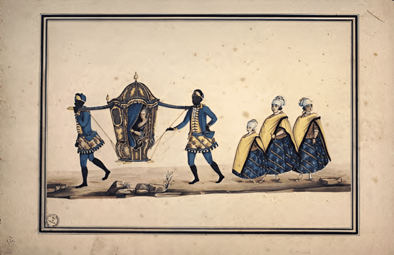 In the central group, the refinement that surrounds the figure of the ‘lady’ of Bahia is evident, whether from the point of view of the little chair on which she is carried (made of carved wood, with gilding and ornaments), or her own clothing (which is more sophisticated than that of the other characters), or even the blacks who carry her, dressed with care, although barefoot.