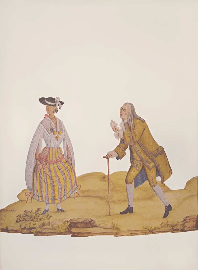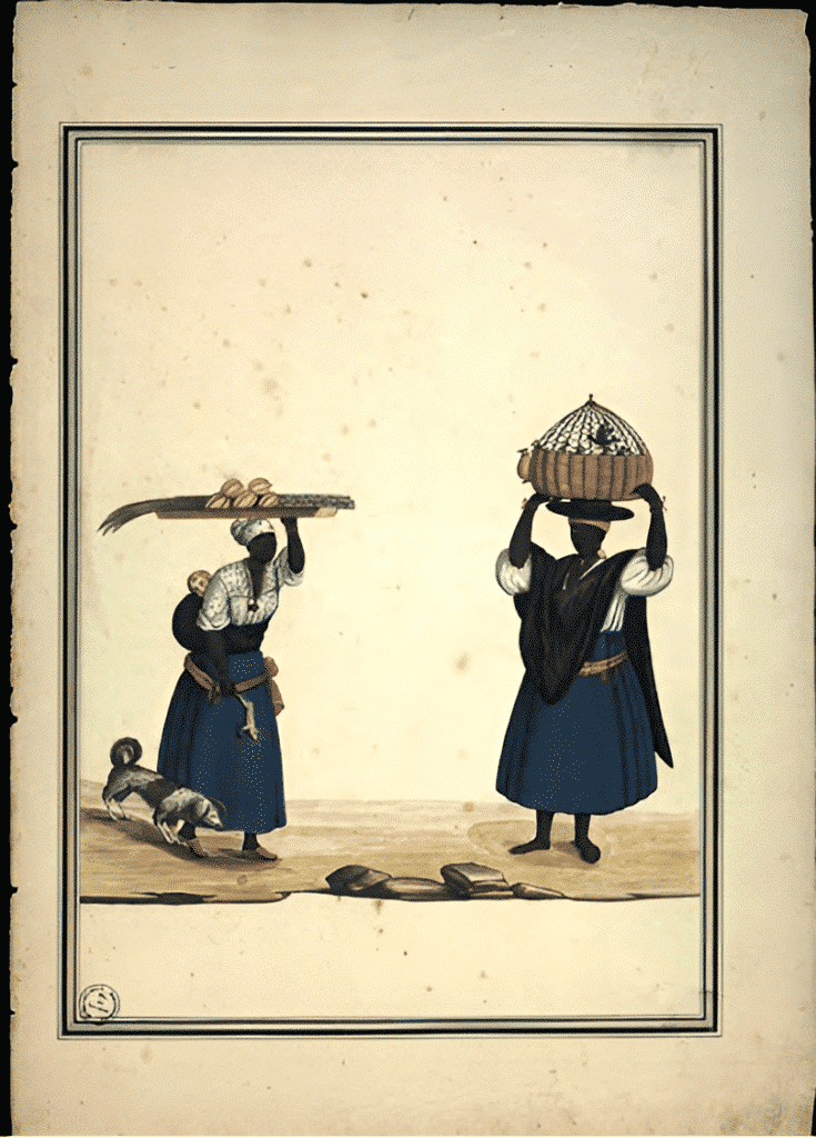 5 Of the characters represented, three correspond exactly to types that appear in the album Riscos iluminados ditos de figurinhos de brancos e negros dos usos do Rio de Janeiro e Serro do Frio, a work attributed to Carlos Julião, owned by the Fundação Biblioteca Nacional, Rio de Janeiro, as we’ll see below.