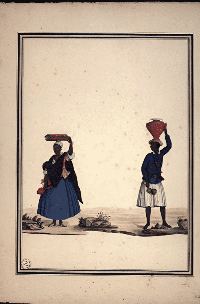 The figures represented in Julião ‘s painting roughly correspond to two white ladies, two figures of slaves (a black man with a clay jug on his head and a black woman carrying a tray of fruit), as well as a central group in which two slaves carry a white lady on achair4, accompanied by a gentleman who shows them the direction to follow5. The pictures are labelled with the following captions: