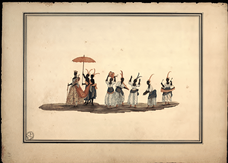 Finally, we are presented with the costume of the ‘black Minas of Bahia’, in which we can distinguish the presence of the ‘bolsa de mandinga’ hanging from the sash at the waist, as well as the scarifications on the face, which Julião draws with great attention7.