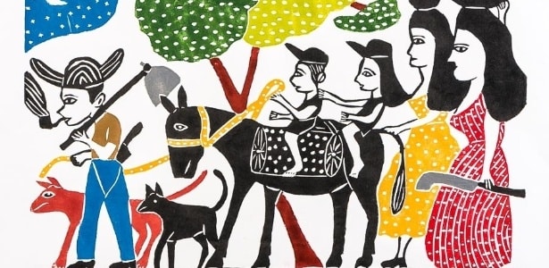 The artist highlights the engraving “The Arrival of the Prostitute in Heaven,” from 1976, as his most famous work. His work depicts the everyday life of the Northeastern man, culture, and folklore, as well as the people’s struggle in the hinterland. Another frequent theme in cordel and Borges’ engravings is cangaço.