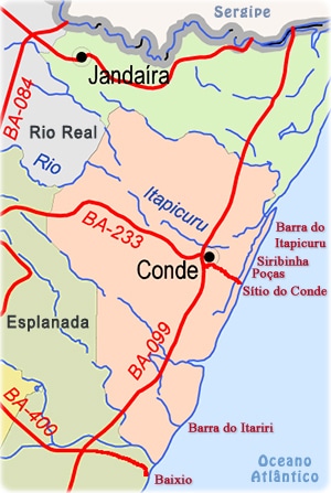 Conde borders Jandaíra and Rio Real (north), Rio Inhambupe (south), Esplanada (west) and the Atlantic Ocean (east). It is 151 kilometres from Salvador (as the crow flies) and 203 kilometres by the BR-101 motorway.