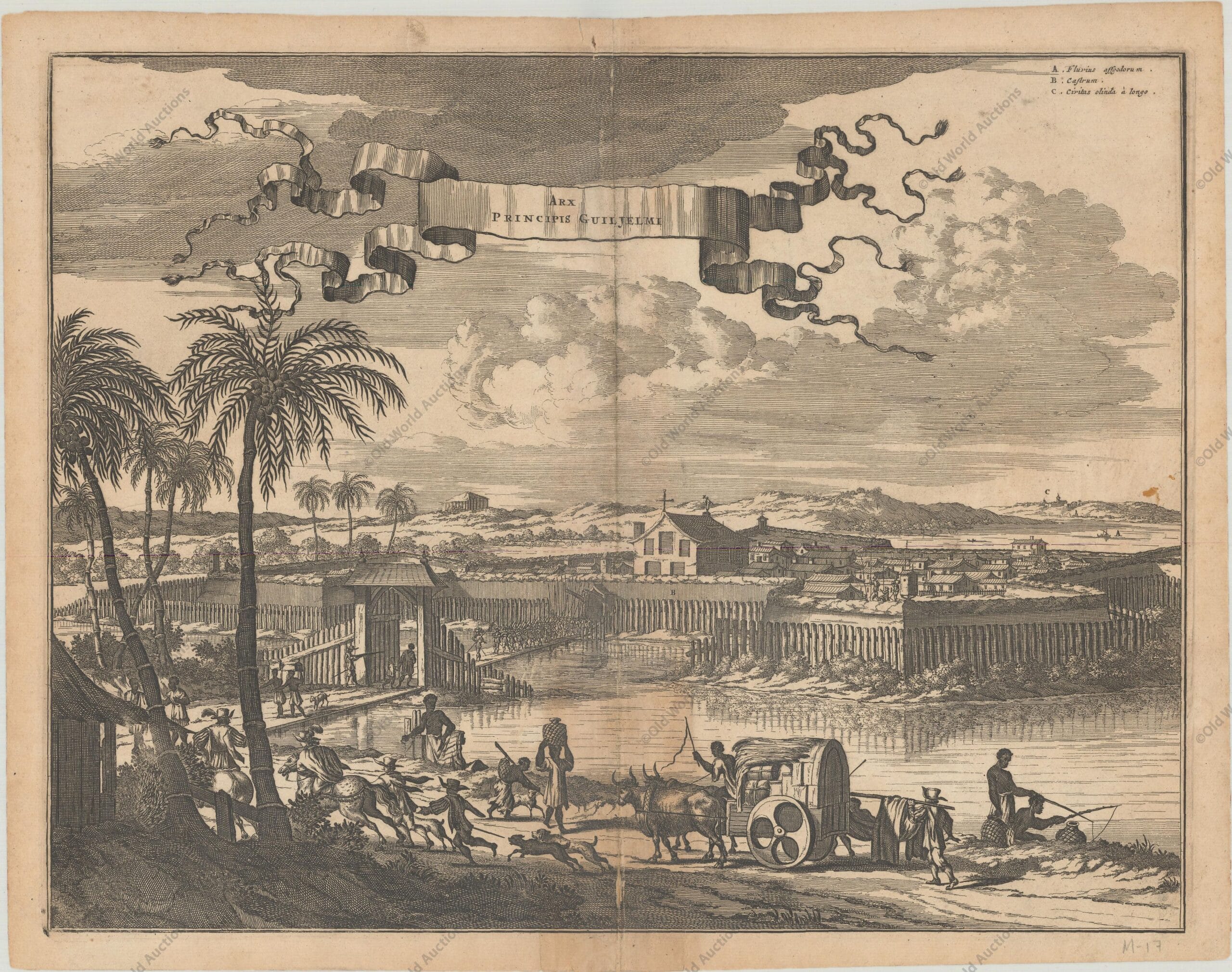 Impressive view of Dutch Fort William on the Afagados River with its central church and strong palisades. Olindia is on a hill in the background. Fort Príncipe Guilherme was part of the Dutch defences of Pernambuco. This detailed engraving was inspired by a 1639 painting by the famous Dutch artist Frans Post. “Arx Principis Guiljelmi, Montanus, Arnoldus