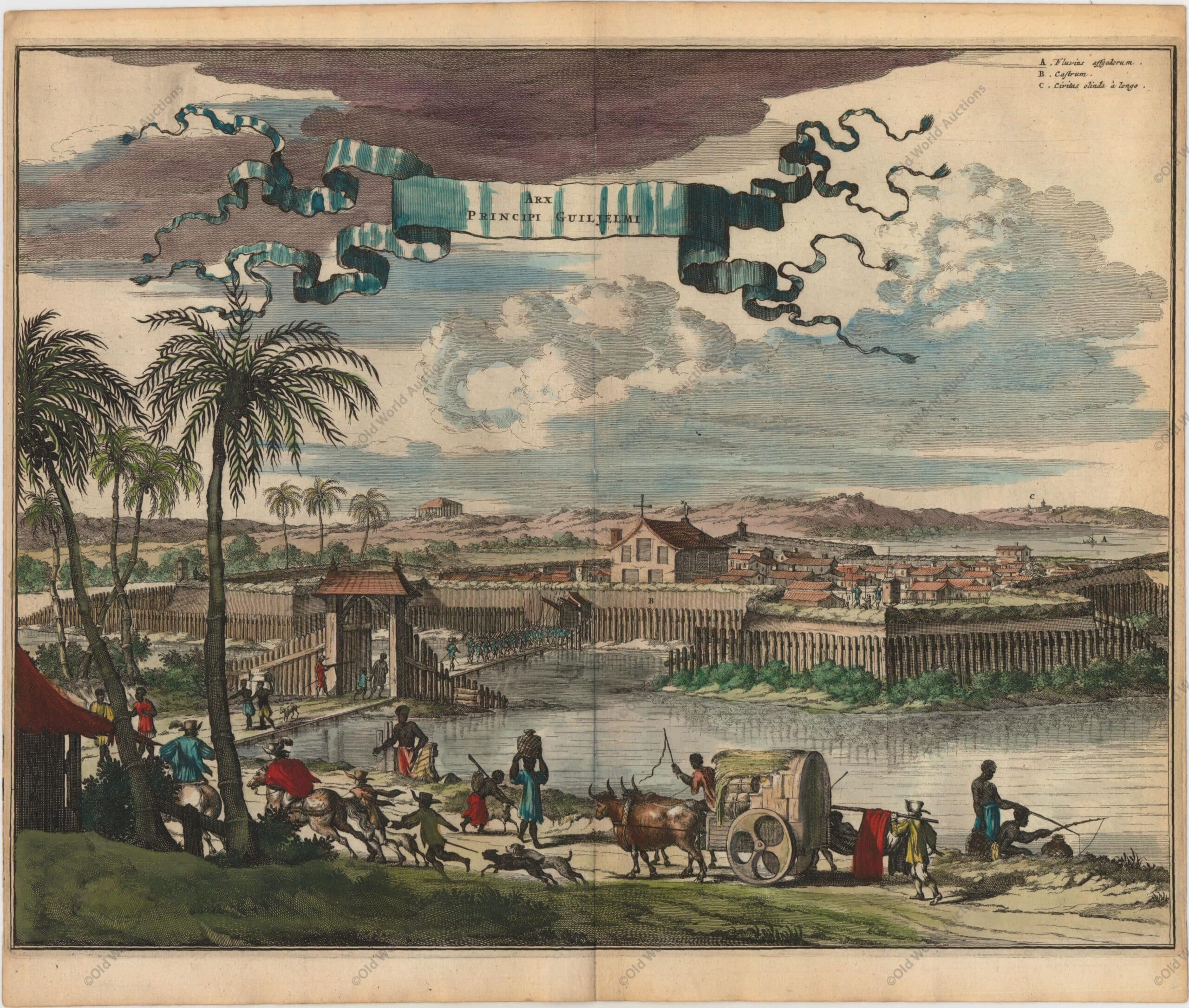 Impressive view of Dutch Fort William with its central church and strong palisades. Olinda is on a hill in the background. Ribbon-like cartouche in the sky. “Arx Principi Guiljelmi”, Montanus, Arnoldus