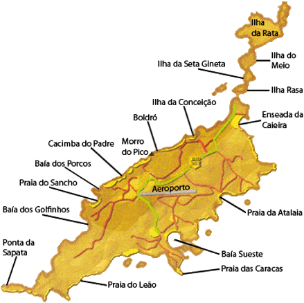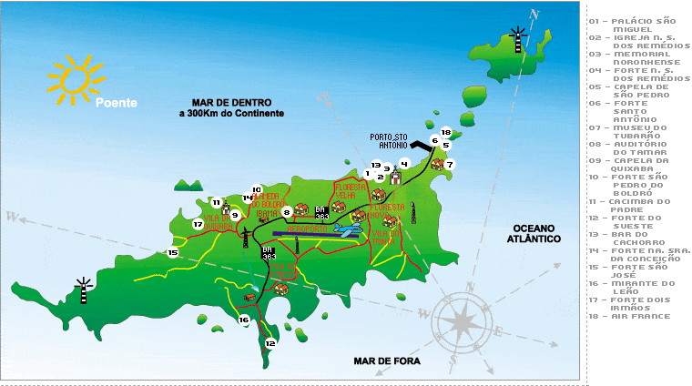 The island has historical sites such as Vila dos Remédios, Vila da Quixaba and the ruins of colonial forts. Infrastructure includes an airport, hospital, schools, electricity and water treatment plants.