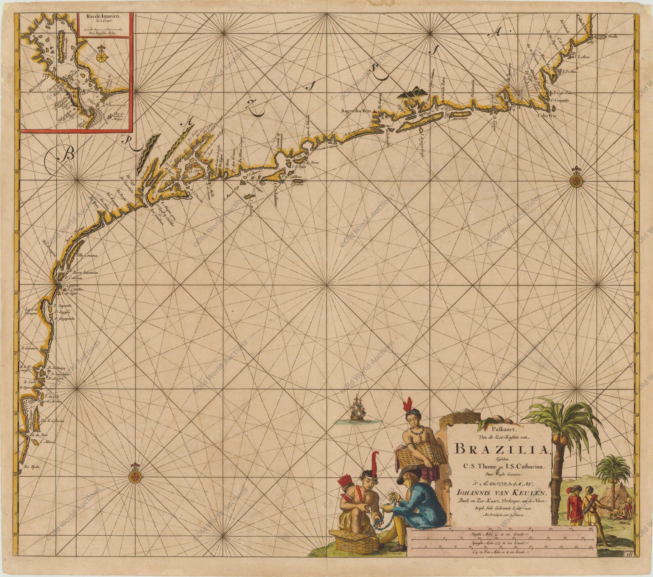 Map of Rio de Janeiro from 1682 “Pas-kaart, Van de Zee-Kusten van, Brazilia, Tusschen, C.S. Thome en I.S. Catharina…”, Keulen, Johannes van Rare sea chart of the Brazilian coast from the island of Santa Catarina to Cape S. Thomé, together with an inset of Rio Ianeiro (Rio de Janeiro). Thomé, together with an inset of the Ianeiro River (Rio de Janeiro and Guanabara Bay). The decorative map is filled with rhumb lines, two compass roses and a sailing boat. The title cartouche is flanked by natives exchanging goods with a European merchant and a tent in the background. Map of Rio de Janeiro 1682 – Historical Map