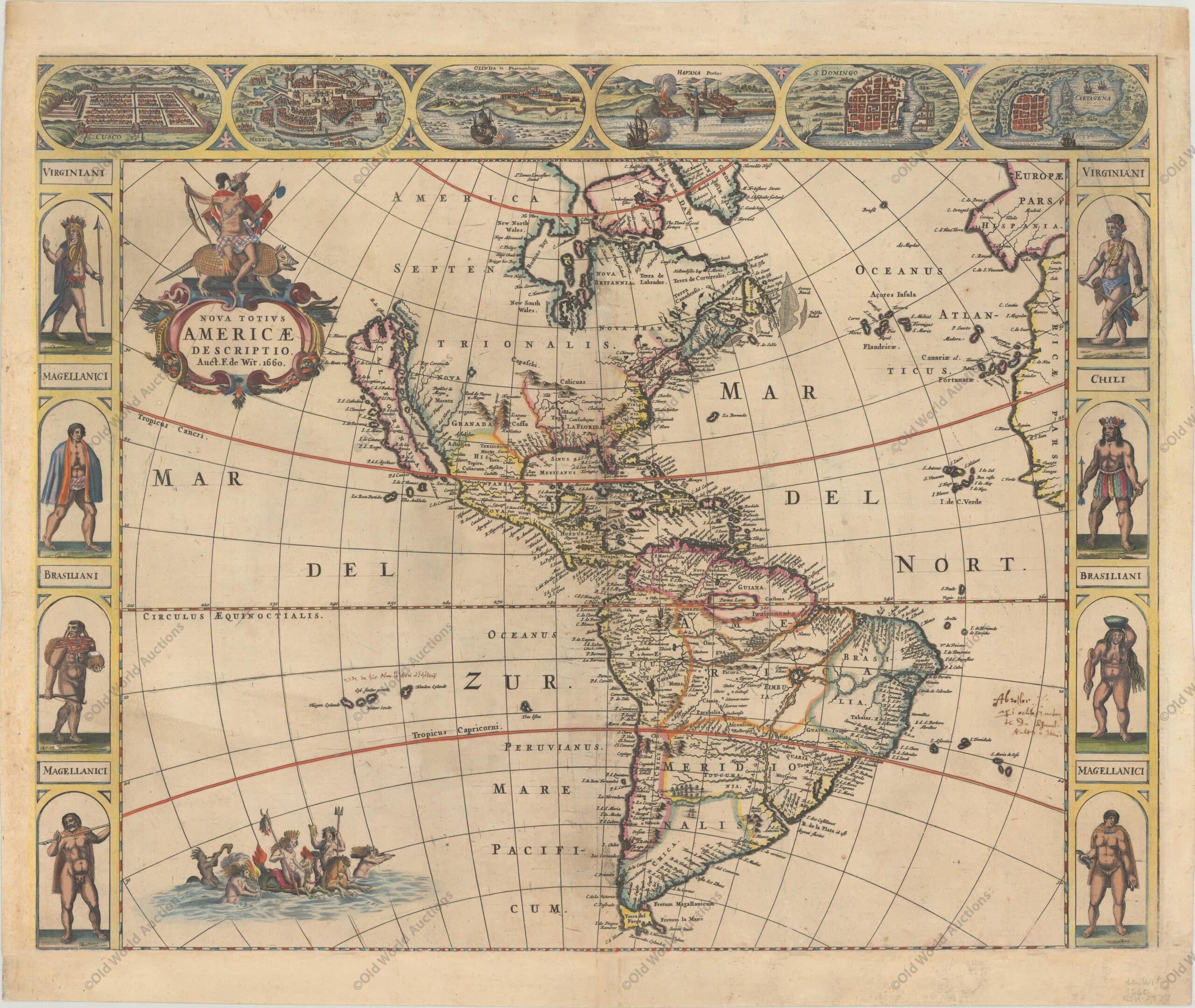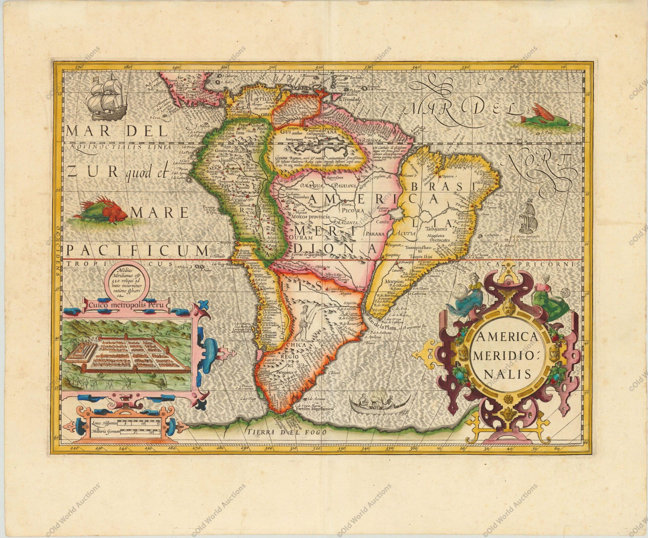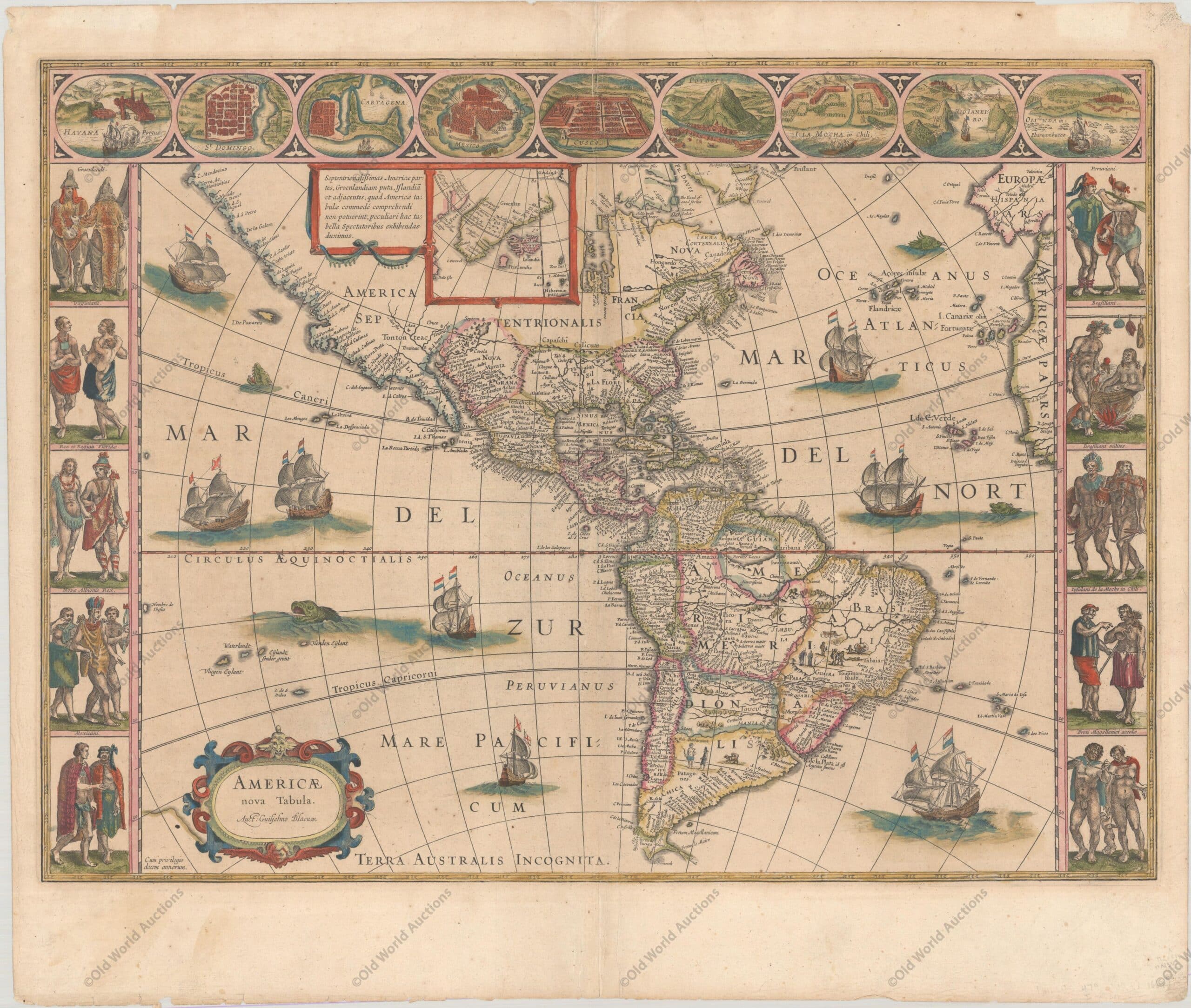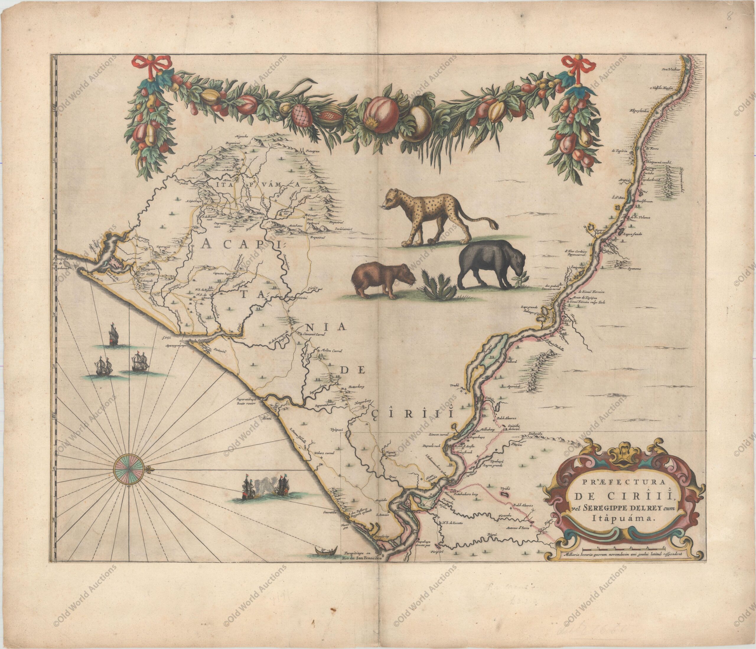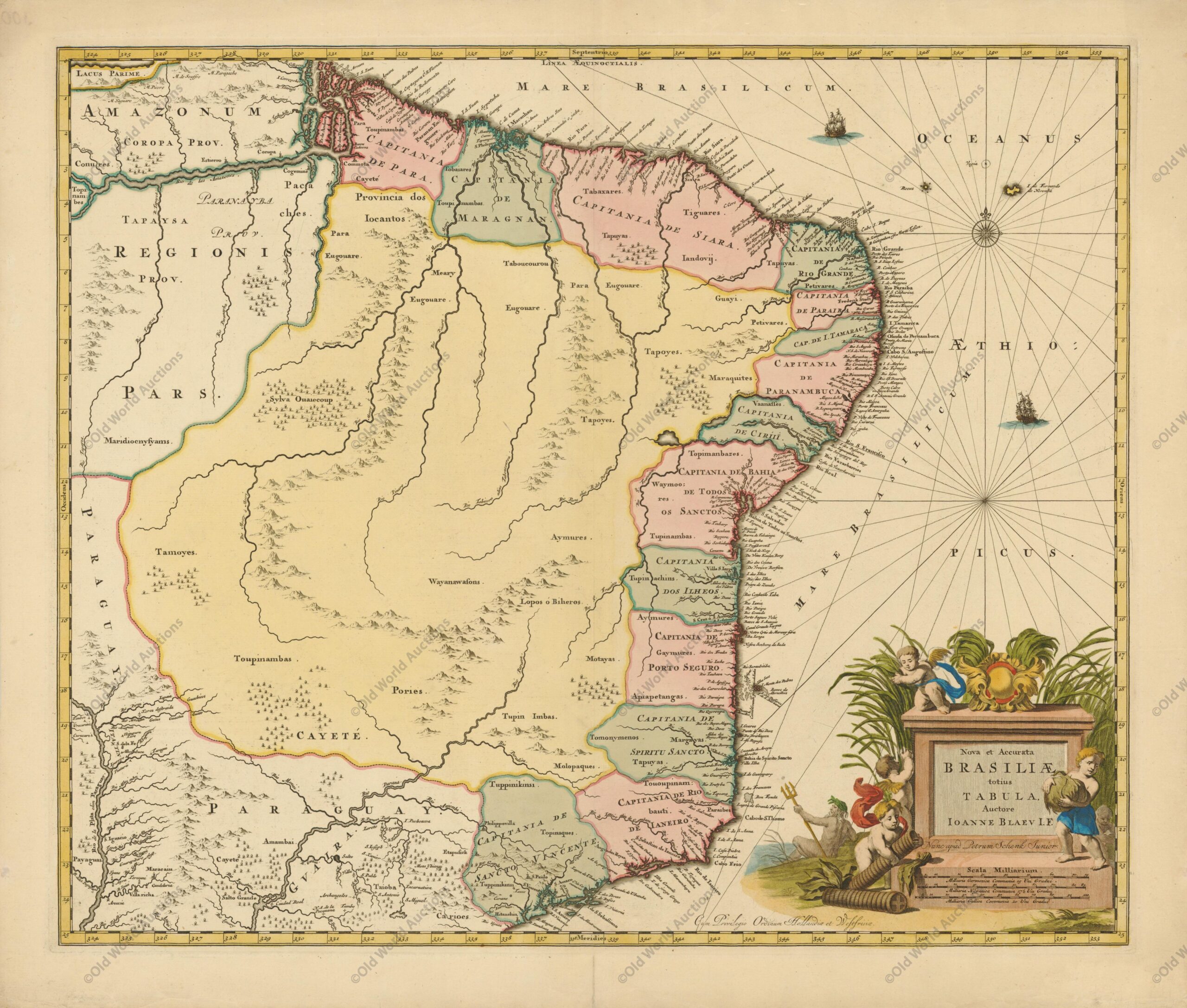Map of Brazil from 1652 – Beautiful depiction of Brazil with the north oriented to the right by a beautiful compass rose. The map is inset with two regions of Dutch interest in the area; Baja de Todos los Sanctos and Pernambuco. The interior is devoid of geographical information, except for largely imaginary rivers and forests. Instead, the region is full of dramatic scenes of native peoples, including warfare and cannibalism, and some curious wildlife. The hereditary captainships established by the Portuguese are marked along the coast. The decorative title cartouche is flanked by a local family and the seas are decorated with sailing ships, a sea monster and a compass rose. French text on verso, published between 1652-58. “Accuratissima Brasiliae Tabula”, Hondius/Jansson.Map of Brazil divided into fourteen captaincies, 1657 – Map of Brazil divided into fourteen hereditary captaincies, 1657 – This is a reduced version of Sanson’s important map showing the Portuguese possessions in Brazil. The coastal regions were divided by the Portuguese Crown into fourteen captaincies, or hereditary ports. The holders of these grants, called donatários, were responsible for their defence and development. A series of rivers appear in the interior. The mythical Lago de los Xarayes appears on the left, and the unknown interior is conveniently covered by the garlanded title cartouche. Sanson’s small maps of his America in various maps…, first published in 1656 and engraved by A. Peyrounin, were copied several times by various map publishers. Johann David Zunners made copies of Sanson’s maps for his German translation of Die Gantze Erd-Kugel in 1679. Johannes Ribbius and Simon de Vries published copies in 1682 and 1683, with new maps engraved by Antoine d’Winter. The plates were later sold to François Halma, who used them in 1699 and again in 1705, with the titles again engraved in Dutch. The titles on the d’Winter plates were again engraved in French and then used by Nicholas Chemereau in 1715 and Henri du Sauzet in 1738. “Le Bresil, dont la Coste est Possedee par les Portugais, et Divisee en Quatorze Capitaineries…”, Sanson, Nicolas.Map of the Western Hemisphere of 1659 – This is a very rare derivative of the important Hondius map of 1618. The engraver is unknown, although it is a close copy of Picart’s 1644 version, which in turn was derived from Jansson’s 1623 map. North America retains the peninsula of California, and there isn’t much detail along the east coast in the mid-Atlantic region. In the south-west, the famous Seven Cities of Cibola appear on the shores of a large false lake. In South America, the mythical Parime Lacus is shown south of Guyana, and there are two engraved scenes, one showing a cannibal feast and the other a mythical giant from Patagonia. Two stylised insets of the polar regions are placed on strip maps; the North Pole shows Frobisher’s theory of the Northwest Passage, and the South Pole shows the long-held idea of the mythical southern continent. The map is flanked on three sides by carte-a-figure borders depicting Native Americans and their major cities. This map is easily distinguished from Hondius’s map by the fact that the figures on the sides were inverted when copied by the engraver. Unlike Blaeu’s similar map, the towns at the top include three North American towns: the Indian village of Pomeiooc in Virginia, the French fort in Carolina, and St Augustine in Florida.1660 Map of the Western Hemisphere – An unusual and splendidly figured map of the Americas. The map combines many different sources, including Luke Foxe’s model of the island of California. The only reference to the Great Lakes is a small L at the end of the St Lawrence River. Nieu Neder Land occupies the east coast, and there is no mention of any English settlement other than the name Virginia. In South America, a large river and lake system borders Brazil, with the mythical Lake Eupana Lacus. A second mythical lake, Parime Lacus, is shown along the equator. The decoration is taken from van den Keere’s map of 1614. The figures on the sides depict the natives of Virginia, Magellan and Brazil, and the cities at the top include Cusco, Mexico, Olinda, Havana, St Dominique and Cartagena. The map is further embellished with a title card showing a native Indian riding an armadillo and Neptune frolicking in the Pacific with mermaids and seahorses. This is the first state of this map to be issued separately, with the date in the title.Map of South America and Brazil, 1624 – This engraving is part of a remarkable series of publications illustrating voyages of discovery and exploration in various parts of the world. The project was begun by Theodore de Bry of Frankfurt in 1590 and continued for another 54 years. Together they became known as the Grands Voyages (to America and the West Indies) and the Petits Voyages (to the Orient and the East Indies). De Bry died after completing the first six parts of the Grands Voyages. The project was completed first by his widow and two sons, Johann Theodore de Bry and Johann Israel de Bry, and then by his son-in-law, Matthaus Merian, in 1644.Map of Brazil, 1630 – This beautiful map was a collaboration between Hessel Gerritsz, official cartographer of the Dutch East India Company, and Johannes de Laet, director of the newly formed Dutch West India Company. Their maps of South America laid the foundations for many other cartographers. The detail is limited to the coasts and includes the capitanias. The interior is filled with a large title cartouche and distance scales, and the map is further embellished by a compass rose pointing north to the right of the map. “Provincia de Brasil cum Adiacentibus Provinciis”, Gerritsz/De Laet.Map of South America, 1638 – This is an important decorative map of the continent and an essential piece for any South American collection. The coastlines are well detailed, but the interior is full 