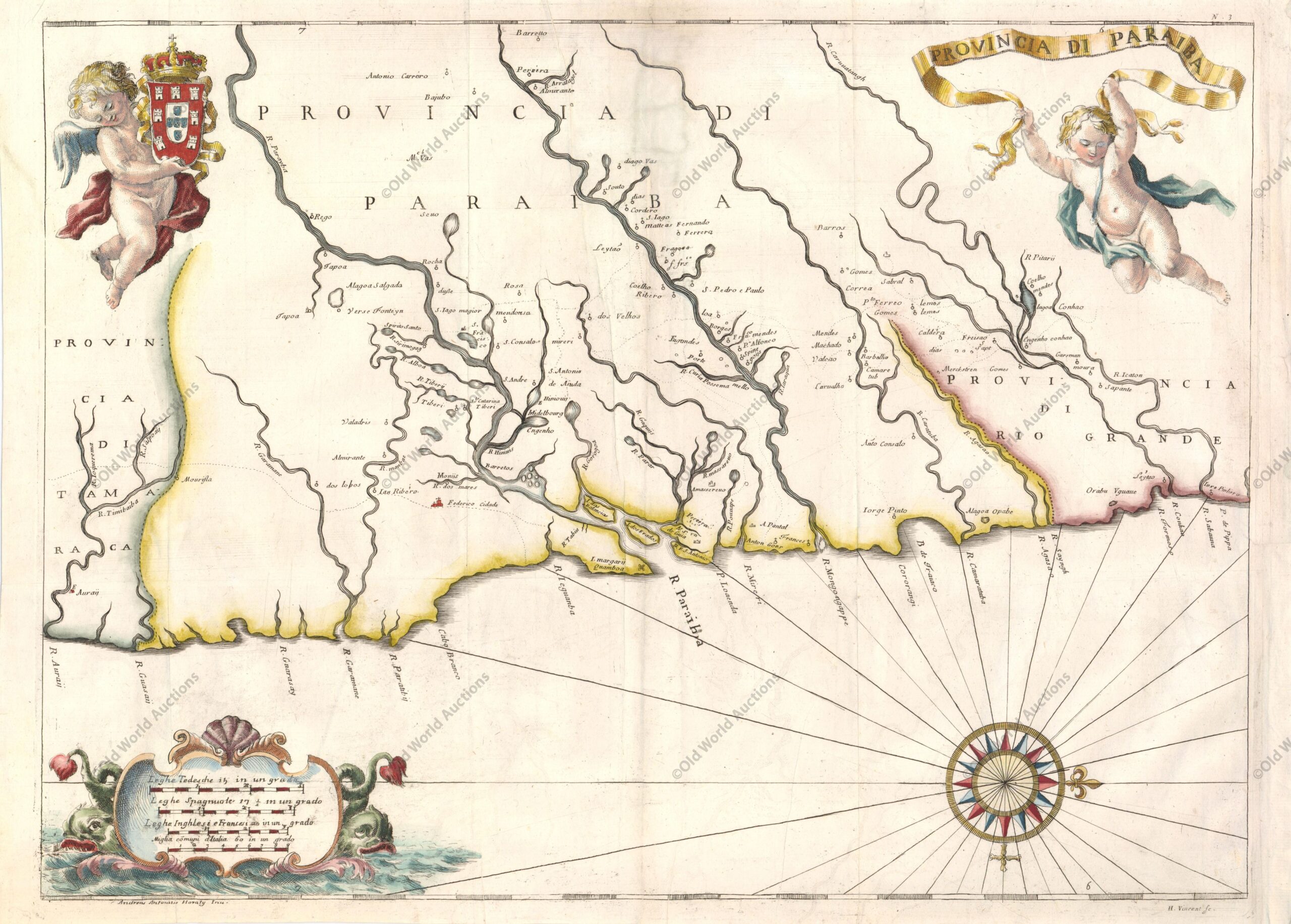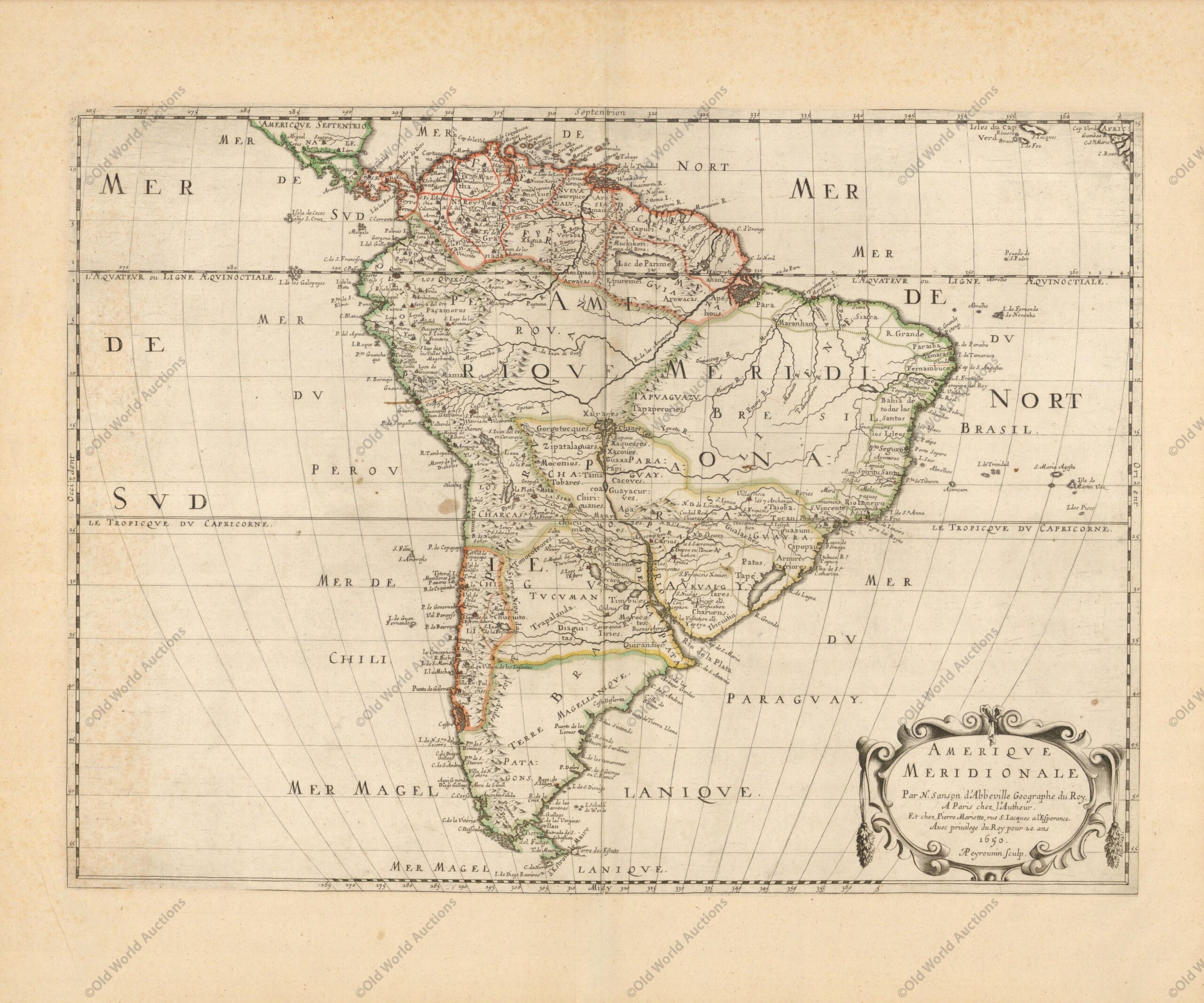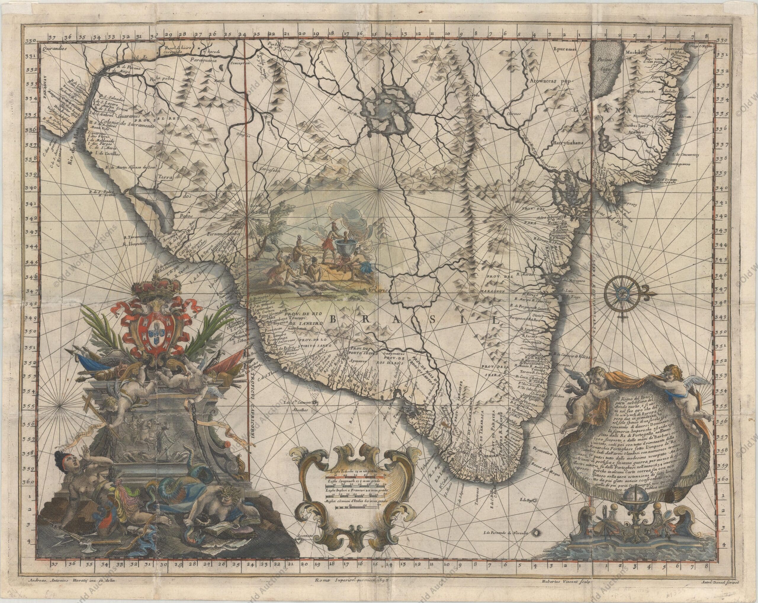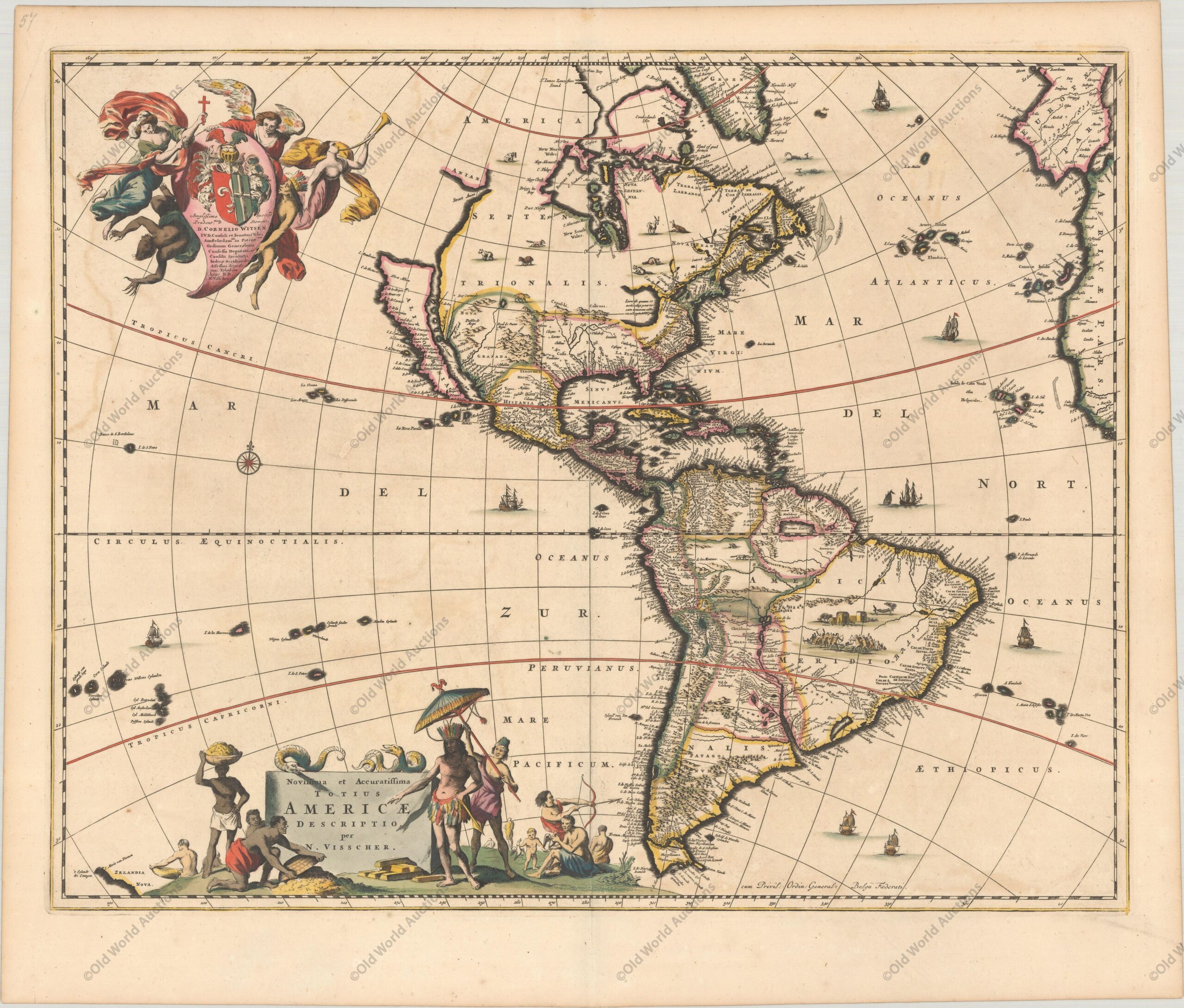 Map of Brazil from 1652 – Beautiful depiction of Brazil with the north oriented to the right by a beautiful compass rose. The map is inset with two regions of Dutch interest in the area; Baja de Todos los Sanctos and Pernambuco. The interior is devoid of geographical information, except for largely imaginary rivers and forests. Instead, the region is full of dramatic scenes of native peoples, including warfare and cannibalism, and some curious wildlife. The hereditary captainships established by the Portuguese are marked along the coast. The decorative title cartouche is flanked by a local family and the seas are decorated with sailing ships, a sea monster and a compass rose. French text on verso, published between 1652-58. “Accuratissima Brasiliae Tabula”, Hondius/Jansson.Map of Brazil divided into fourteen captaincies, 1657 – Map of Brazil divided into fourteen hereditary captaincies, 1657 – This is a reduced version of Sanson’s important map showing the Portuguese possessions in Brazil. The coastal regions were divided by the Portuguese Crown into fourteen captaincies, or hereditary ports. The holders of these grants, called donatários, were responsible for their defence and development. A series of rivers appear in the interior. The mythical Lago de los Xarayes appears on the left, and the unknown interior is conveniently covered by the garlanded title cartouche. Sanson’s small maps of his America in various maps…, first published in 1656 and engraved by A. Peyrounin, were copied several times by various map publishers. Johann David Zunners made copies of Sanson’s maps for his German translation of Die Gantze Erd-Kugel in 1679. Johannes Ribbius and Simon de Vries published copies in 1682 and 1683, with new maps engraved by Antoine d’Winter. The plates were later sold to François Halma, who used them in 1699 and again in 1705, with the titles again engraved in Dutch. The titles on the d’Winter plates were again engraved in French and then used by Nicholas Chemereau in 1715 and Henri du Sauzet in 1738. “Le Bresil, dont la Coste est Possedee par les Portugais, et Divisee en Quatorze Capitaineries…”, Sanson, Nicolas.Map of the Western Hemisphere of 1659 – This is a very rare derivative of the important Hondius map of 1618. The engraver is unknown, although it is a close copy of Picart’s 1644 version, which in turn was derived from Jansson’s 1623 map. North America retains the peninsula of California, and there isn’t much detail along the east coast in the mid-Atlantic region. In the south-west, the famous Seven Cities of Cibola appear on the shores of a large false lake. In South America, the mythical Parime Lacus is shown south of Guyana, and there are two engraved scenes, one showing a cannibal feast and the other a mythical giant from Patagonia. Two stylised insets of the polar regions are placed on strip maps; the North Pole shows Frobisher’s theory of the Northwest Passage, and the South Pole shows the long-held idea of the mythical southern continent. The map is flanked on three sides by carte-a-figure borders depicting Native Americans and their major cities. This map is easily distinguished from Hondius’s map by the fact that the figures on the sides were inverted when copied by the engraver. Unlike Blaeu’s similar map, the towns at the top include three North American towns: the Indian village of Pomeiooc in Virginia, the French fort in Carolina, and St Augustine in Florida.1660 Map of the Western Hemisphere – An unusual and splendidly figured map of the Americas. The map combines many different sources, including Luke Foxe’s model of the island of California. The only reference to the Great Lakes is a small L at the end of the St Lawrence River. Nieu Neder Land occupies the east coast, and there is no mention of any English settlement other than the name Virginia. In South America, a large river and lake system borders Brazil, with the mythical Lake Eupana Lacus. A second mythical lake, Parime Lacus, is shown along the equator. The decoration is taken from van den Keere’s map of 1614. The figures on the sides depict the natives of Virginia, Magellan and Brazil, and the cities at the top include Cusco, Mexico, Olinda, Havana, St Dominique and Cartagena. The map is further embellished with a title card showing a native Indian riding an armadillo and Neptune frolicking in the Pacific with mermaids and seahorses. This is the first state of this map to be issued separately, with the date in the title.Map of South America and Brazil, 1624 – This engraving is part of a remarkable series of publications illustrating voyages of discovery and exploration in various parts of the world. The project was begun by Theodore de Bry of Frankfurt in 1590 and continued for another 54 years. Together they became known as the Grands Voyages (to America and the West Indies) and the Petits Voyages (to the Orient and the East Indies). De Bry died after completing the first six parts of the Grands Voyages. The project was completed first by his widow and two sons, Johann Theodore de Bry and Johann Israel de Bry, and then by his son-in-law, Matthaus Merian, in 1644.Map of Brazil, 1630 – This beautiful map was a collaboration between Hessel Gerritsz, official cartographer of the Dutch East India Company, and Johannes de Laet, director of the newly formed Dutch West India Company. Their maps of South America laid the foundations for many other cartographers. The detail is limited to the coasts and includes the capitanias. The interior is filled with a large title cartouche and distance scales, and the map is further embellished by a compass rose pointing north to the right of the map. “Provincia de Brasil cum Adiacentibus Provinciis”, Gerritsz/De Laet.Map of South America, 1638 – This is an important decorative map of the continent and an essential piece for any South American collection. The coastlines are well detailed, but the interior is full 