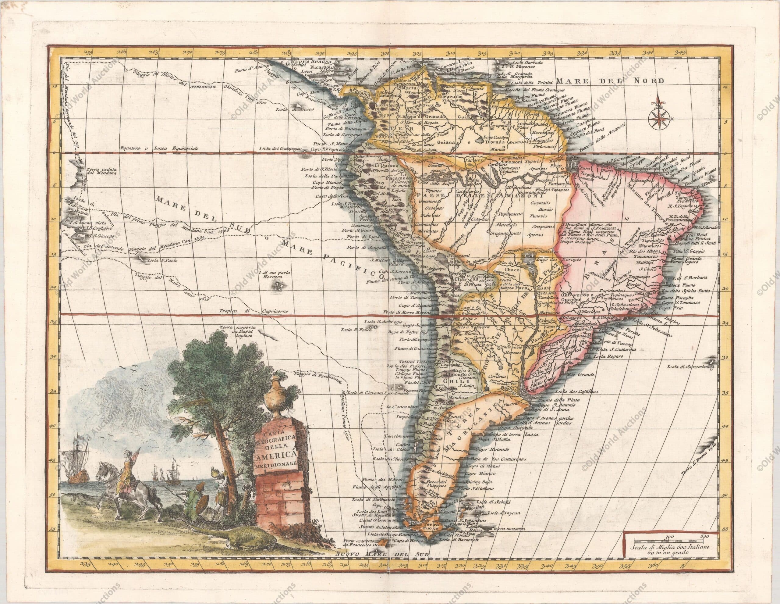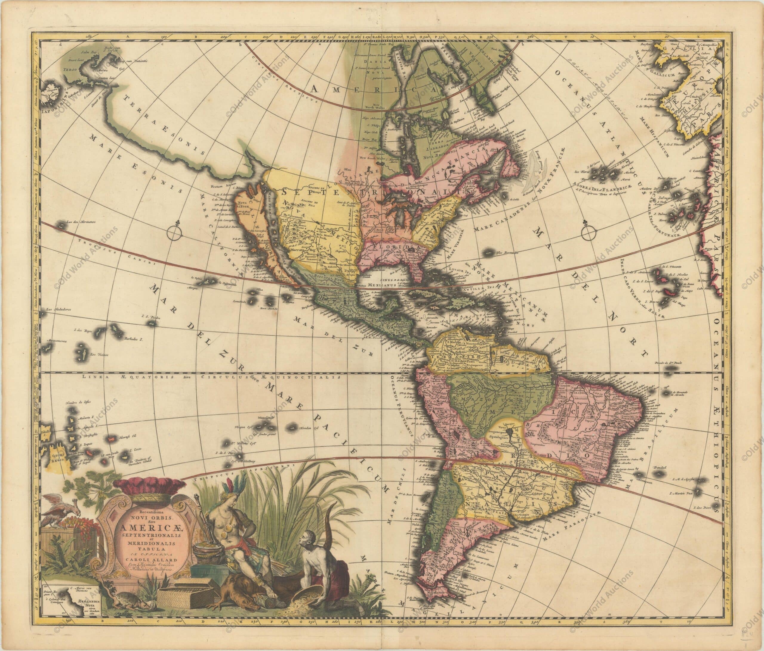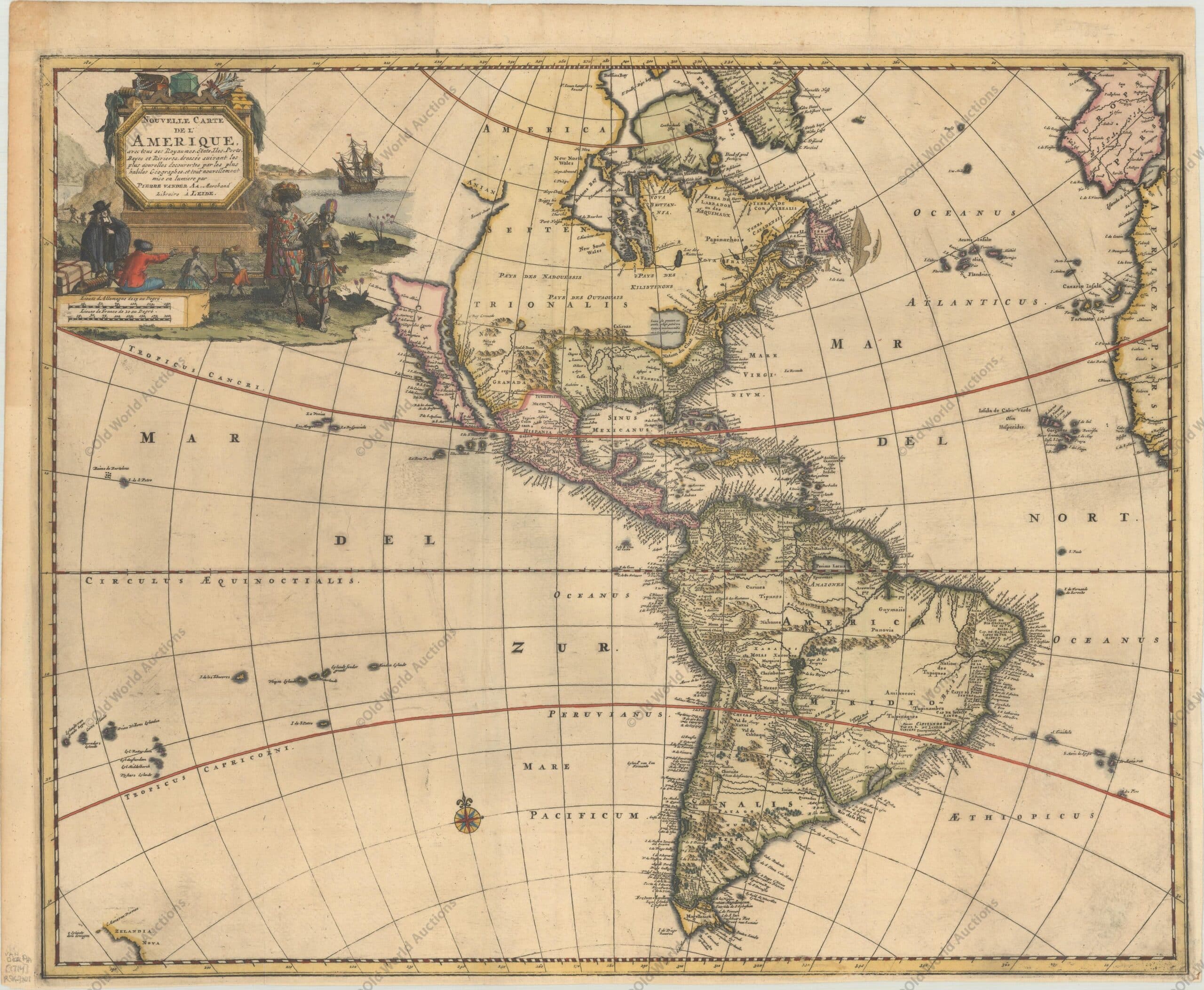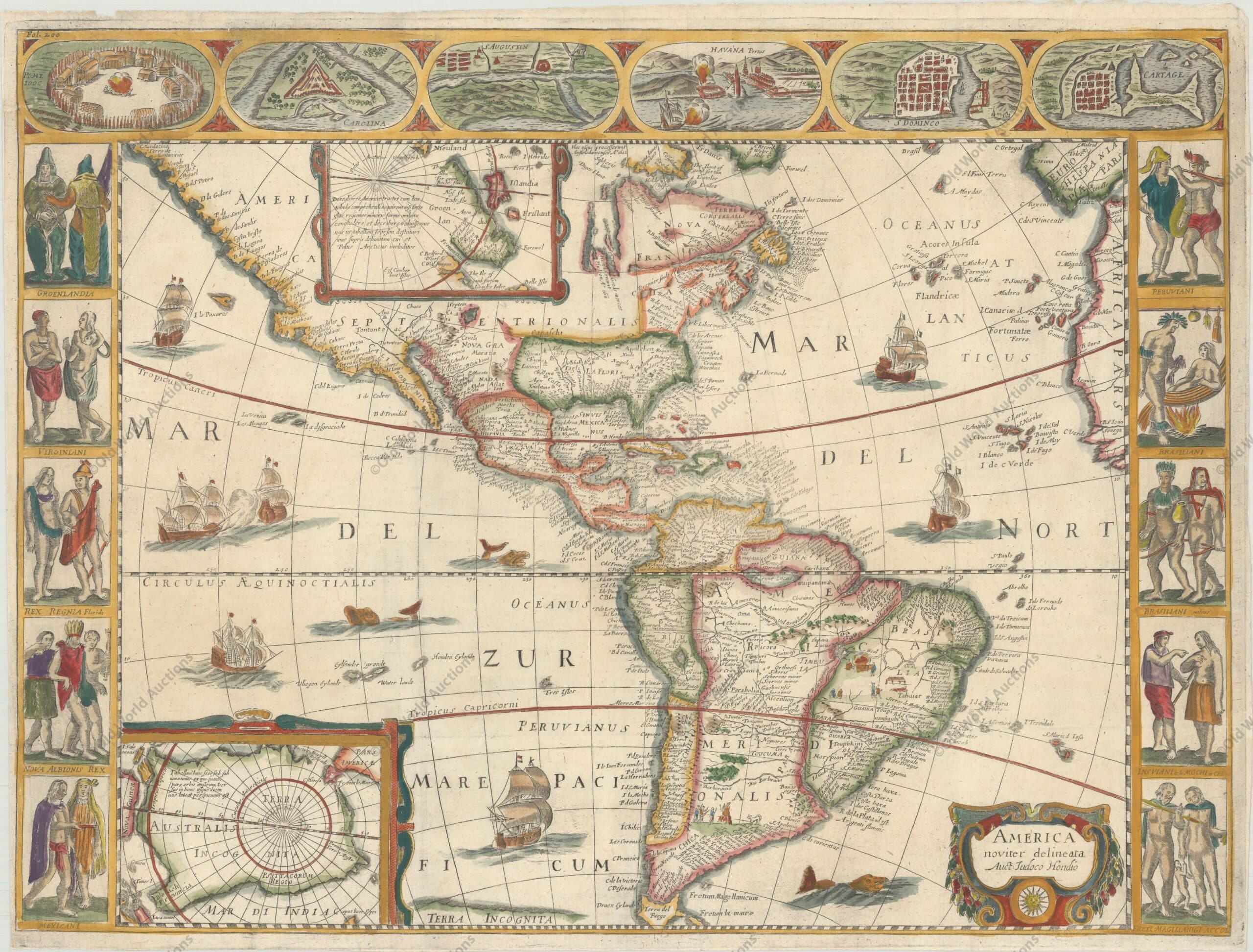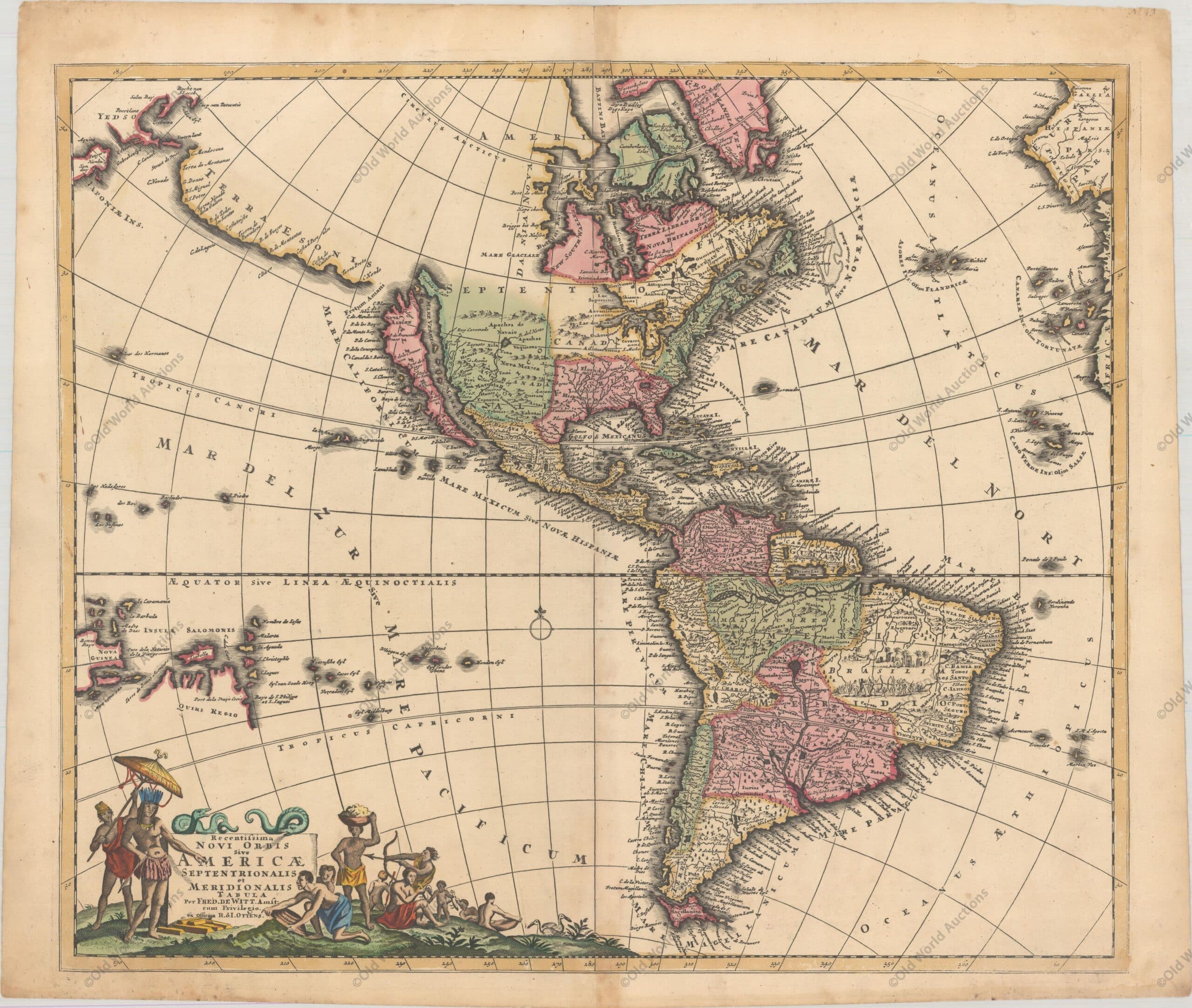 Map of Brazil from 1652 – Beautiful depiction of Brazil with the north oriented to the right by a beautiful compass rose. The map is inset with two regions of Dutch interest in the area; Baja de Todos los Sanctos and Pernambuco. The interior is devoid of geographical information, except for largely imaginary rivers and forests. Instead, the region is full of dramatic scenes of native peoples, including warfare and cannibalism, and some curious wildlife. The hereditary captainships established by the Portuguese are marked along the coast. The decorative title cartouche is flanked by a local family and the seas are decorated with sailing ships, a sea monster and a compass rose. French text on verso, published between 1652-58. “Accuratissima Brasiliae Tabula”, Hondius/Jansson.Map of Brazil divided into fourteen captaincies, 1657 – Map of Brazil divided into fourteen hereditary captaincies, 1657 – This is a reduced version of Sanson’s important map showing the Portuguese possessions in Brazil. The coastal regions were divided by the Portuguese Crown into fourteen captaincies, or hereditary ports. The holders of these grants, called donatários, were responsible for their defence and development. A series of rivers appear in the interior. The mythical Lago de los Xarayes appears on the left, and the unknown interior is conveniently covered by the garlanded title cartouche. Sanson’s small maps of his America in various maps…, first published in 1656 and engraved by A. Peyrounin, were copied several times by various map publishers. Johann David Zunners made copies of Sanson’s maps for his German translation of Die Gantze Erd-Kugel in 1679. Johannes Ribbius and Simon de Vries published copies in 1682 and 1683, with new maps engraved by Antoine d’Winter. The plates were later sold to François Halma, who used them in 1699 and again in 1705, with the titles again engraved in Dutch. The titles on the d’Winter plates were again engraved in French and then used by Nicholas Chemereau in 1715 and Henri du Sauzet in 1738. “Le Bresil, dont la Coste est Possedee par les Portugais, et Divisee en Quatorze Capitaineries…”, Sanson, Nicolas.Map of the Western Hemisphere of 1659 – This is a very rare derivative of the important Hondius map of 1618. The engraver is unknown, although it is a close copy of Picart’s 1644 version, which in turn was derived from Jansson’s 1623 map. North America retains the peninsula of California, and there isn’t much detail along the east coast in the mid-Atlantic region. In the south-west, the famous Seven Cities of Cibola appear on the shores of a large false lake. In South America, the mythical Parime Lacus is shown south of Guyana, and there are two engraved scenes, one showing a cannibal feast and the other a mythical giant from Patagonia. Two stylised insets of the polar regions are placed on strip maps; the North Pole shows Frobisher’s theory of the Northwest Passage, and the South Pole shows the long-held idea of the mythical southern continent. The map is flanked on three sides by carte-a-figure borders depicting Native Americans and their major cities. This map is easily distinguished from Hondius’s map by the fact that the figures on the sides were inverted when copied by the engraver. Unlike Blaeu’s similar map, the towns at the top include three North American towns: the Indian village of Pomeiooc in Virginia, the French fort in Carolina, and St Augustine in Florida.1660 Map of the Western Hemisphere – An unusual and splendidly figured map of the Americas. The map combines many different sources, including Luke Foxe’s model of the island of California. The only reference to the Great Lakes is a small L at the end of the St Lawrence River. Nieu Neder Land occupies the east coast, and there is no mention of any English settlement other than the name Virginia. In South America, a large river and lake system borders Brazil, with the mythical Lake Eupana Lacus. A second mythical lake, Parime Lacus, is shown along the equator. The decoration is taken from van den Keere’s map of 1614. The figures on the sides depict the natives of Virginia, Magellan and Brazil, and the cities at the top include Cusco, Mexico, Olinda, Havana, St Dominique and Cartagena. The map is further embellished with a title card showing a native Indian riding an armadillo and Neptune frolicking in the Pacific with mermaids and seahorses. This is the first state of this map to be issued separately, with the date in the title.Map of South America and Brazil, 1624 – This engraving is part of a remarkable series of publications illustrating voyages of discovery and exploration in various parts of the world. The project was begun by Theodore de Bry of Frankfurt in 1590 and continued for another 54 years. Together they became known as the Grands Voyages (to America and the West Indies) and the Petits Voyages (to the Orient and the East Indies). De Bry died after completing the first six parts of the Grands Voyages. The project was completed first by his widow and two sons, Johann Theodore de Bry and Johann Israel de Bry, and then by his son-in-law, Matthaus Merian, in 1644.Map of Brazil, 1630 – This beautiful map was a collaboration between Hessel Gerritsz, official cartographer of the Dutch East India Company, and Johannes de Laet, director of the newly formed Dutch West India Company. Their maps of South America laid the foundations for many other cartographers. The detail is limited to the coasts and includes the capitanias. The interior is filled with a large title cartouche and distance scales, and the map is further embellished by a compass rose pointing north to the right of the map. “Provincia de Brasil cum Adiacentibus Provinciis”, Gerritsz/De Laet.Map of South America, 1638 – This is an important decorative map of the continent and an essential piece for any South American collection. The coastlines are well detailed, but the interior is full 