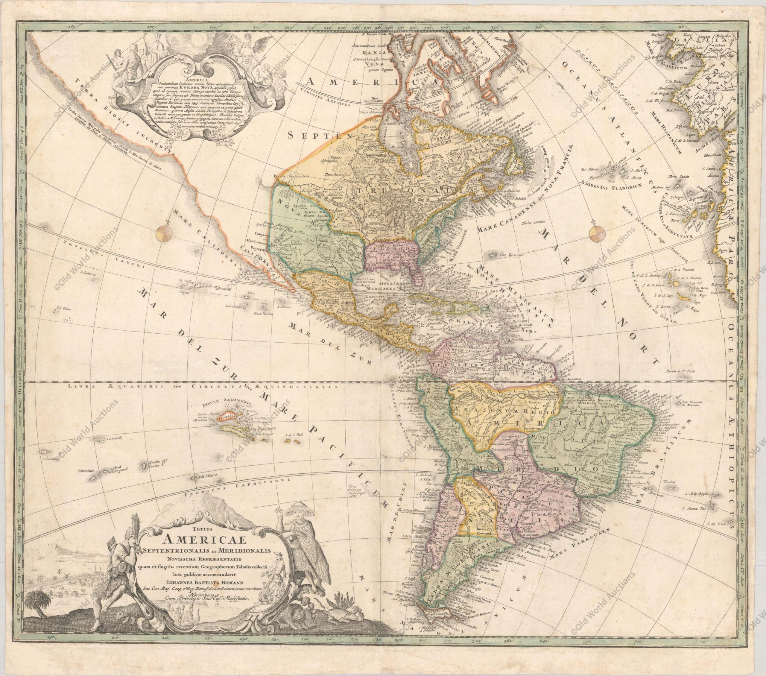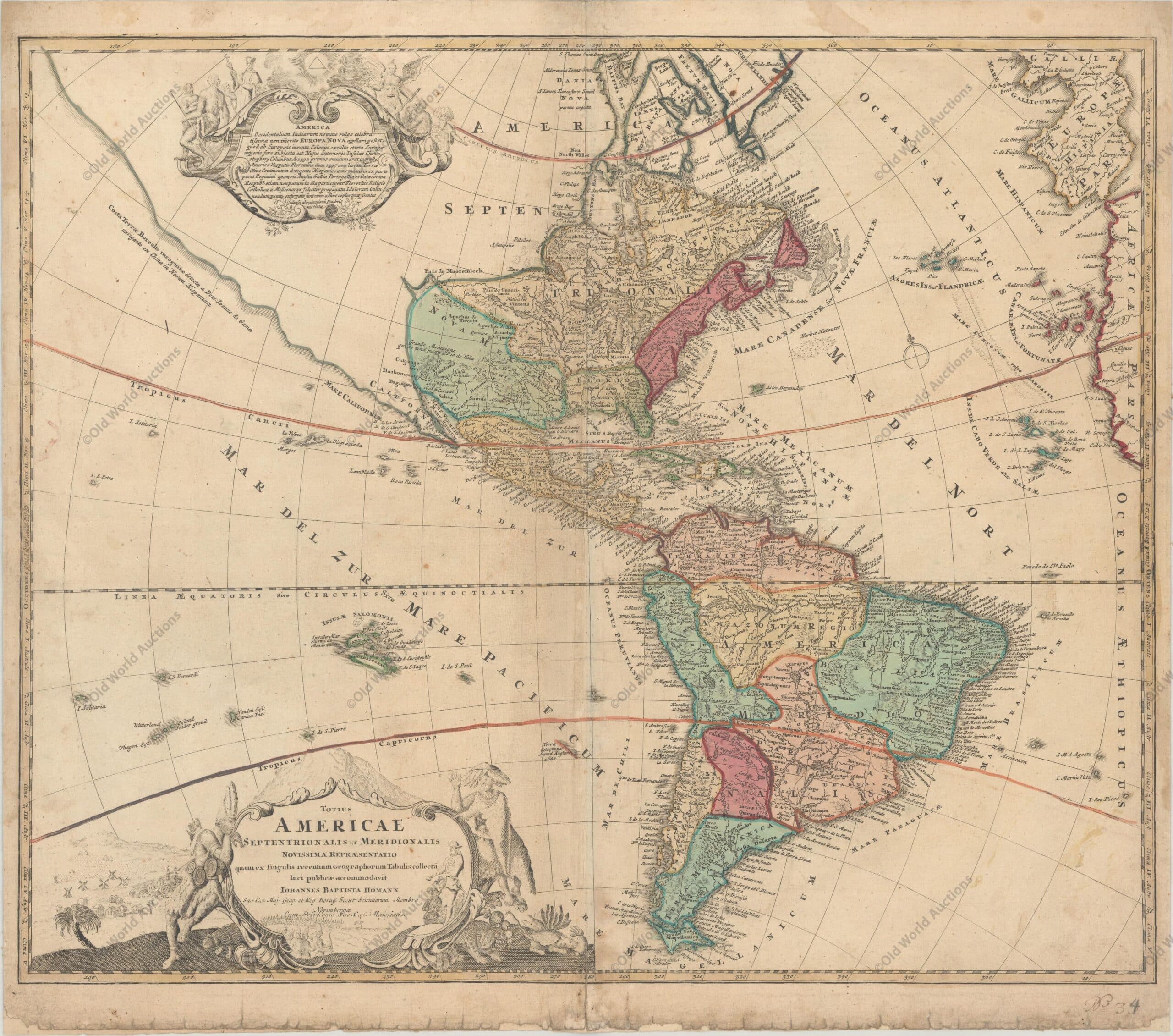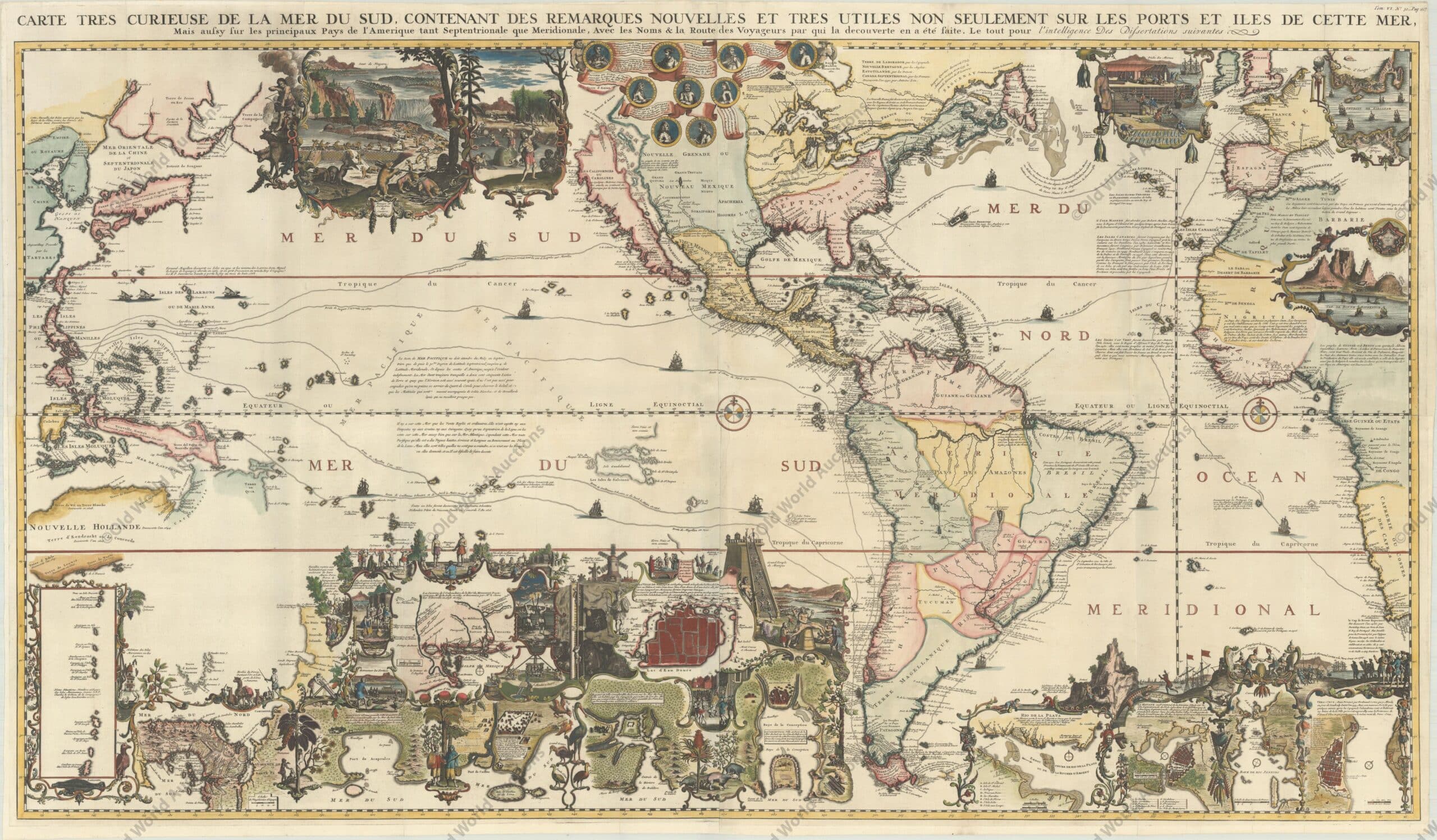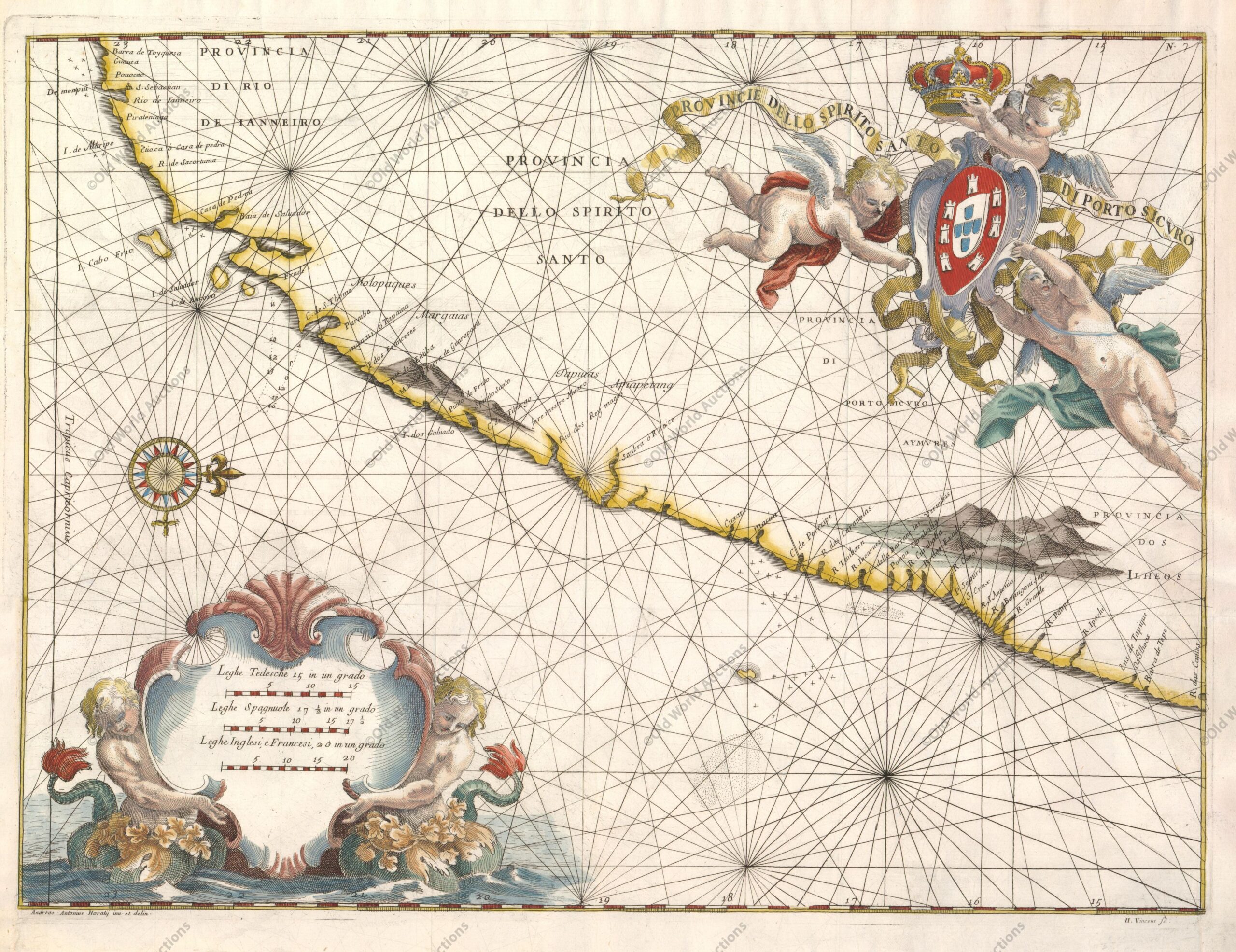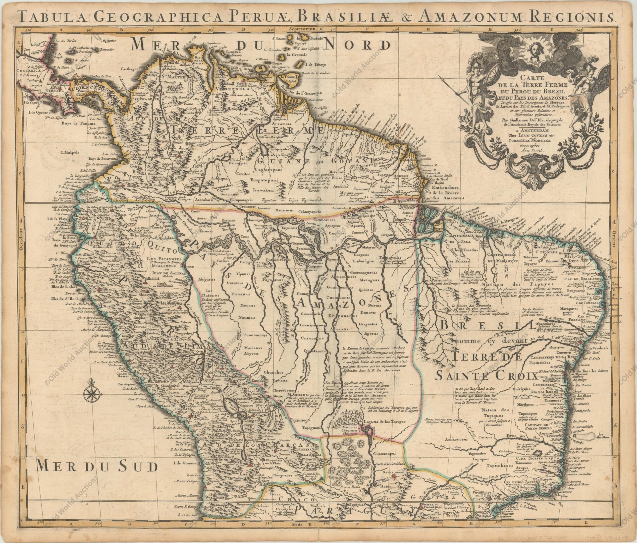 Map of Brazil from 1652 – Beautiful depiction of Brazil with the north oriented to the right by a beautiful compass rose. The map is inset with two regions of Dutch interest in the area; Baja de Todos los Sanctos and Pernambuco. The interior is devoid of geographical information, except for largely imaginary rivers and forests. Instead, the region is full of dramatic scenes of native peoples, including warfare and cannibalism, and some curious wildlife. The hereditary captainships established by the Portuguese are marked along the coast. The decorative title cartouche is flanked by a local family and the seas are decorated with sailing ships, a sea monster and a compass rose. French text on verso, published between 1652-58. “Accuratissima Brasiliae Tabula”, Hondius/Jansson.Map of Brazil divided into fourteen captaincies, 1657 – Map of Brazil divided into fourteen hereditary captaincies, 1657 – This is a reduced version of Sanson’s important map showing the Portuguese possessions in Brazil. The coastal regions were divided by the Portuguese Crown into fourteen captaincies, or hereditary ports. The holders of these grants, called donatários, were responsible for their defence and development. A series of rivers appear in the interior. The mythical Lago de los Xarayes appears on the left, and the unknown interior is conveniently covered by the garlanded title cartouche. Sanson’s small maps of his America in various maps…, first published in 1656 and engraved by A. Peyrounin, were copied several times by various map publishers. Johann David Zunners made copies of Sanson’s maps for his German translation of Die Gantze Erd-Kugel in 1679. Johannes Ribbius and Simon de Vries published copies in 1682 and 1683, with new maps engraved by Antoine d’Winter. The plates were later sold to François Halma, who used them in 1699 and again in 1705, with the titles again engraved in Dutch. The titles on the d’Winter plates were again engraved in French and then used by Nicholas Chemereau in 1715 and Henri du Sauzet in 1738. “Le Bresil, dont la Coste est Possedee par les Portugais, et Divisee en Quatorze Capitaineries…”, Sanson, Nicolas.Map of the Western Hemisphere of 1659 – This is a very rare derivative of the important Hondius map of 1618. The engraver is unknown, although it is a close copy of Picart’s 1644 version, which in turn was derived from Jansson’s 1623 map. North America retains the peninsula of California, and there isn’t much detail along the east coast in the mid-Atlantic region. In the south-west, the famous Seven Cities of Cibola appear on the shores of a large false lake. In South America, the mythical Parime Lacus is shown south of Guyana, and there are two engraved scenes, one showing a cannibal feast and the other a mythical giant from Patagonia. Two stylised insets of the polar regions are placed on strip maps; the North Pole shows Frobisher’s theory of the Northwest Passage, and the South Pole shows the long-held idea of the mythical southern continent. The map is flanked on three sides by carte-a-figure borders depicting Native Americans and their major cities. This map is easily distinguished from Hondius’s map by the fact that the figures on the sides were inverted when copied by the engraver. Unlike Blaeu’s similar map, the towns at the top include three North American towns: the Indian village of Pomeiooc in Virginia, the French fort in Carolina, and St Augustine in Florida.1660 Map of the Western Hemisphere – An unusual and splendidly figured map of the Americas. The map combines many different sources, including Luke Foxe’s model of the island of California. The only reference to the Great Lakes is a small L at the end of the St Lawrence River. Nieu Neder Land occupies the east coast, and there is no mention of any English settlement other than the name Virginia. In South America, a large river and lake system borders Brazil, with the mythical Lake Eupana Lacus. A second mythical lake, Parime Lacus, is shown along the equator. The decoration is taken from van den Keere’s map of 1614. The figures on the sides depict the natives of Virginia, Magellan and Brazil, and the cities at the top include Cusco, Mexico, Olinda, Havana, St Dominique and Cartagena. The map is further embellished with a title card showing a native Indian riding an armadillo and Neptune frolicking in the Pacific with mermaids and seahorses. This is the first state of this map to be issued separately, with the date in the title.Map of South America and Brazil, 1624 – This engraving is part of a remarkable series of publications illustrating voyages of discovery and exploration in various parts of the world. The project was begun by Theodore de Bry of Frankfurt in 1590 and continued for another 54 years. Together they became known as the Grands Voyages (to America and the West Indies) and the Petits Voyages (to the Orient and the East Indies). De Bry died after completing the first six parts of the Grands Voyages. The project was completed first by his widow and two sons, Johann Theodore de Bry and Johann Israel de Bry, and then by his son-in-law, Matthaus Merian, in 1644.Map of Brazil, 1630 – This beautiful map was a collaboration between Hessel Gerritsz, official cartographer of the Dutch East India Company, and Johannes de Laet, director of the newly formed Dutch West India Company. Their maps of South America laid the foundations for many other cartographers. The detail is limited to the coasts and includes the capitanias. The interior is filled with a large title cartouche and distance scales, and the map is further embellished by a compass rose pointing north to the right of the map. “Provincia de Brasil cum Adiacentibus Provinciis”, Gerritsz/De Laet.Map of South America, 1638 – This is an important decorative map of the continent and an essential piece for any South American collection. The coastlines are well detailed, but the interior is full 