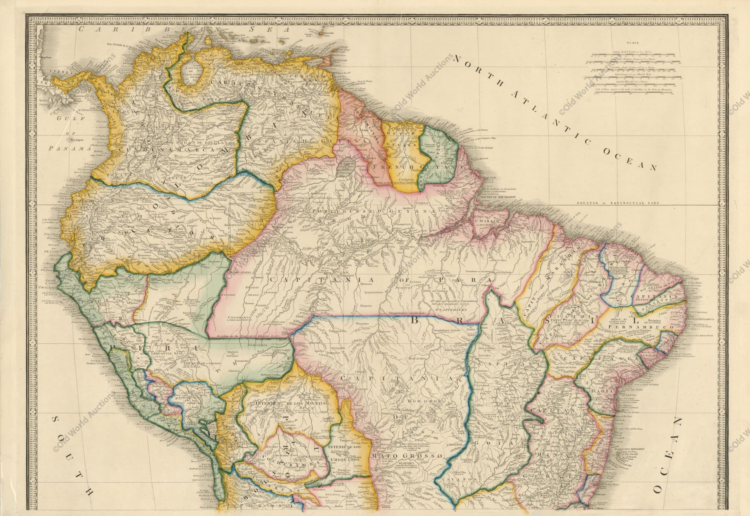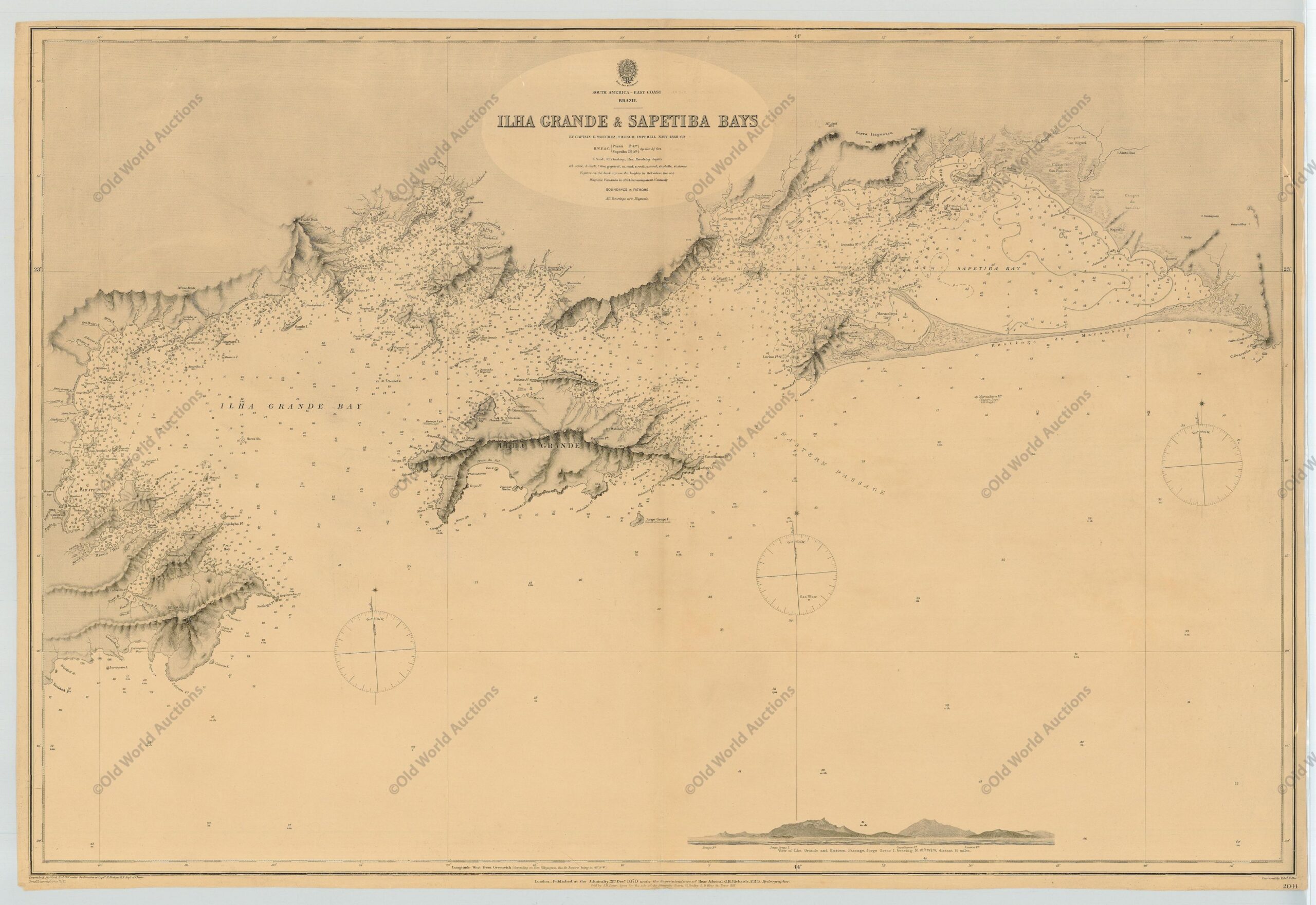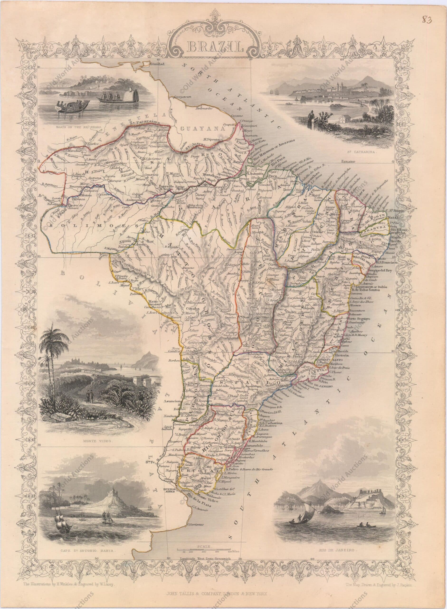 Map of the Bay of All Saints 1769 – This is a boldly engraved map of the Bay of Salvador (Bahia) with an inset plan of the fortified city of Salvador. Inlets and shoals are shown in the bay. Numerous plantations and sugar mills are shown with symbols along the coast and rivers. There is a large decorative rococo title cartouche and two wind roses. “Kaart van de Aller-Heiligen Baay waar aan de Hoofdstad legt van Brazil”, Tirion, Isaac.Map of Santa Catalina Island 1777 – This is a rare Spanish map of the island of Santa Catalina, now the city of Florianópolis and an important tourist destination. It shows the unspoilt island with a few small villages and several sheltered anchorages. A coastal approach is shown at the top. “Plan de la Isla y Puerto de Santa Catalina situado en la America Meridional”, Lopez, D. Tomas.Map of Brazil 1798 – This is an unusual Italian map of Brazil, Paraguay and Uruguay. It extends to the outskirts of Buenos Aires. It shows a great deal of detail, including extensive river systems. The large landscape title cartouche shows Indians tending a fire. “Il Brasile ed il Paese delle Amazzoni col Paraguai Delineati sulle Ultime Osservazioni”, Cassini, Giovanni Maria.1823 Map of Brazil1832 Map of Brazil1840 Map of South America – Part 1 – This impressive large map is taken from Louis Stanislas D’Arcy Delarochette’s monumental eight-sheet map of South America, which was used to settle countless boundary disputes across the continent. It contains the most up-to-date geographical information and many interesting annotations. Three insets at the bottom of the map present data from Humboldt’s report in the form of topographic profiles: “Section of the Andes…”, “Section of South America from West to East…”, and “Section of the road from La Guayra to Caracas”. Also includes a comparative table of distances and an index entitled “Civil divisions, population and extension” for Colombia, Peru, the United Provinces, Chile, Patagonia, Brazil and Guyana. Printed on two sheets, not joined as issued – the map would measure 30 x 42.5″ if joined. “Colombia Prima or South America”, Wyld, James.1840 Map of South America – Part 2 – This impressive large map is taken from Louis Stanislas D’Arcy Delarochette’s monumental eight-sheet map of South America, which was used to settle many of the continent’s boundary disputes. It contains the most up-to-date geographical information and many interesting annotations. Three insets at the bottom of the map present data from Humboldt’s report in the form of topographic profiles: “Section of the Andes…”, “Section of South America from West to East…”, and “Section of the road from La Guayra to Caracas”. Also includes a comparative table of distances and an index entitled “Civil divisions, population and extension” for Colombia, Peru, the United Provinces, Chile, Patagonia, Brazil and Guyana. Printed on two sheets, not joined as issued – the map would measure 30 x 42.5″ if joined. “Colombia Prima or South America”, Wyld, James.Map of Brazil from 1850Large scale marine chart of the region west of Rio de Janeiro from 1884 – Beautiful large scale marine chart of the region west of Rio de Janeiro. Complete with soundings, anchorages and navigational hazards. In the background is a view of Ilha Grande and the East Passage. The map was first drawn by Captain Mouchez of the French Imperial Navy in 1868-69 and published by the British Admiralty in 1870. This map has been updated for 1884.