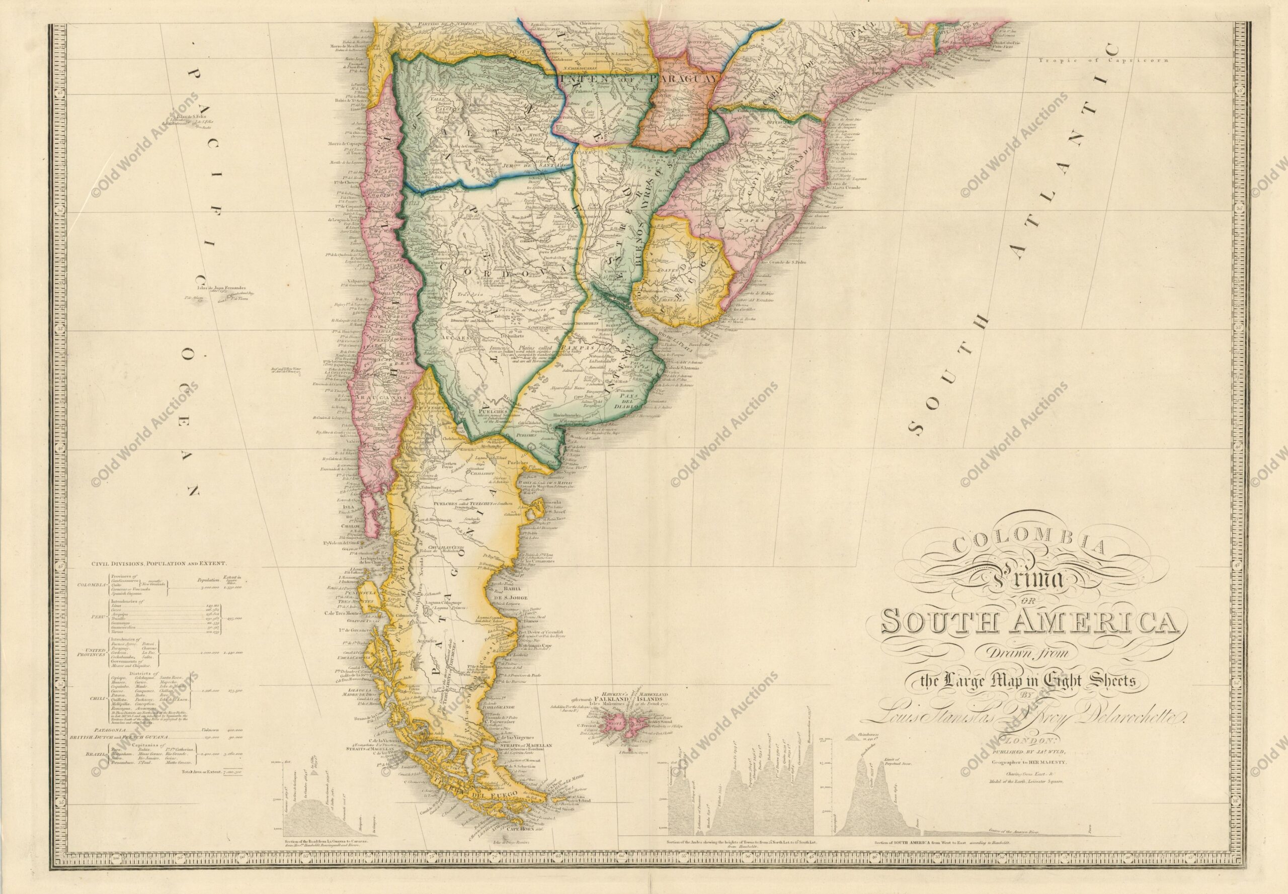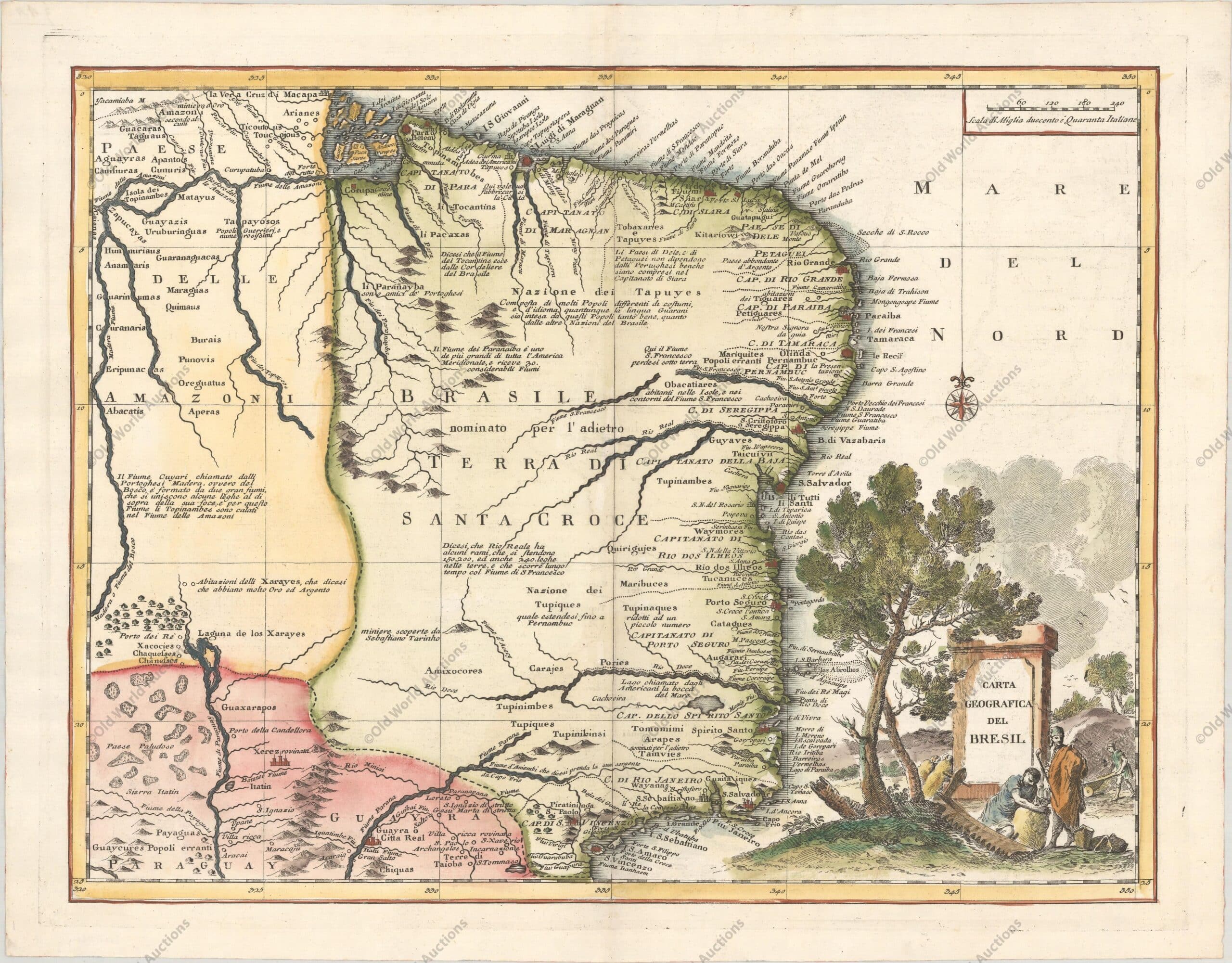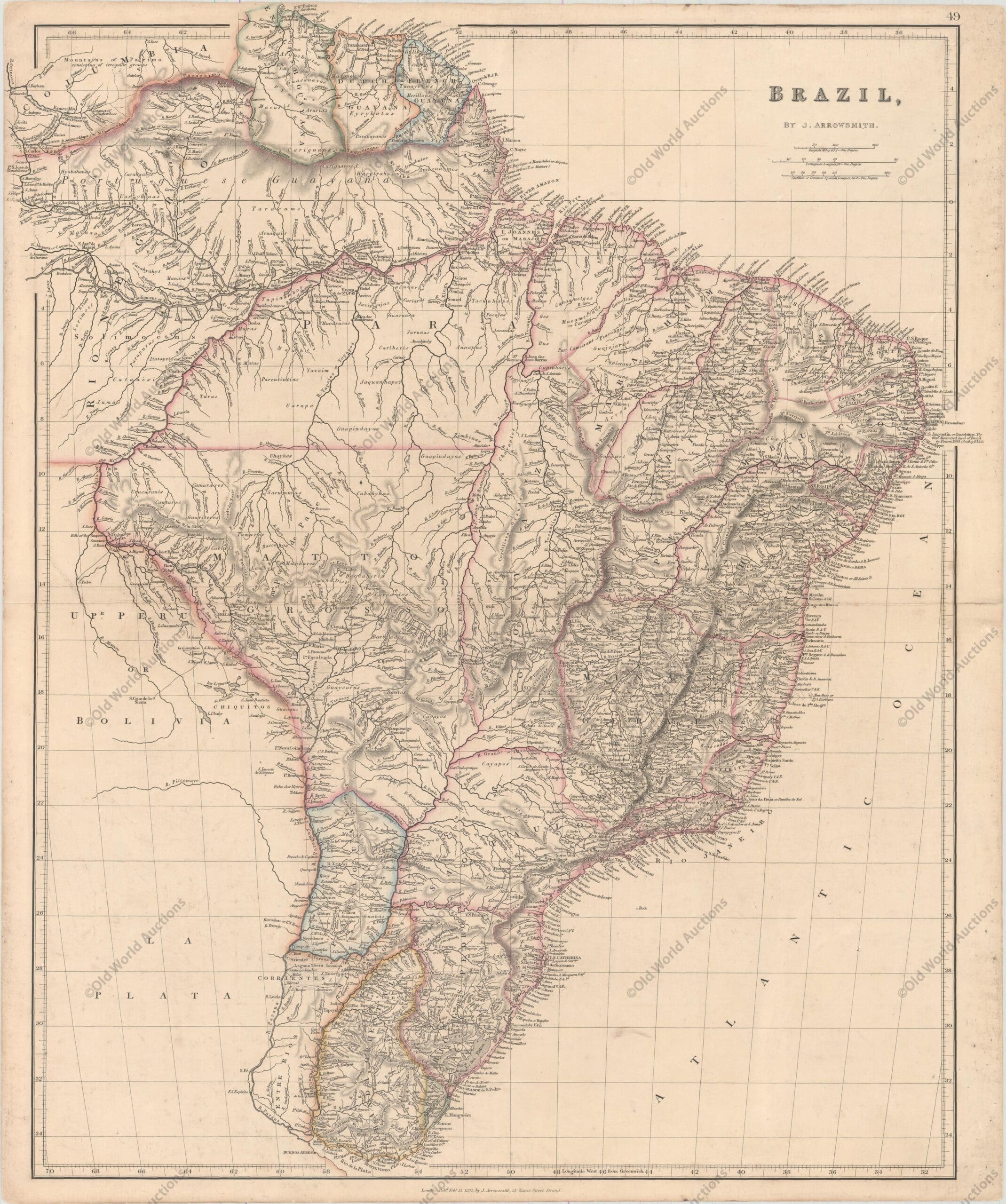 Map of the Bay of All Saints 1769 – This is a boldly engraved map of the Bay of Salvador (Bahia) with an inset plan of the fortified city of Salvador. Inlets and shoals are shown in the bay. Numerous plantations and sugar mills are shown with symbols along the coast and rivers. There is a large decorative rococo title cartouche and two wind roses. “Kaart van de Aller-Heiligen Baay waar aan de Hoofdstad legt van Brazil”, Tirion, Isaac.Map of Santa Catalina Island 1777 – This is a rare Spanish map of the island of Santa Catalina, now the city of Florianópolis and an important tourist destination. It shows the unspoilt island with a few small villages and several sheltered anchorages. A coastal approach is shown at the top. “Plan de la Isla y Puerto de Santa Catalina situado en la America Meridional”, Lopez, D. Tomas.Map of Brazil 1798 – This is an unusual Italian map of Brazil, Paraguay and Uruguay. It extends to the outskirts of Buenos Aires. It shows a great deal of detail, including extensive river systems. The large landscape title cartouche shows Indians tending a fire. “Il Brasile ed il Paese delle Amazzoni col Paraguai Delineati sulle Ultime Osservazioni”, Cassini, Giovanni Maria.1823 Map of Brazil1832 Map of Brazil1840 Map of South America – Part 1 – This impressive large map is taken from Louis Stanislas D’Arcy Delarochette’s monumental eight-sheet map of South America, which was used to settle countless boundary disputes across the continent. It contains the most up-to-date geographical information and many interesting annotations. Three insets at the bottom of the map present data from Humboldt’s report in the form of topographic profiles: “Section of the Andes…”, “Section of South America from West to East…”, and “Section of the road from La Guayra to Caracas”. Also includes a comparative table of distances and an index entitled “Civil divisions, population and extension” for Colombia, Peru, the United Provinces, Chile, Patagonia, Brazil and Guyana. Printed on two sheets, not joined as issued – the map would measure 30 x 42.5″ if joined. “Colombia Prima or South America”, Wyld, James.1840 Map of South America – Part 2 – This impressive large map is taken from Louis Stanislas D’Arcy Delarochette’s monumental eight-sheet map of South America, which was used to settle many of the continent’s boundary disputes. It contains the most up-to-date geographical information and many interesting annotations. Three insets at the bottom of the map present data from Humboldt’s report in the form of topographic profiles: “Section of the Andes…”, “Section of South America from West to East…”, and “Section of the road from La Guayra to Caracas”. Also includes a comparative table of distances and an index entitled “Civil divisions, population and extension” for Colombia, Peru, the United Provinces, Chile, Patagonia, Brazil and Guyana. Printed on two sheets, not joined as issued – the map would measure 30 x 42.5″ if joined. “Colombia Prima or South America”, Wyld, James.Map of Brazil from 1850Large scale marine chart of the region west of Rio de Janeiro from 1884 – Beautiful large scale marine chart of the region west of Rio de Janeiro. Complete with soundings, anchorages and navigational hazards. In the background is a view of Ilha Grande and the East Passage. The map was first drawn by Captain Mouchez of the French Imperial Navy in 1868-69 and published by the British Admiralty in 1870. This map has been updated for 1884.