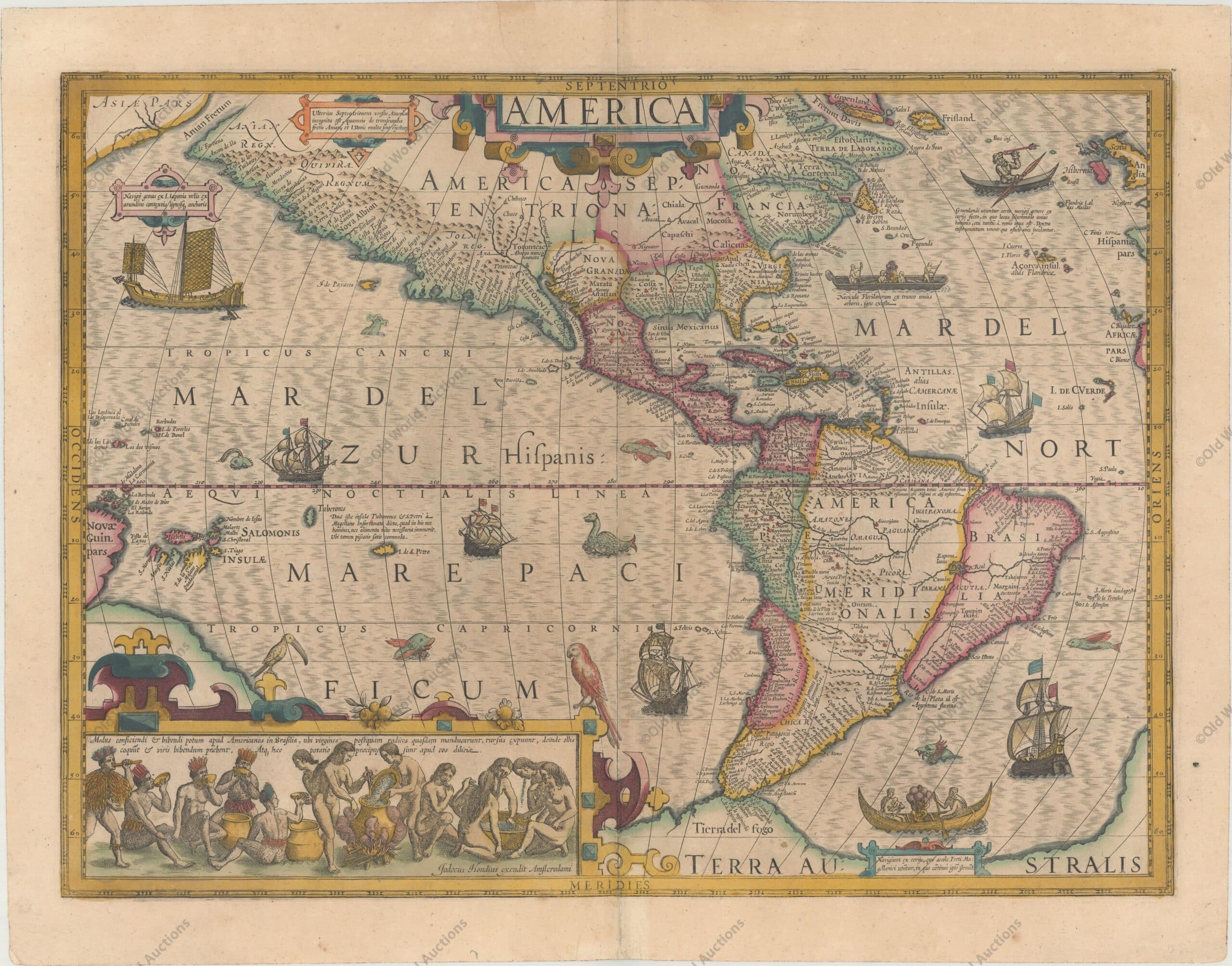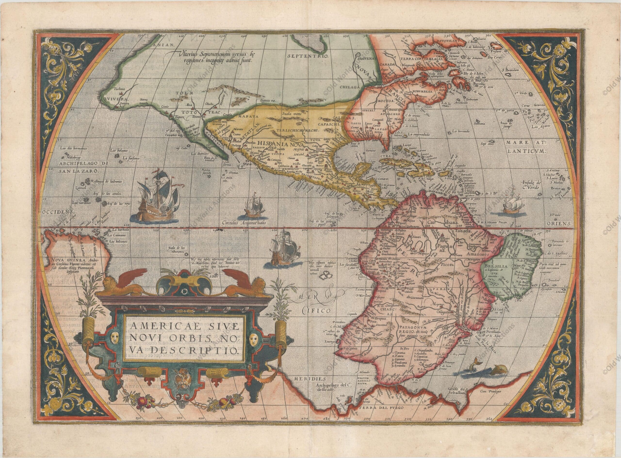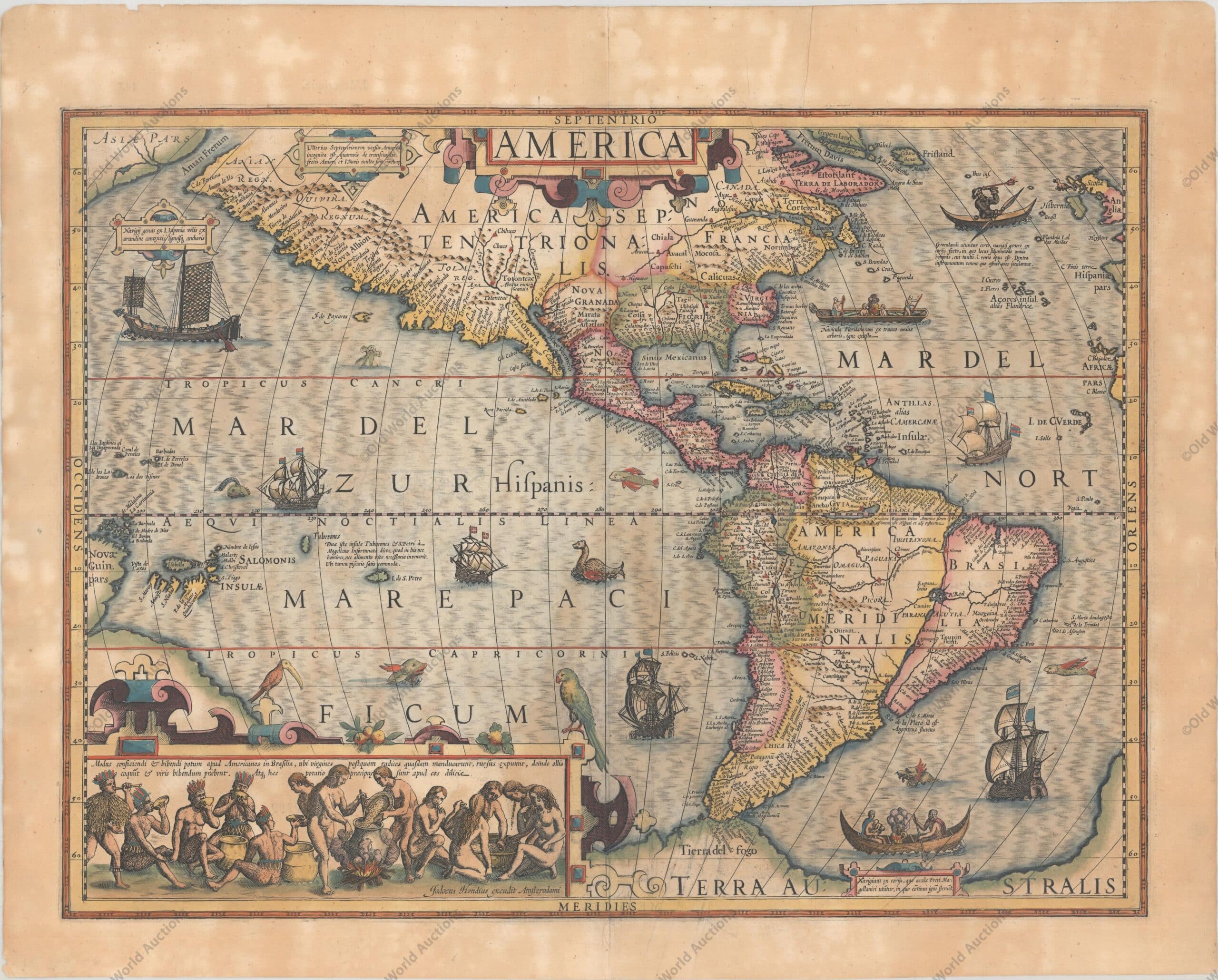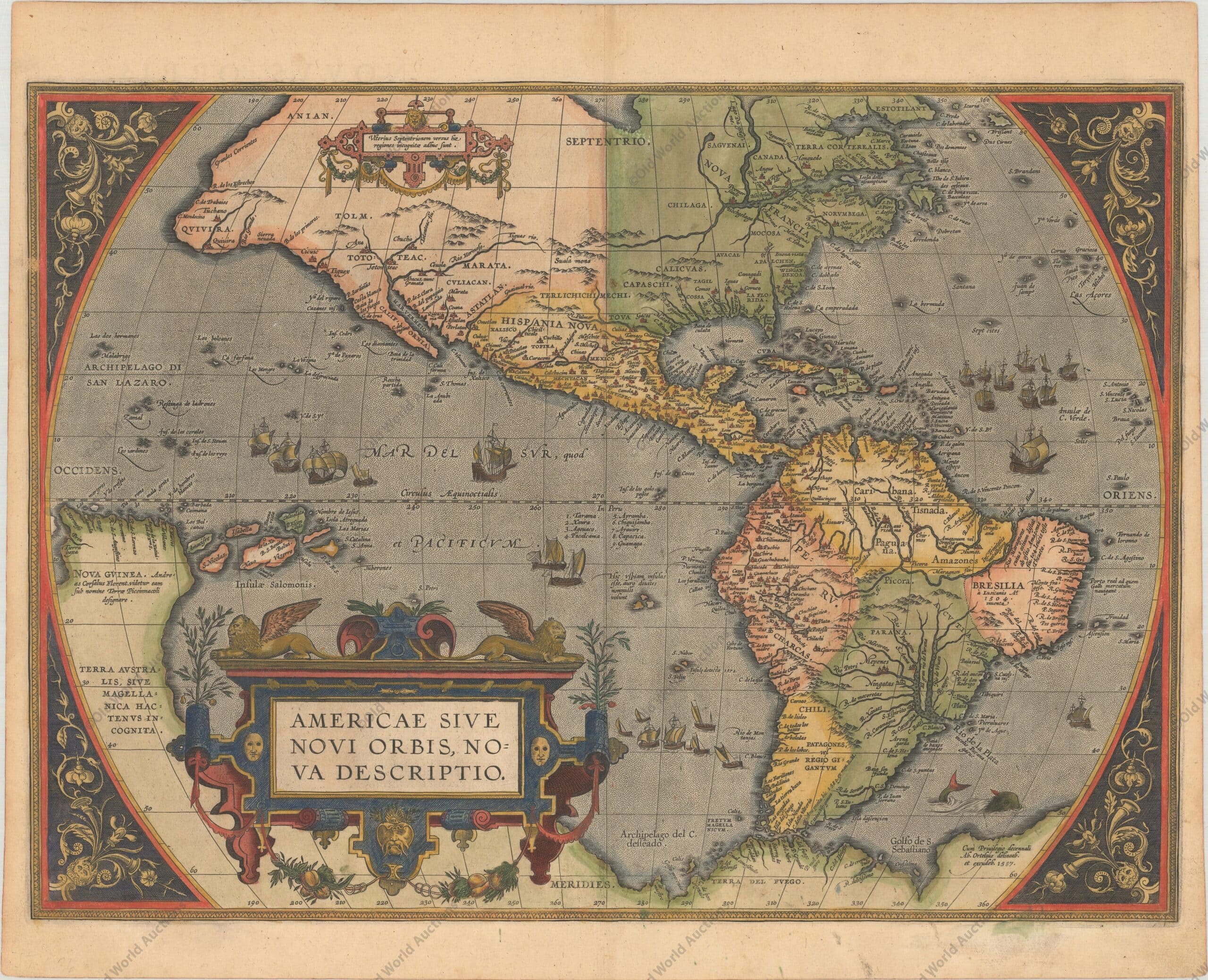 Map of the Western Hemisphere, 1550 – Sebastian Munster (1489 – 1552) was one of the three most famous cartographers of the 16th century, along with Mercator and Ortelius. Munster’s Geographia and Cosmographia Universalis were two of the most widely read and influential books of the time. His editions of Ptolemy’s Geographia, published between 1540 and 1552, were illustrated with 48 woodcut maps, the standard 27 Ptolemaic maps supplemented by 21 new maps. These new maps included a separate map of each of the known continents and marked the development of regional cartography in central Europe. The Ancient Geography was a prelude to Münster’s major work, the Cosmographia, which was published in six languages in nearly 30 editions between 1544 and 1578, and then revised and re-edited by Sebastian Petri between 1588 and 1628. The Cosmographia was a geographical reference as well as a historical and ethnographic description of the world. It included the maps of the Geographia, plus additional regional maps and city views, with nearly 500 illustrations, making it one of the most popular pictorial encyclopaedias of the 16th century. This map of the New World is often credited with popularising the name America due to the popularity of Munster’s Cosmographia and the numerous editions published in the 16th century. The influence of Marco Polo’s explorations of Asia in the 13th century is evident in the 7,448 islands of the North Pacific and Zipangri (Japan) shown off the west coast of North America. The North American continent has a very strange shape, with no Californian land mass and the eastern region almost split by a body of water known as the Verrazzano Sea. Yucatan is still shown as an island, Cozumel is called Cozumela, and Lake Temistitan (unnamed in the state) is connected to the Gulf of Mexico. South America has a large bulge on the west coast, the Amazon River is very short, and cannibals inhabit the continent, shown as Canibali next to a gruesome vignette of human limbs. The map is very decorative, with Magellan’s surviving ship Victoria appearing in the Pacific. The flags of Spain and Portugal represent their respective spheres of influence in the New World. This is the 5th state by Burden and the 4th state by Kershaw, with place names Temistitan in Mexico and Insula Atlantica in South America.Map of Brazil 1554 – This fascinating pictorial map is one of the first regional maps of Brazil available. Illustrated with north to the right, the map is filled with vignettes depicting native life rather than focusing on geographical information. Indians are shown with bows and arrows, axes, llamas and hammocks, for which Brazilians are well known. The surrounding ocean is filled with French and Portuguese ships and sea monsters. Along the coast, Europeans are shown interacting with the natives. The limited geographical information is rather inaccurate. The Amazon River (here called the Maranon F.) and the Paraná River originate from lakes near an erupting volcano. Mountains and false rivers fill the western part of Brazil, labelled Terra non Descobrirta (undiscovered land). This woodcut map is from the first block published in 1554, which was destroyed by a fire in 1557 at the printing works of Thomaso Guinti. A second block was cut in 1565, with the notable difference that Descoperta is written at the top centre instead of Discoperta. The second block was used again in 1606 and can be distinguished from the previous print by the appearance of woodworm damage on the block. Many of the blocks in the 1554 edition of Ramusio’s Delle Navigationi Et Viaggi were made by the great Venetian cartographer Giacomo Gastaldi. “Brazil, Ramusio, Giovanni Battista.Map of the Western Hemisphere, 1581 – This is one of the most famous maps of the Americas and had a major influence on future cartography of the New World. The map is largely based on Gerard Mercator’s large multi-sheet world map of 1569. The most recognisable features of the map are the bulbous Chilean coastline and the exaggerated width of the North American continent. In North America, the long St Lawrence River crosses the continent to almost meet the fictitious Tiguas River flowing to the west. The strategically placed title cartouche hides the unknown South Pacific and thus most of the supposed great southern continent, which is shown attached to New Guinea and Tierra del Fuego. This map is from the second copper plate containing the same geography as the first [1570]. On this plate, the largest ship in the Pacific is now sailing east and away from the viewer. Religious persecution forced Ortelius to leave Antwerp and there was a four-year hiatus in the publication of the Theatrum. When he re-established himself in Liège, he used Christopher Plantin’s large printing press to resume publication with several revised plates. This plate had a relatively short life of only 8 years, being replaced in 1587 by the easily distinguishable plate of the revised South American form.Map of the Western Hemisphere, 1587 – This is one of the most famous maps of the Americas and had a huge influence on future cartography of the New World. Engraved by Frans Hogenberg, it is largely based on Gerard Mercator’s great multi-sheet world map of 1569. The map shows an exaggerated extension of the North American continent, with the long St Lawrence River crossing the continent to almost meet the fictitious Tiguas River flowing westwards. The strategically placed title card hides the unknown South Pacific and thus most of the supposed great southern continent, which is shown attached to New Guinea and Tierra del Fuego. This is the third plate of the Americas used by Ortelius, as evidenced by the removal of the bulge on the south-west coast of South America and the addition of a cartouche in North America. Also on this plate, the Solomon Islands are mentioned for the first time since their discovery in 1568, and the names California