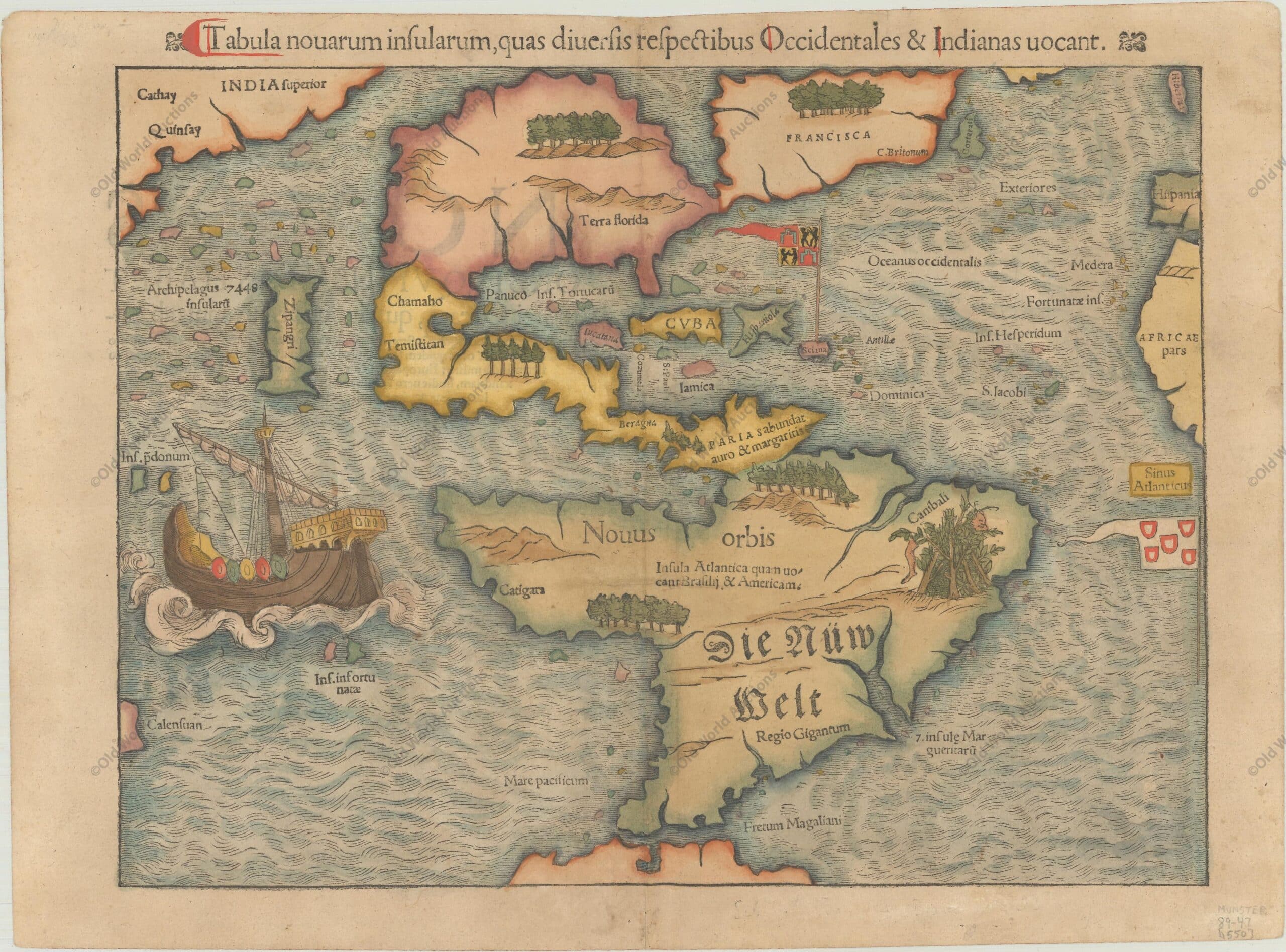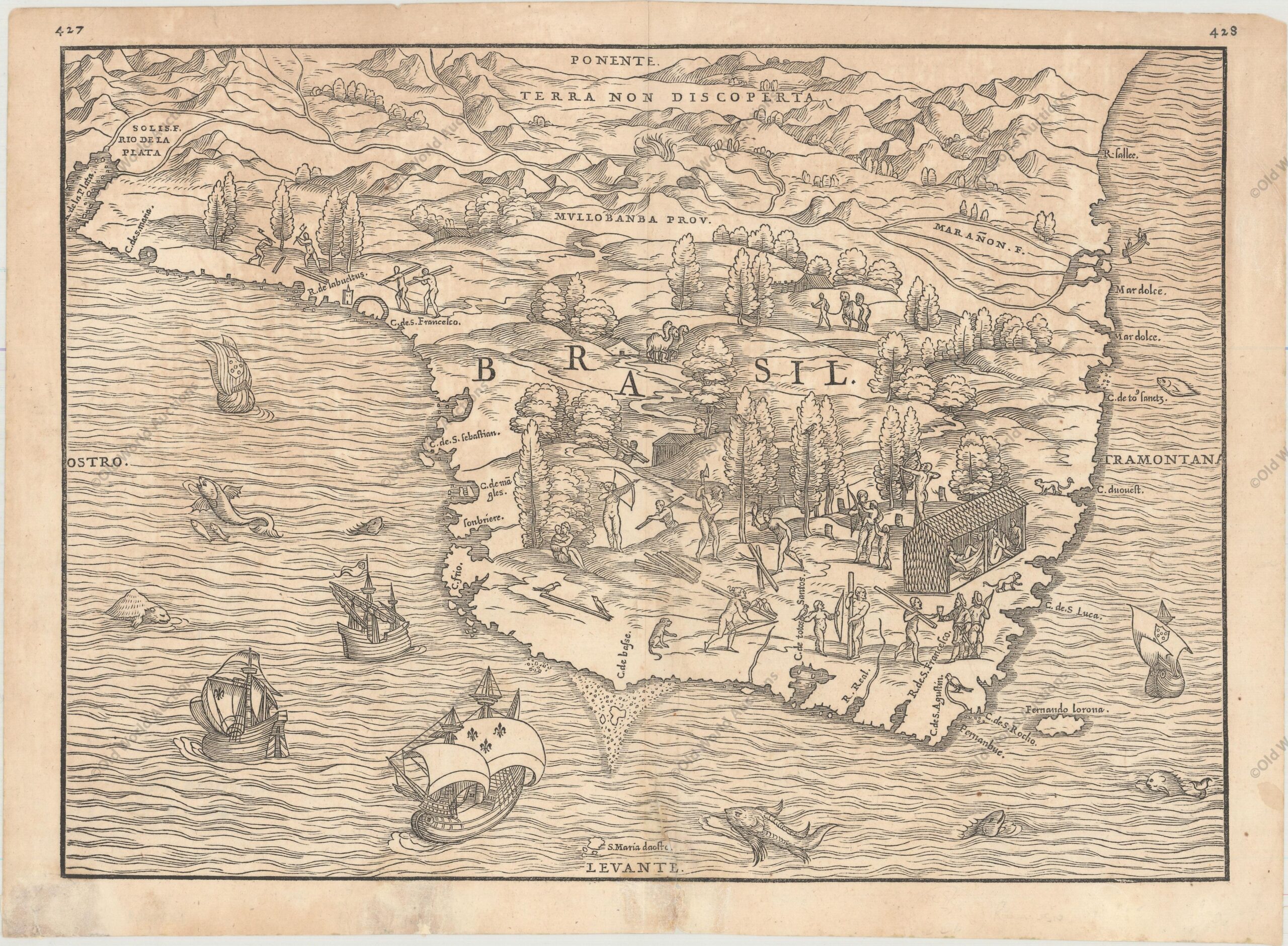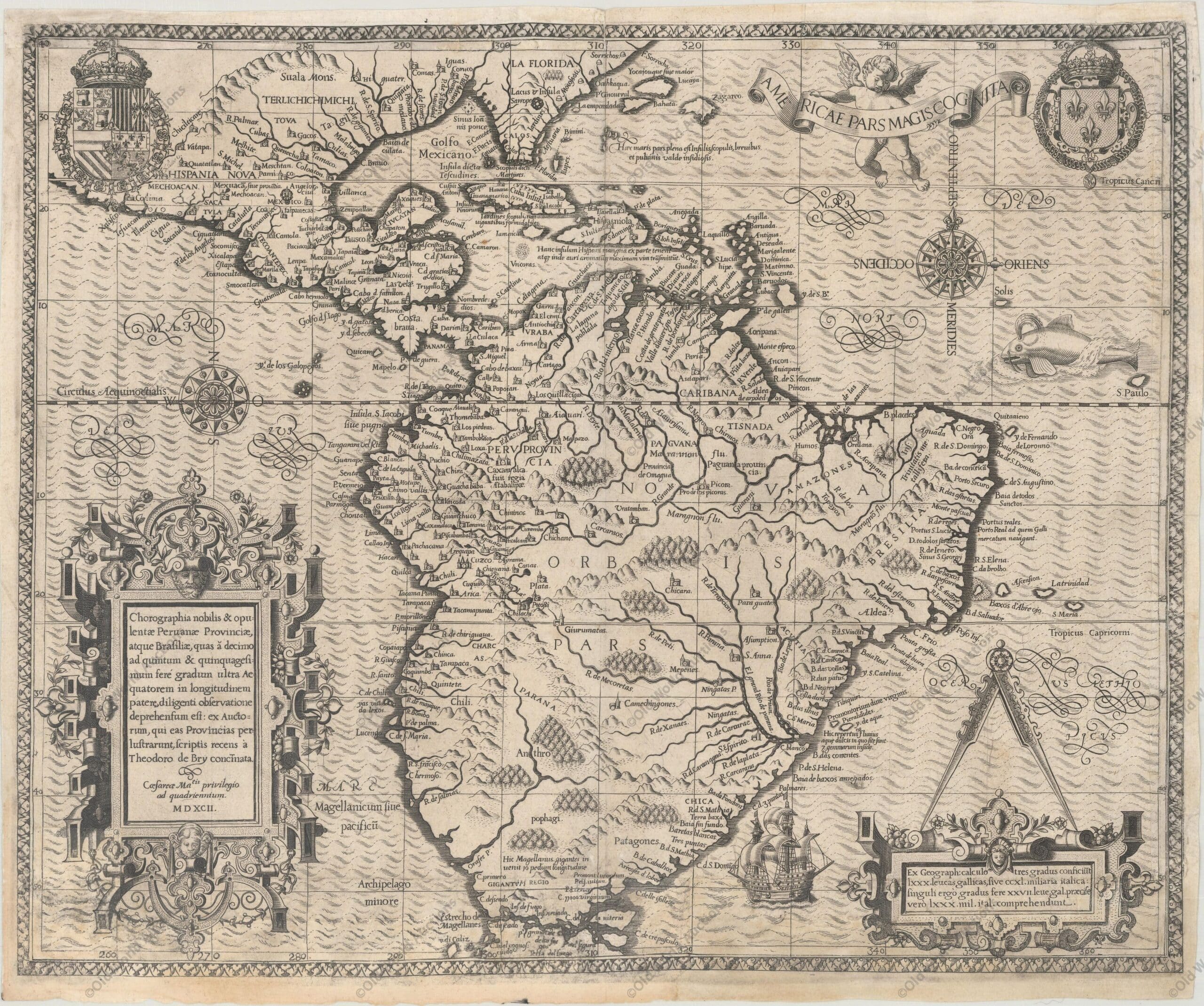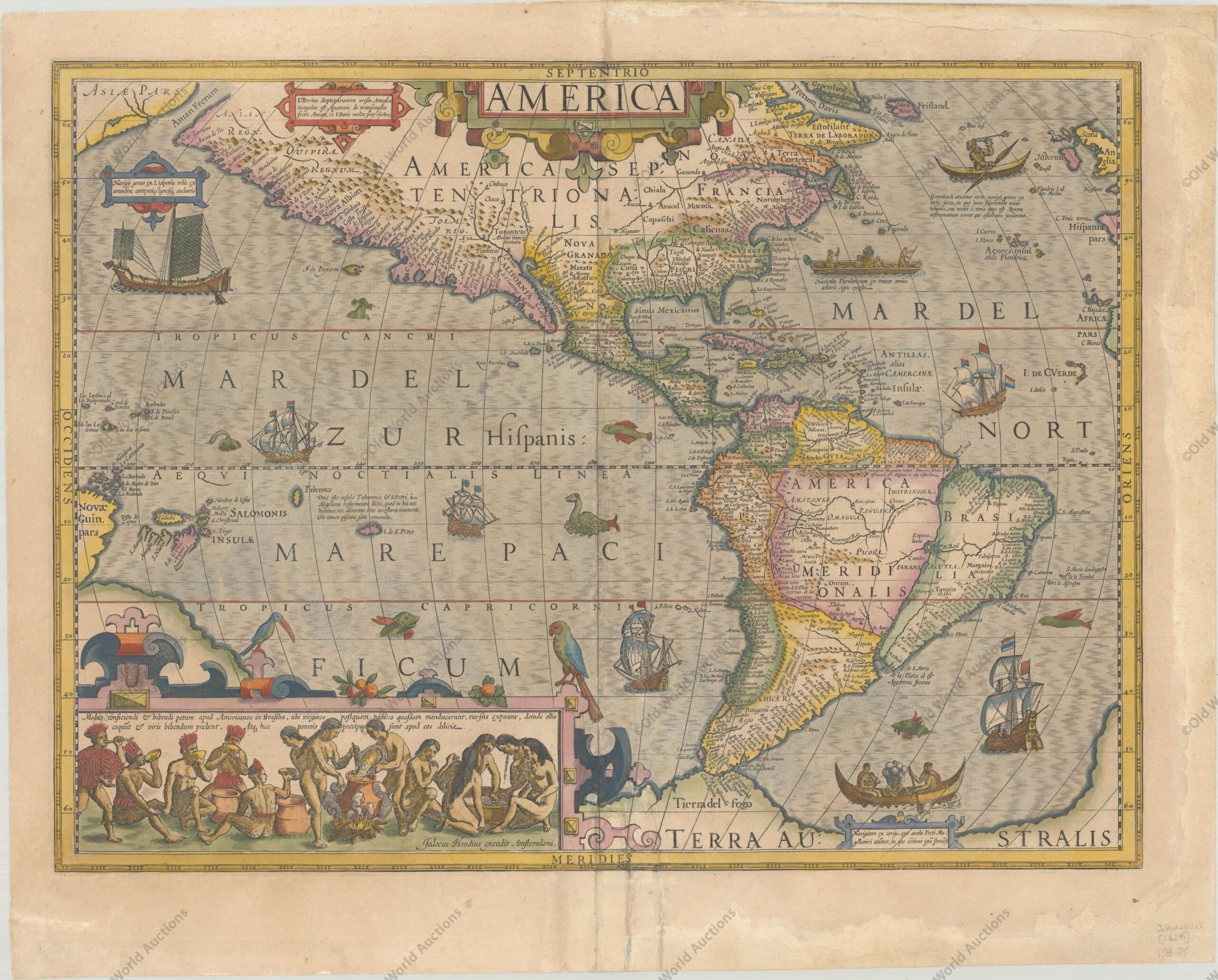 Map of the Western Hemisphere, 1550 – Sebastian Munster (1489 – 1552) was one of the three most famous cartographers of the 16th century, along with Mercator and Ortelius. Munster’s Geographia and Cosmographia Universalis were two of the most widely read and influential books of the time. His editions of Ptolemy’s Geographia, published between 1540 and 1552, were illustrated with 48 woodcut maps, the standard 27 Ptolemaic maps supplemented by 21 new maps. These new maps included a separate map of each of the known continents and marked the development of regional cartography in central Europe. The Ancient Geography was a prelude to Münster’s major work, the Cosmographia, which was published in six languages in nearly 30 editions between 1544 and 1578, and then revised and re-edited by Sebastian Petri between 1588 and 1628. The Cosmographia was a geographical reference as well as a historical and ethnographic description of the world. It included the maps of the Geographia, plus additional regional maps and city views, with nearly 500 illustrations, making it one of the most popular pictorial encyclopaedias of the 16th century. This map of the New World is often credited with popularising the name America due to the popularity of Munster’s Cosmographia and the numerous editions published in the 16th century. The influence of Marco Polo’s explorations of Asia in the 13th century is evident in the 7,448 islands of the North Pacific and Zipangri (Japan) shown off the west coast of North America. The North American continent has a very strange shape, with no Californian land mass and the eastern region almost split by a body of water known as the Verrazzano Sea. Yucatan is still shown as an island, Cozumel is called Cozumela, and Lake Temistitan (unnamed in the state) is connected to the Gulf of Mexico. South America has a large bulge on the west coast, the Amazon River is very short, and cannibals inhabit the continent, shown as Canibali next to a gruesome vignette of human limbs. The map is very decorative, with Magellan’s surviving ship Victoria appearing in the Pacific. The flags of Spain and Portugal represent their respective spheres of influence in the New World. This is the 5th state by Burden and the 4th state by Kershaw, with place names Temistitan in Mexico and Insula Atlantica in South America.Map of Brazil 1554 – This fascinating pictorial map is one of the first regional maps of Brazil available. Illustrated with north to the right, the map is filled with vignettes depicting native life rather than focusing on geographical information. Indians are shown with bows and arrows, axes, llamas and hammocks, for which Brazilians are well known. The surrounding ocean is filled with French and Portuguese ships and sea monsters. Along the coast, Europeans are shown interacting with the natives. The limited geographical information is rather inaccurate. The Amazon River (here called the Maranon F.) and the Paraná River originate from lakes near an erupting volcano. Mountains and false rivers fill the western part of Brazil, labelled Terra non Descobrirta (undiscovered land). This woodcut map is from the first block published in 1554, which was destroyed by a fire in 1557 at the printing works of Thomaso Guinti. A second block was cut in 1565, with the notable difference that Descoperta is written at the top centre instead of Discoperta. The second block was used again in 1606 and can be distinguished from the previous print by the appearance of woodworm damage on the block. Many of the blocks in the 1554 edition of Ramusio’s Delle Navigationi Et Viaggi were made by the great Venetian cartographer Giacomo Gastaldi. “Brazil, Ramusio, Giovanni Battista.Map of the Western Hemisphere, 1581 – This is one of the most famous maps of the Americas and had a major influence on future cartography of the New World. The map is largely based on Gerard Mercator’s large multi-sheet world map of 1569. The most recognisable features of the map are the bulbous Chilean coastline and the exaggerated width of the North American continent. In North America, the long St Lawrence River crosses the continent to almost meet the fictitious Tiguas River flowing to the west. The strategically placed title cartouche hides the unknown South Pacific and thus most of the supposed great southern continent, which is shown attached to New Guinea and Tierra del Fuego. This map is from the second copper plate containing the same geography as the first [1570]. On this plate, the largest ship in the Pacific is now sailing east and away from the viewer. Religious persecution forced Ortelius to leave Antwerp and there was a four-year hiatus in the publication of the Theatrum. When he re-established himself in Liège, he used Christopher Plantin’s large printing press to resume publication with several revised plates. This plate had a relatively short life of only 8 years, being replaced in 1587 by the easily distinguishable plate of the revised South American form.Map of the Western Hemisphere, 1587 – This is one of the most famous maps of the Americas and had a huge influence on future cartography of the New World. Engraved by Frans Hogenberg, it is largely based on Gerard Mercator’s great multi-sheet world map of 1569. The map shows an exaggerated extension of the North American continent, with the long St Lawrence River crossing the continent to almost meet the fictitious Tiguas River flowing westwards. The strategically placed title card hides the unknown South Pacific and thus most of the supposed great southern continent, which is shown attached to New Guinea and Tierra del Fuego. This is the third plate of the Americas used by Ortelius, as evidenced by the removal of the bulge on the south-west coast of South America and the addition of a cartouche in North America. Also on this plate, the Solomon Islands are mentioned for the first time since their discovery in 1568, and the names California