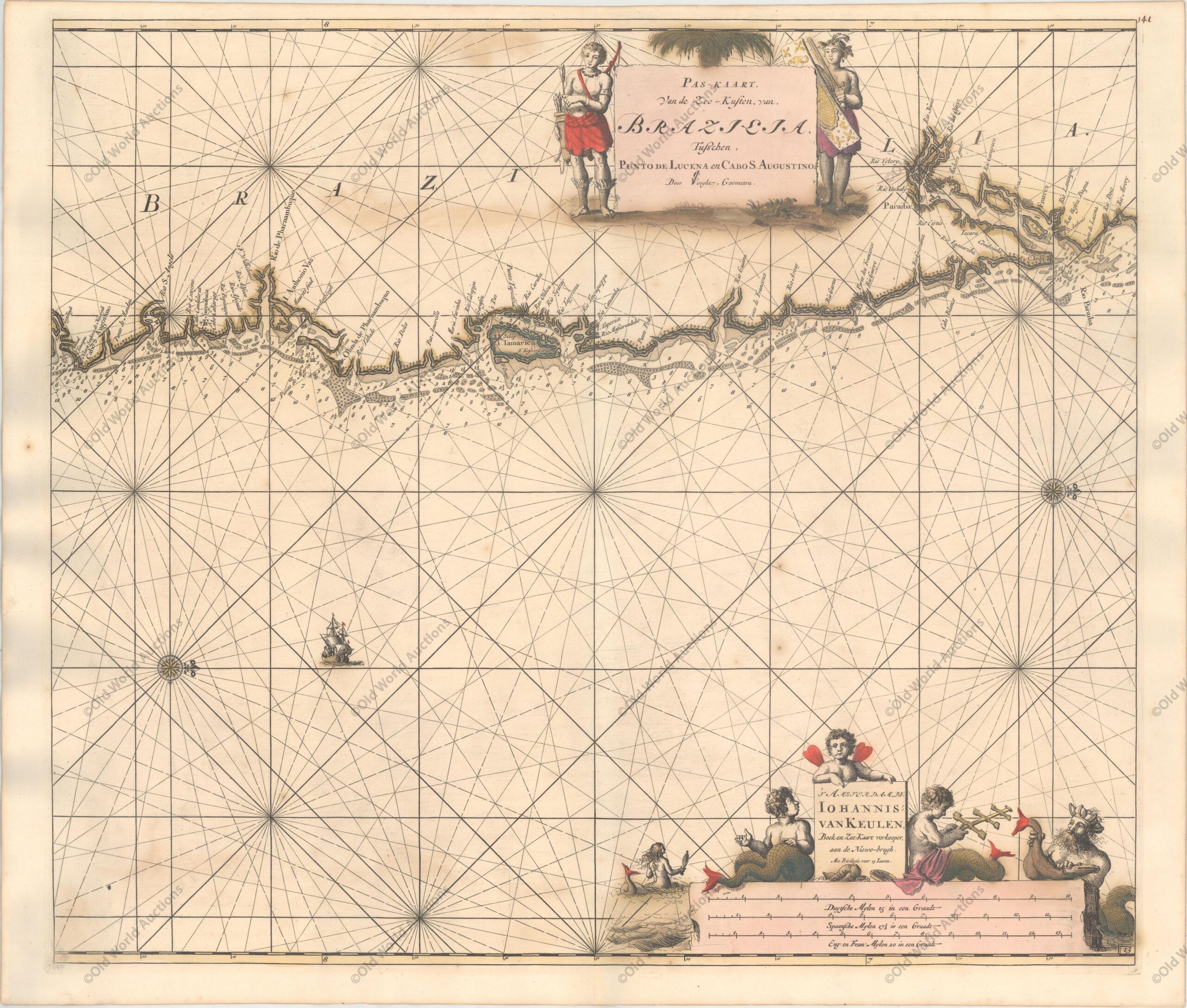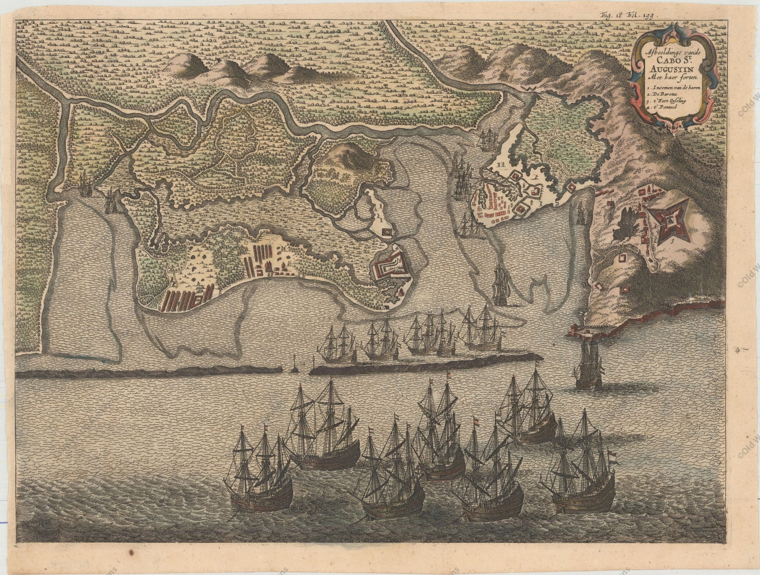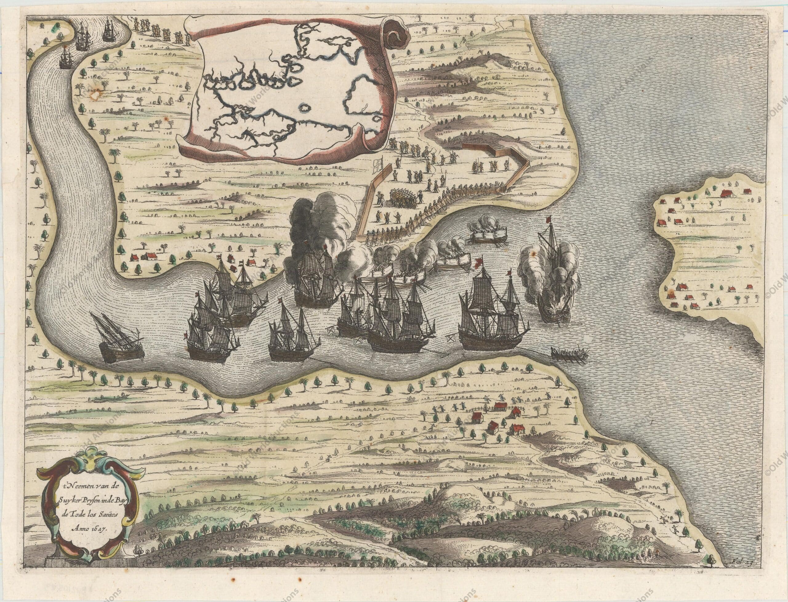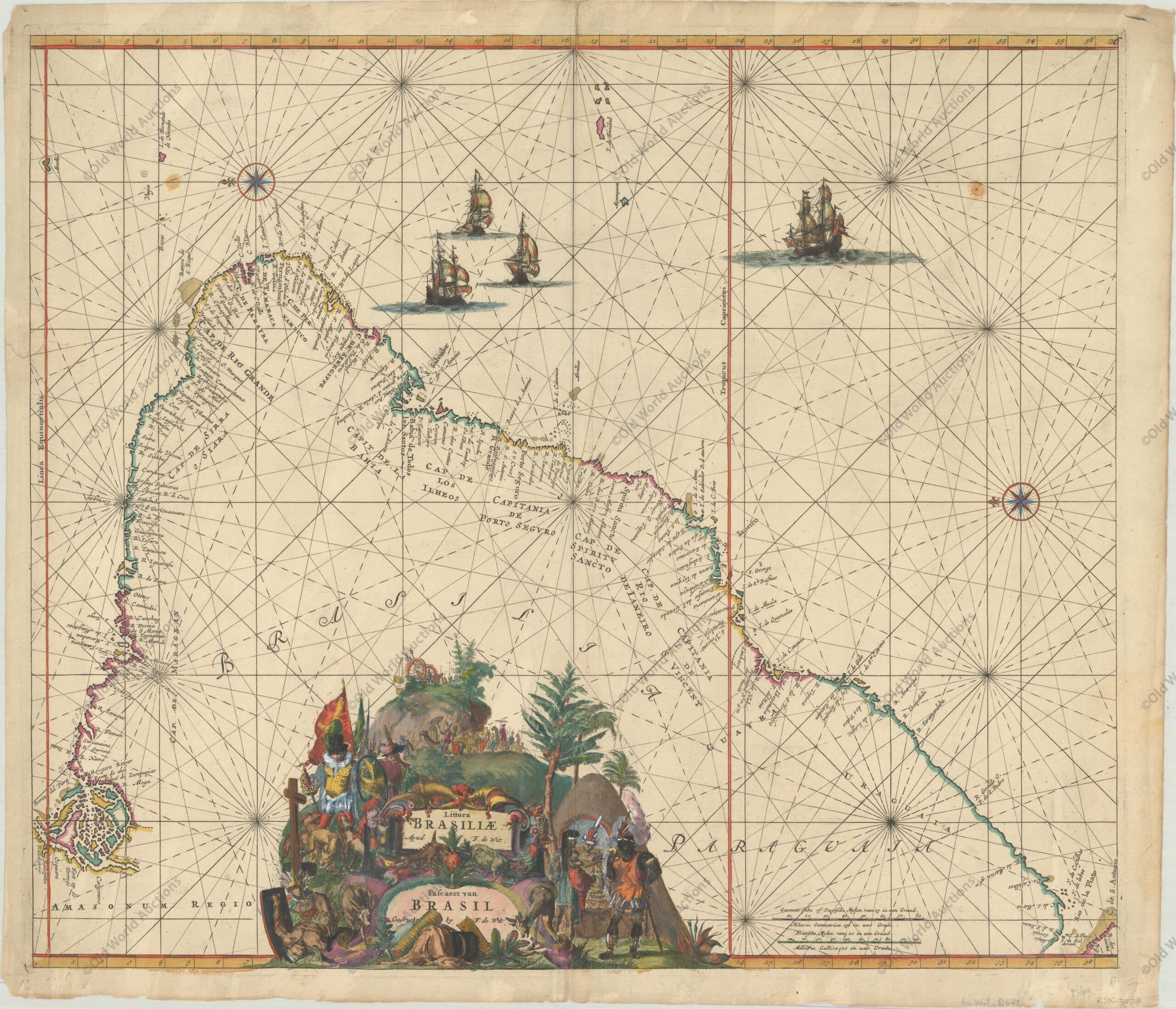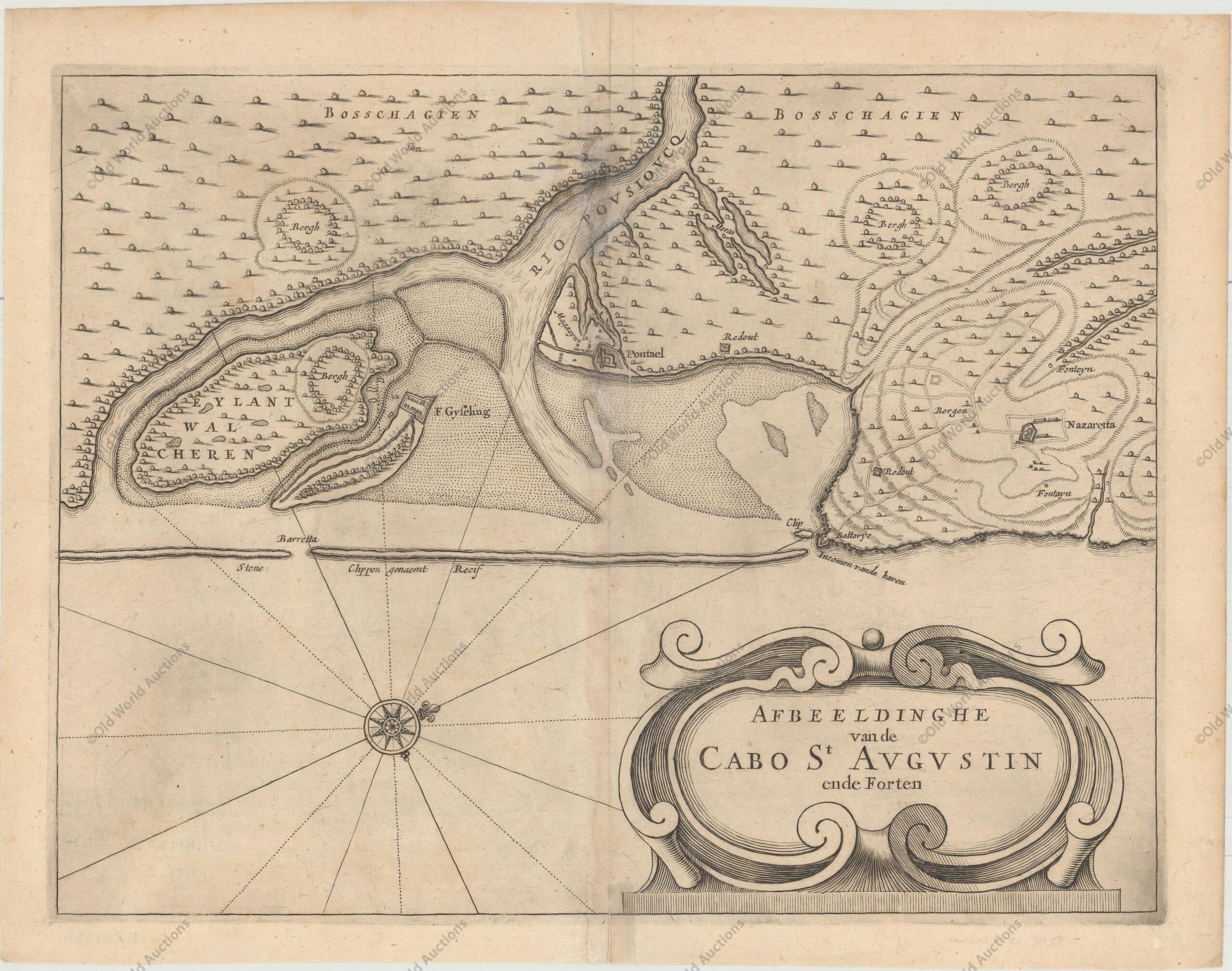 Historical facts and maps showing the territorial development of Brazil.Map of Cabo Santo Agostinho 1645 – This beautiful copper engraved map shows the harbour and fortifications of Cabo Santo Agostinho. Fort Nazaré is shown on a hill to the right. Decorated with a compass pointing north at the top right of the map and a title cartouche in stripes. “Afbeeldinghe van de Cabo St. Augustin ende Forten”, by Laet, Joannes.