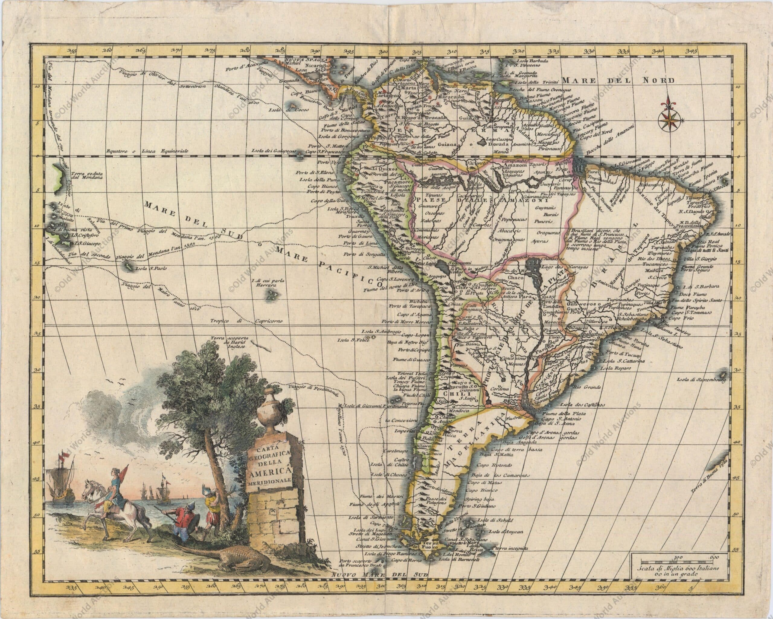 Map of the Bay of All Saints 1769 – This is a boldly engraved map of the Bay of Salvador (Bahia) with an inset plan of the fortified city of Salvador. Inlets and shoals are shown in the bay. Numerous plantations and sugar mills are shown with symbols along the coast and rivers. There is a large decorative rococo title cartouche and two wind roses. “Kaart van de Aller-Heiligen Baay waar aan de Hoofdstad legt van Brazil”, Tirion, Isaac.Map of Santa Catalina Island 1777 – This is a rare Spanish map of the island of Santa Catalina, now the city of Florianópolis and an important tourist destination. It shows the unspoilt island with a few small villages and several sheltered anchorages. A coastal approach is shown at the top. “Plan de la Isla y Puerto de Santa Catalina situado en la America Meridional”, Lopez, D. Tomas.Map of Brazil 1798 – This is an unusual Italian map of Brazil, Paraguay and Uruguay. It extends to the outskirts of Buenos Aires. It shows a great deal of detail, including extensive river systems. The large landscape title cartouche shows Indians tending a fire. “Il Brasile ed il Paese delle Amazzoni col Paraguai Delineati sulle Ultime Osservazioni”, Cassini, Giovanni Maria.1823 Map of Brazil1832 Map of Brazil1840 Map of South America – Part 1 – This impressive large map is taken from Louis Stanislas D’Arcy Delarochette’s monumental eight-sheet map of South America, which was used to settle countless boundary disputes across the continent. It contains the most up-to-date geographical information and many interesting annotations. Three insets at the bottom of the map present data from Humboldt’s report in the form of topographic profiles: “Section of the Andes…”, “Section of South America from West to East…”, and “Section of the road from La Guayra to Caracas”. Also includes a comparative table of distances and an index entitled “Civil divisions, population and extension” for Colombia, Peru, the United Provinces, Chile, Patagonia, Brazil and Guyana. Printed on two sheets, not joined as issued – the map would measure 30 x 42.5″ if joined. “Colombia Prima or South America”, Wyld, James.1840 Map of South America – Part 2 – This impressive large map is taken from Louis Stanislas D’Arcy Delarochette’s monumental eight-sheet map of South America, which was used to settle many of the continent’s boundary disputes. It contains the most up-to-date geographical information and many interesting annotations. Three insets at the bottom of the map present data from Humboldt’s report in the form of topographic profiles: “Section of the Andes…”, “Section of South America from West to East…”, and “Section of the road from La Guayra to Caracas”. Also includes a comparative table of distances and an index entitled “Civil divisions, population and extension” for Colombia, Peru, the United Provinces, Chile, Patagonia, Brazil and Guyana. Printed on two sheets, not joined as issued – the map would measure 30 x 42.5″ if joined. “Colombia Prima or South America”, Wyld, James.Map of Brazil from 1850Large scale marine chart of the region west of Rio de Janeiro from 1884 – Beautiful large scale marine chart of the region west of Rio de Janeiro. Complete with soundings, anchorages and navigational hazards. In the background is a view of Ilha Grande and the East Passage. The map was first drawn by Captain Mouchez of the French Imperial Navy in 1868-69 and published by the British Admiralty in 1870. This map was updated for 1884.