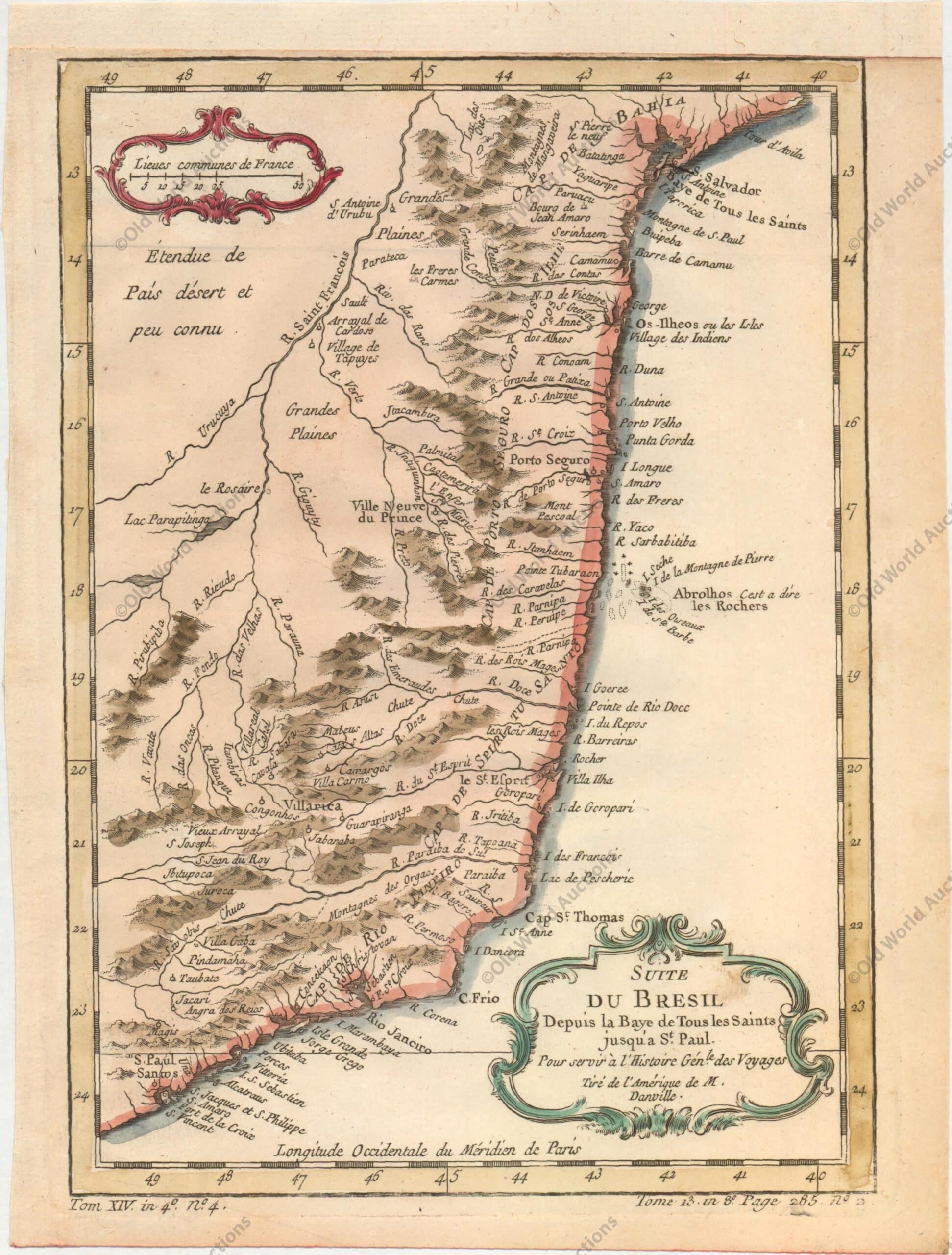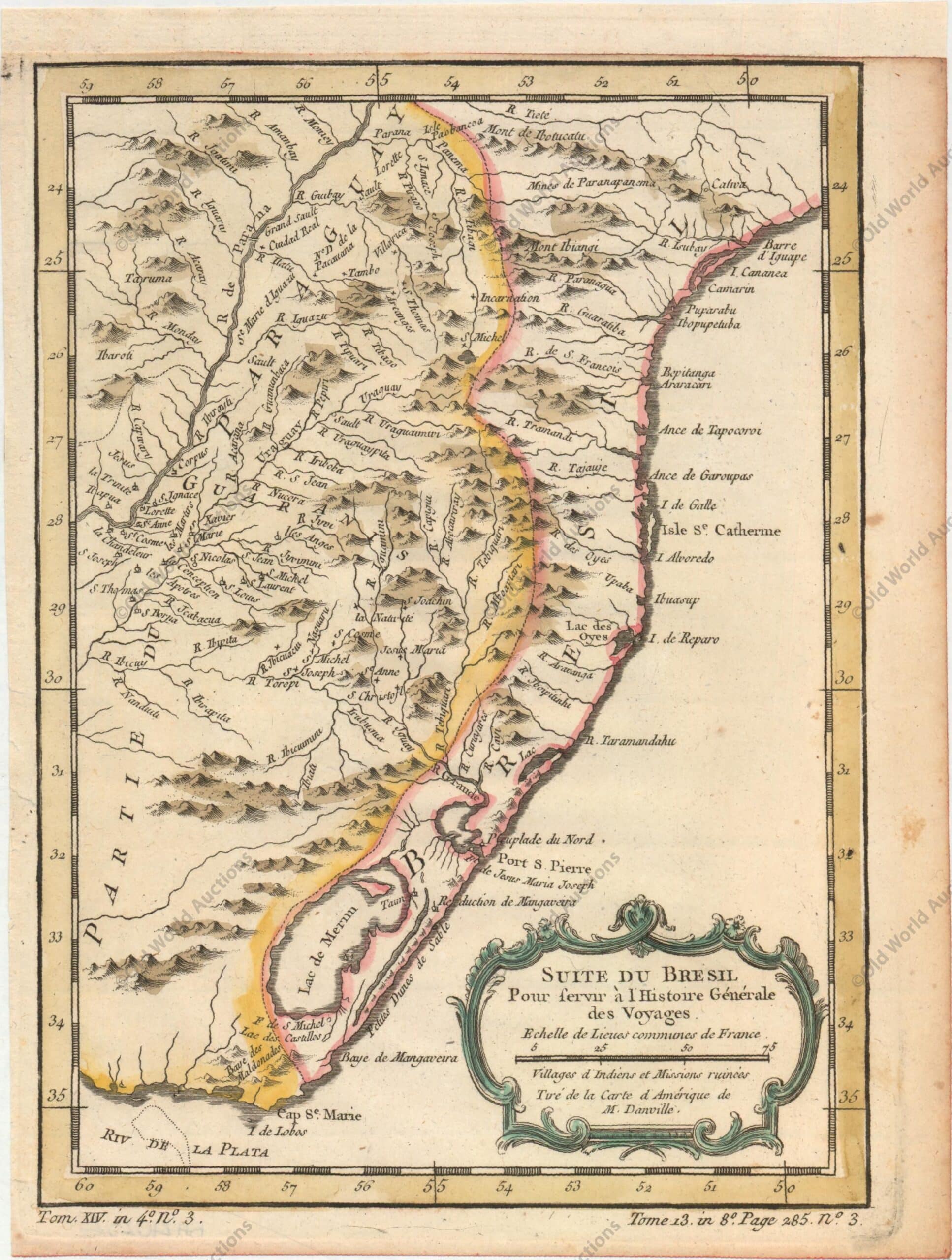 Map of Brazil 1757 – Part 1 – This pair of copper engraved maps covers the Brazilian coast and shows the capitanias or hereditary port delegations. The first map runs from Salvador to Santos and the second to Maldonado in Uruguay. There are good interior details of rivers and mountains. Sizes vary slightly. “Lot of 2] Suite du Bresil Depuis la Baye de Tous les Saints Jusqu’a St. Paul [and] Suite du Bresil pour Servir a l’Histoire Generale des Voyages”, Bellin, Jacques Nicolas.Map of Brazil 1757 – Part 2 – This pair of copper engraved maps covers the Brazilian coast and shows the capitanias or hereditary port delegations. The first map runs from Salvador to Santos and the second to Maldonado in Uruguay. There are good interior details of rivers and mountains. Sizes vary slightly. “Lot of 2] Suite du Bresil Depuis la Baye de Tous les Saints Jusqu’a St. Paul [and] Suite du Bresil pour Servir a l’Histoire Generale des Voyages”, Bellin, Jacques Nicolas.