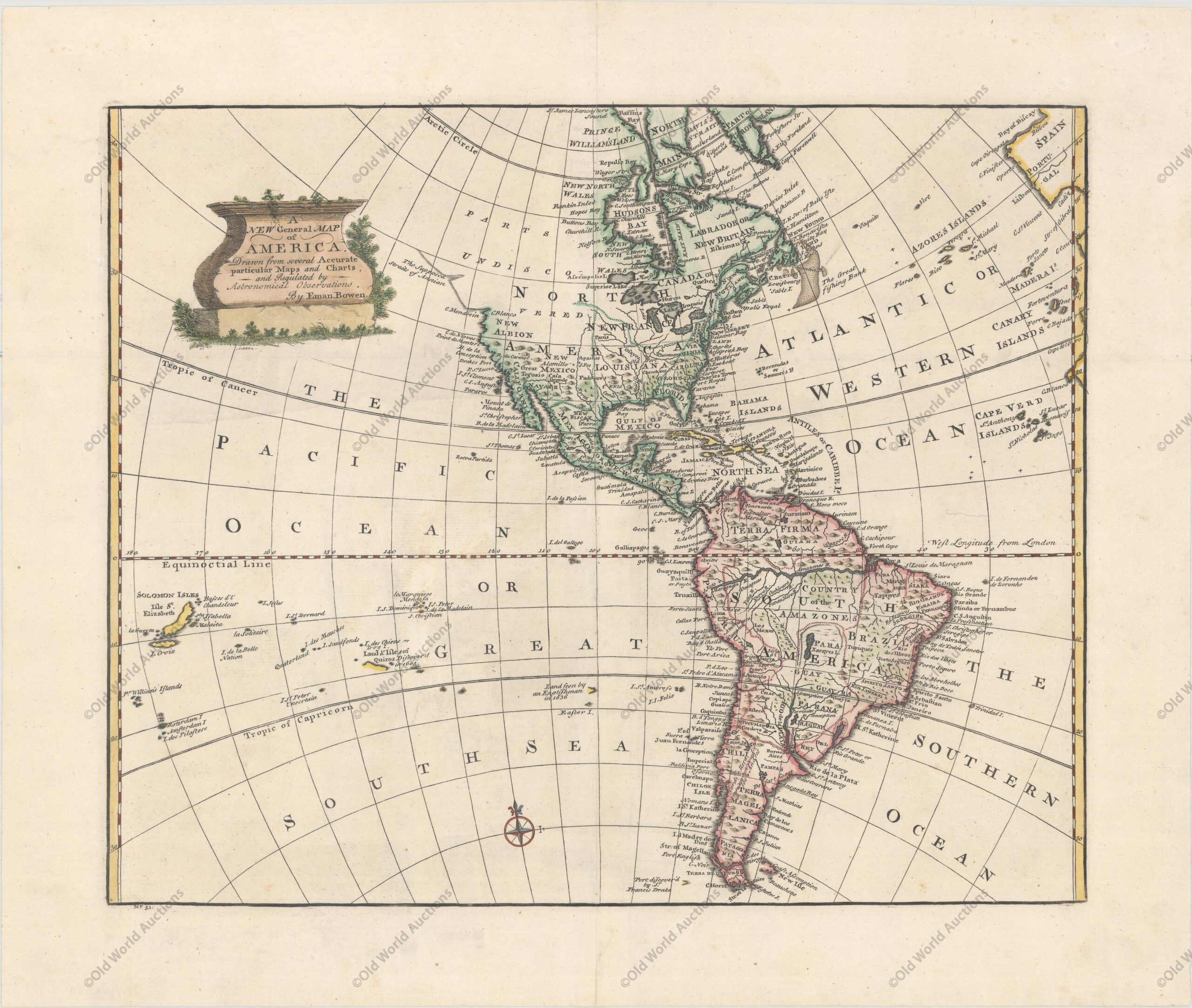 Map of Brazil 1747 – copper engraved map with good detail along the coast with dozens of place names. The map covers the region between northern Paraguay and north to the mouth of the Amazon. A large inset of St Catherine’s Island fills the empty ocean. In a long note at the end, Bowen states that he has deliberately “omitted the imaginary Island of Ascension, under the authority of Dr Halley”. The map contains several other annotations, including an area claimed to be “rich in gold and silver”. “A New & Accurate Map of Brazil. Divided into its capitals, drawn from the most approved modern maps & charts…”, Bowen, Emanuel