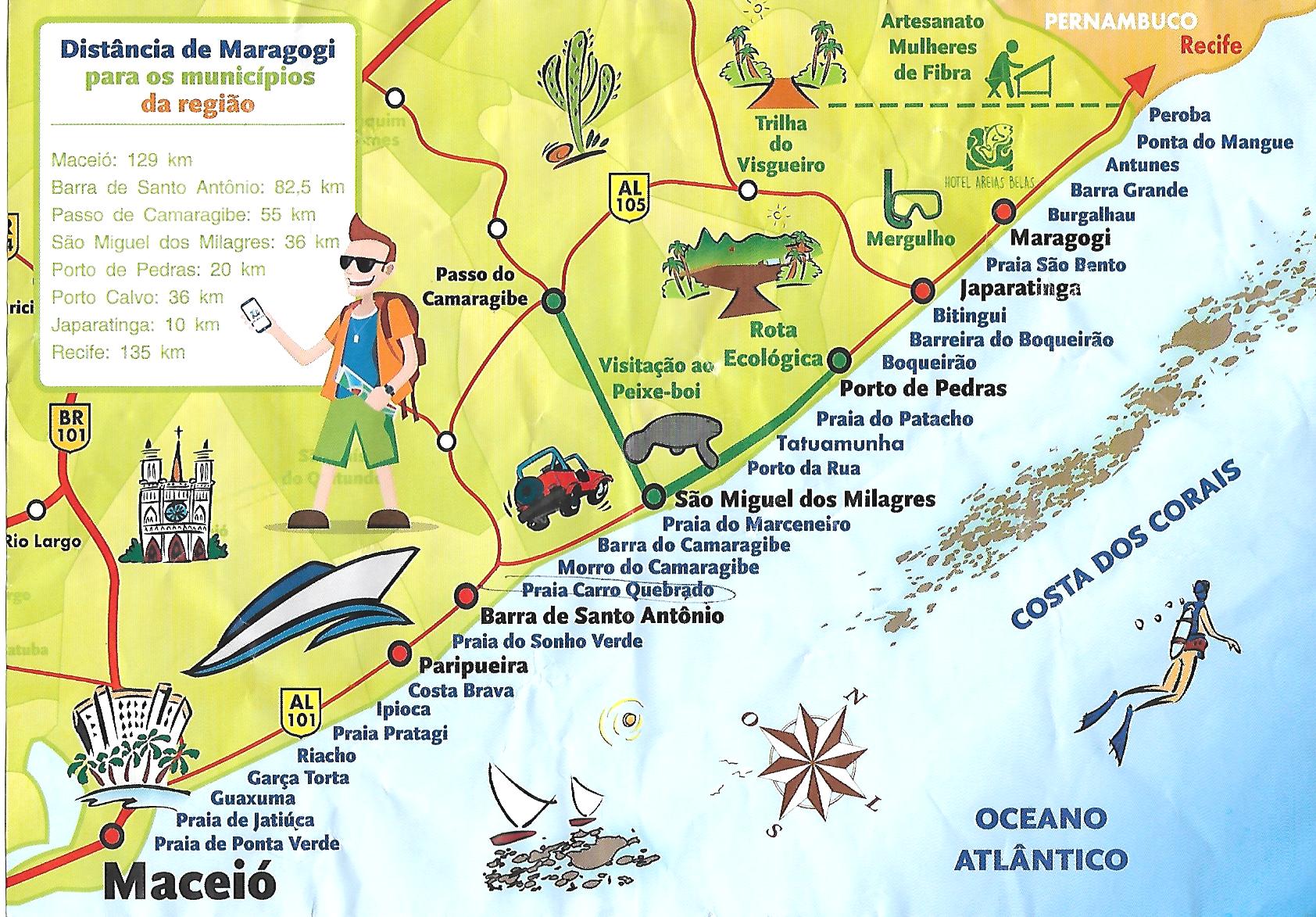 - Afternoon: Walk along the coast. The coasts of Pajuçara, Ponta Verde and Jatiúca are connected. The distance from one end to the other is about 4 km, ideal for walking or cycling.