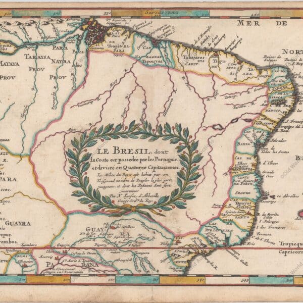 Map of Brazil divided into fourteen hereditary captaincies from 1657 onwards “Le Bresil, dont la Coste est Possedee par les Portugais, et Divisee en Quatorze Capitaineries…”, Sanson, Nicolas Map of Brazil divided into fourteen hereditary captaincies, 1657 – This is a reduced version of Sanson’s important map showing the Portuguese […]