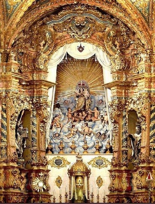 - El interior de la basílica está ricamente decorado, con altares dorados, paneles de azulejos portugueses y una serie de capillas laterales dedicadas a diferentes santos. El altar mayor es particularmente impresionante, con una imagen de Nuestra Señora del Carmen entronizada en un lugar destacado.