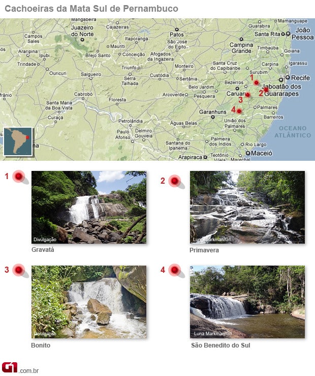 A través de la Serra das Russas, los visitantes llegan a la ciudad de Gravatá, en la región de Mata Sul de Pernambuco, que tiene un agradable clima tropical. Sin embargo, en los días calurosos, pueden refugiarse en las cascadas del Tio y de la Palmeira. Ambas cascadas están abiertas al público todos los días y hay que pagar una tasa de conservación.
