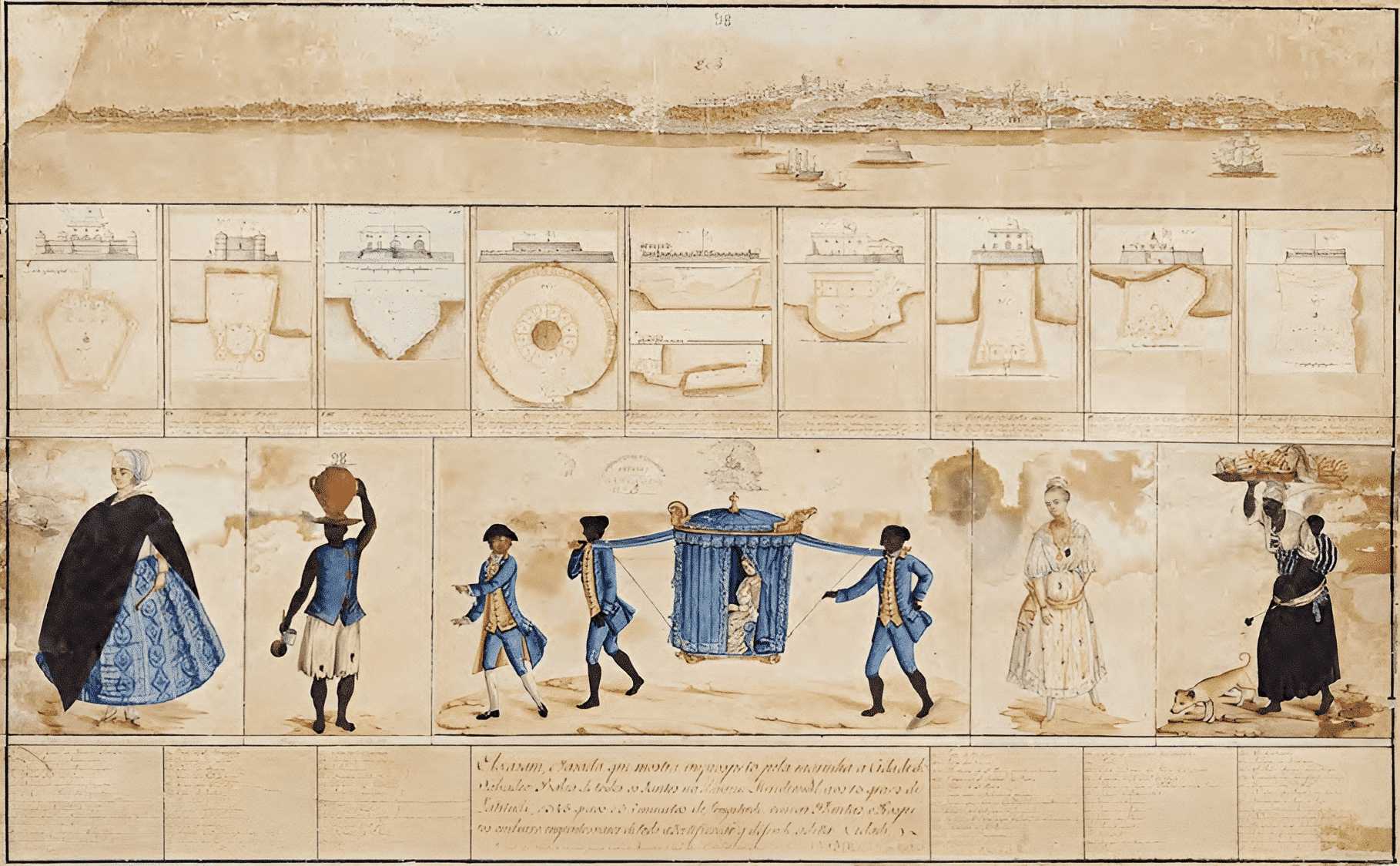 Las figuras representadas en el tablero de Julião corresponden aproximadamente a dos damas blancas, dos figuras de esclavos (un hombre negro con una jarra de barro en la cabeza y una mujer negra que lleva una bandeja de frutas), así como un grupo central, en el que dos esclavos llevan a una dama blanca en un sillón4, acompañados por un caballero que les indica la dirección correcta5. Las imágenes están rotuladas con las siguientes leyendas: