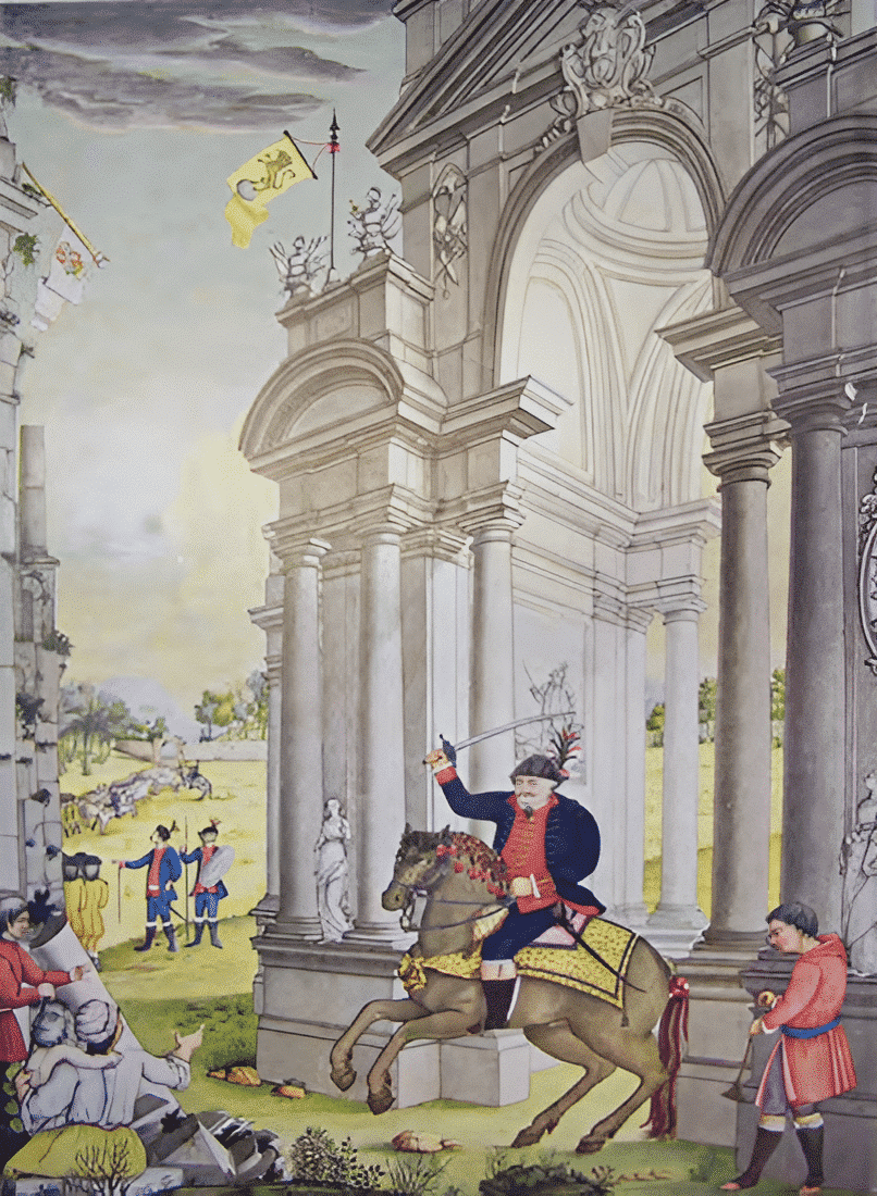 El tercero de los segmentos horizontales que componen el Tablero de elevación y fachada marca, sin embargo, una diferencia en la obra de Julião en el contexto de la producción iconográfica de carácter militar.