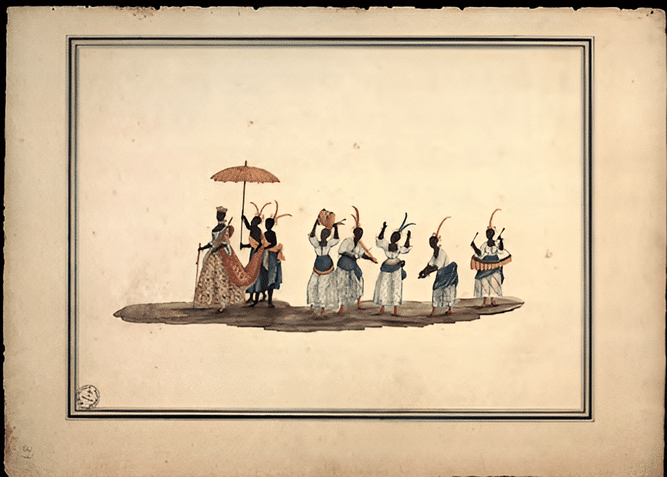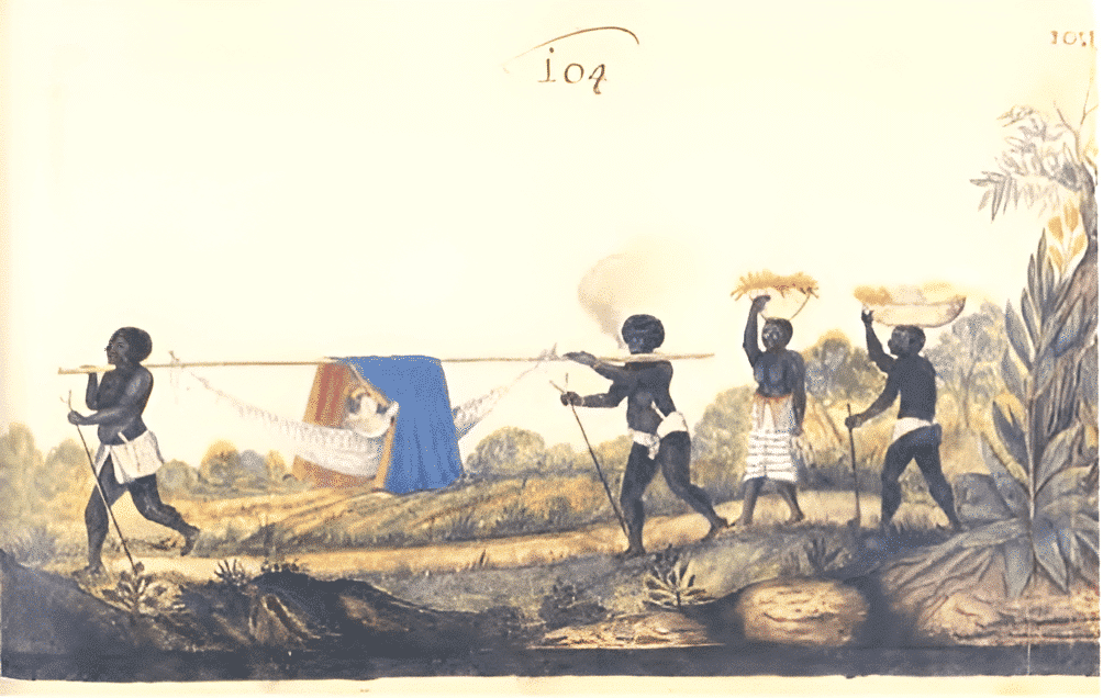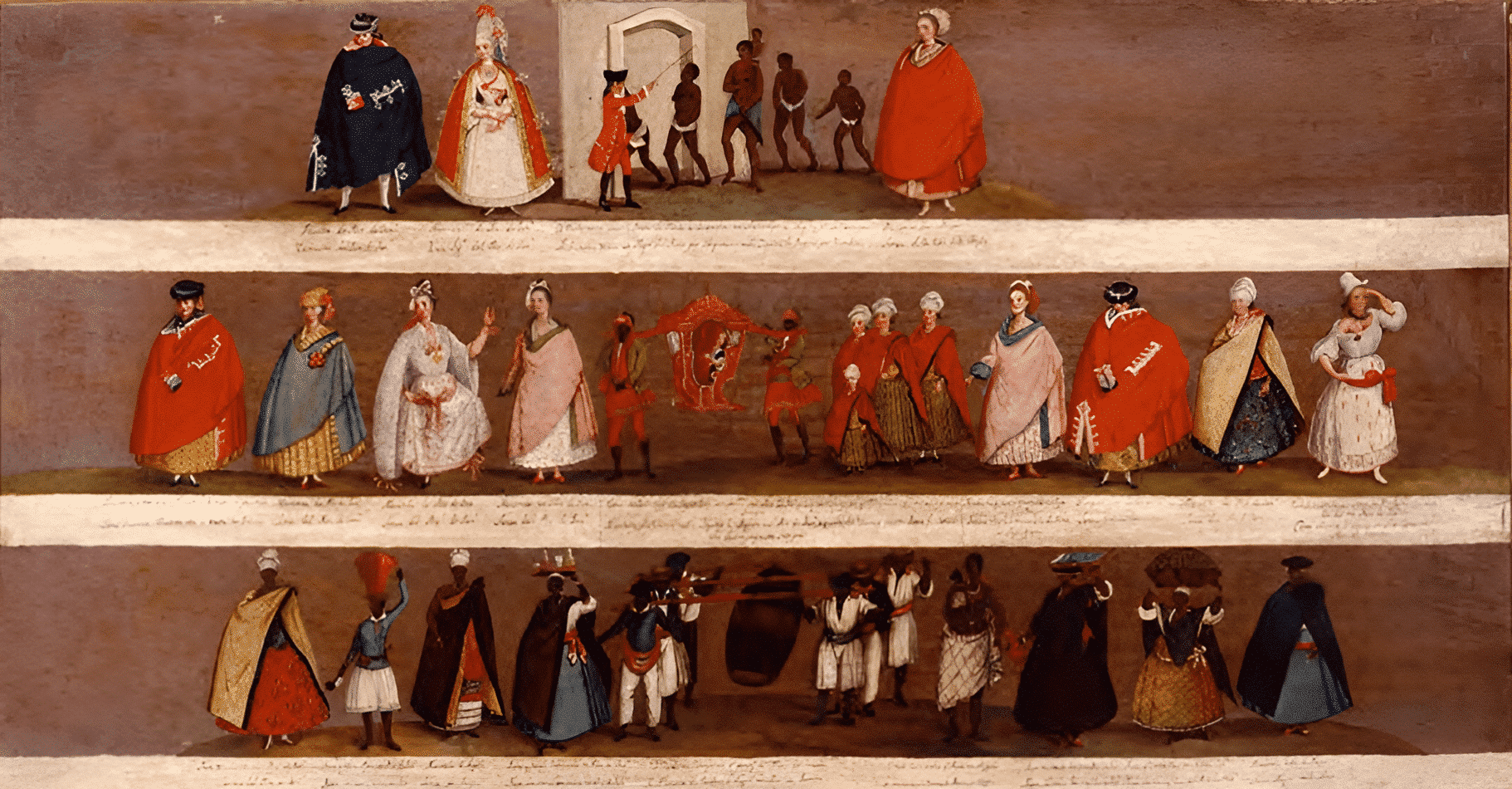 En el grupo central, el refinamiento que rodea la figura de la«dama»de Bahía es evidente, ya sea desde el punto de vista del sillón en el que es transportada (de madera tallada, con dorados y adornos), desde el punto de vista del sillón en el que es transportada (de madera tallada, con dorados y adornos), desde el punto de vista de su propia vestimenta (que es más sofisticada que la de los demás personajes tras las cortinas ), o incluso desde el punto de vista de los hombres negros que la transportan, vestidos con esmero, aunque descalzos.