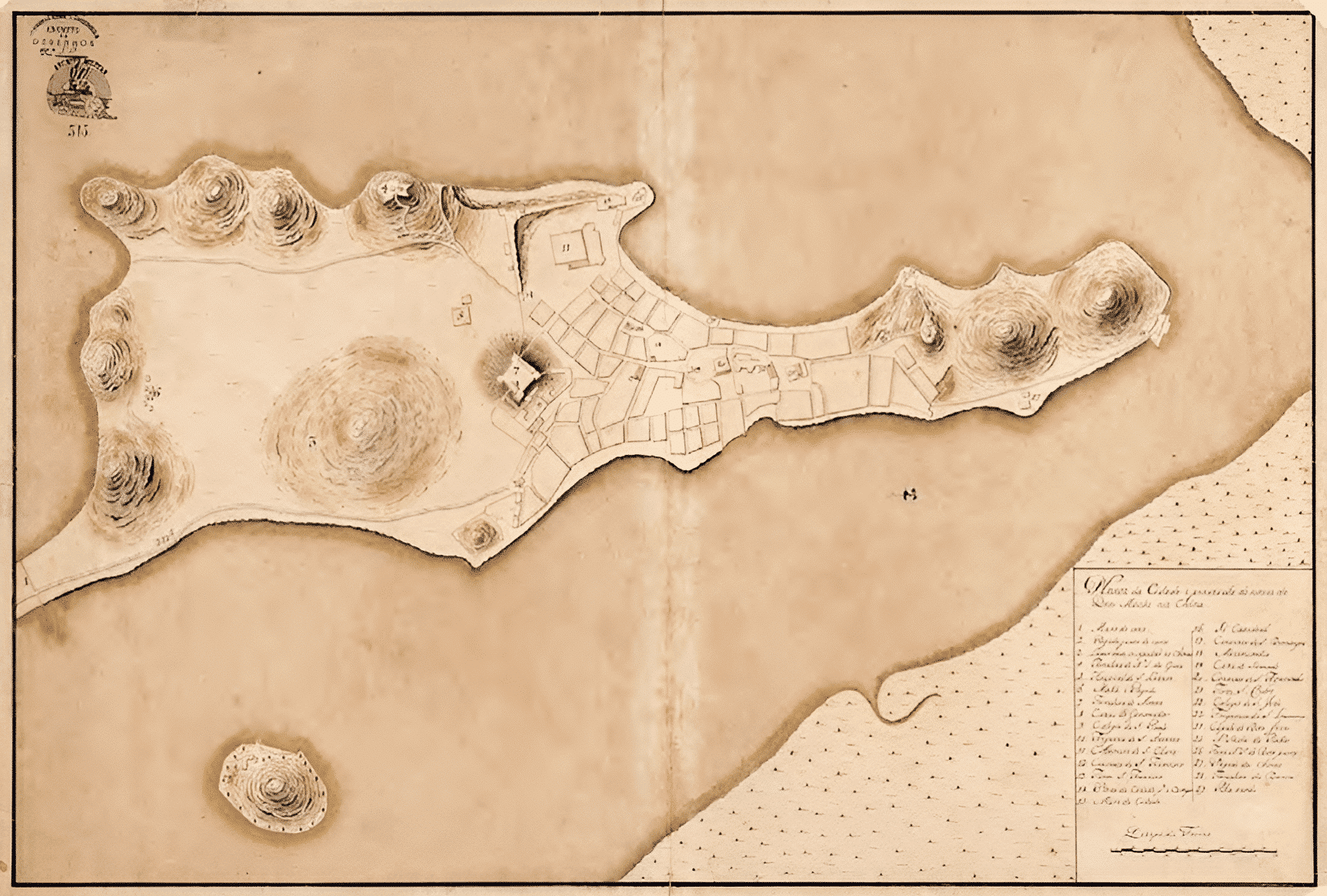 - Fortaleza del Mar. Esta fortaleza está situada dentro del mar, lejos de la tierra, con dos tiros de mosquete, los de bronce con calibres 24, 18, 16 y 8 y los de hierro con calibres 40, 36, 26 y 18.