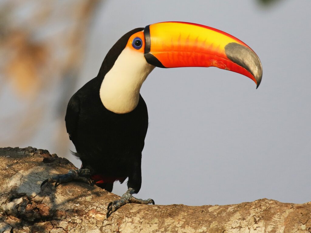 El tucán toco no solo vive en el bosque, sino que también se adentra en el campo abierto. Su enorme pico, de vibrantes tonos amarillos, naranjas y rojos, con la punta negra, parece pesado, pero su estructura ósea no es maciza, por lo que es ligero y no dificulta el vuelo.