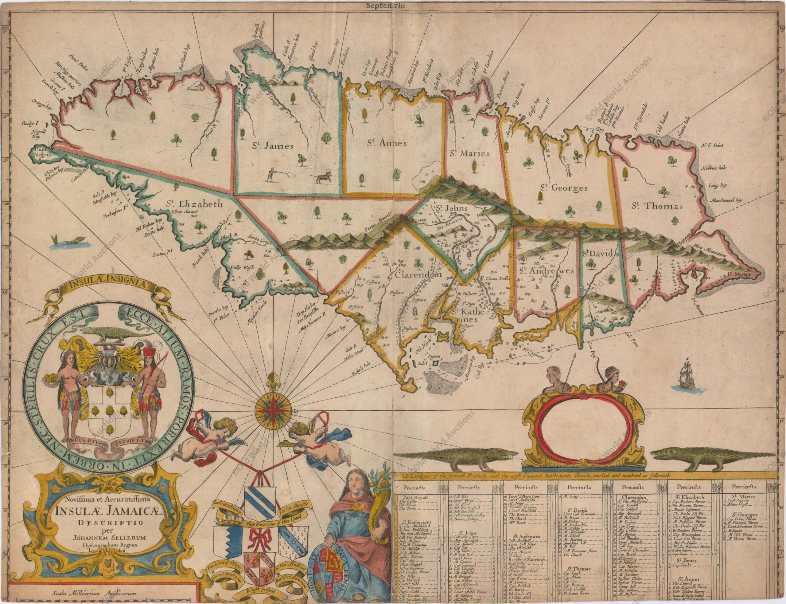 El mapa está espléndidamente decorado con una cartela que muestra el escudo de armas de Jamaica y putti que sostienen en alto los escudos de armas de los gobernadores de la isla: Doyley, Winsor, Modiford y Lynch.