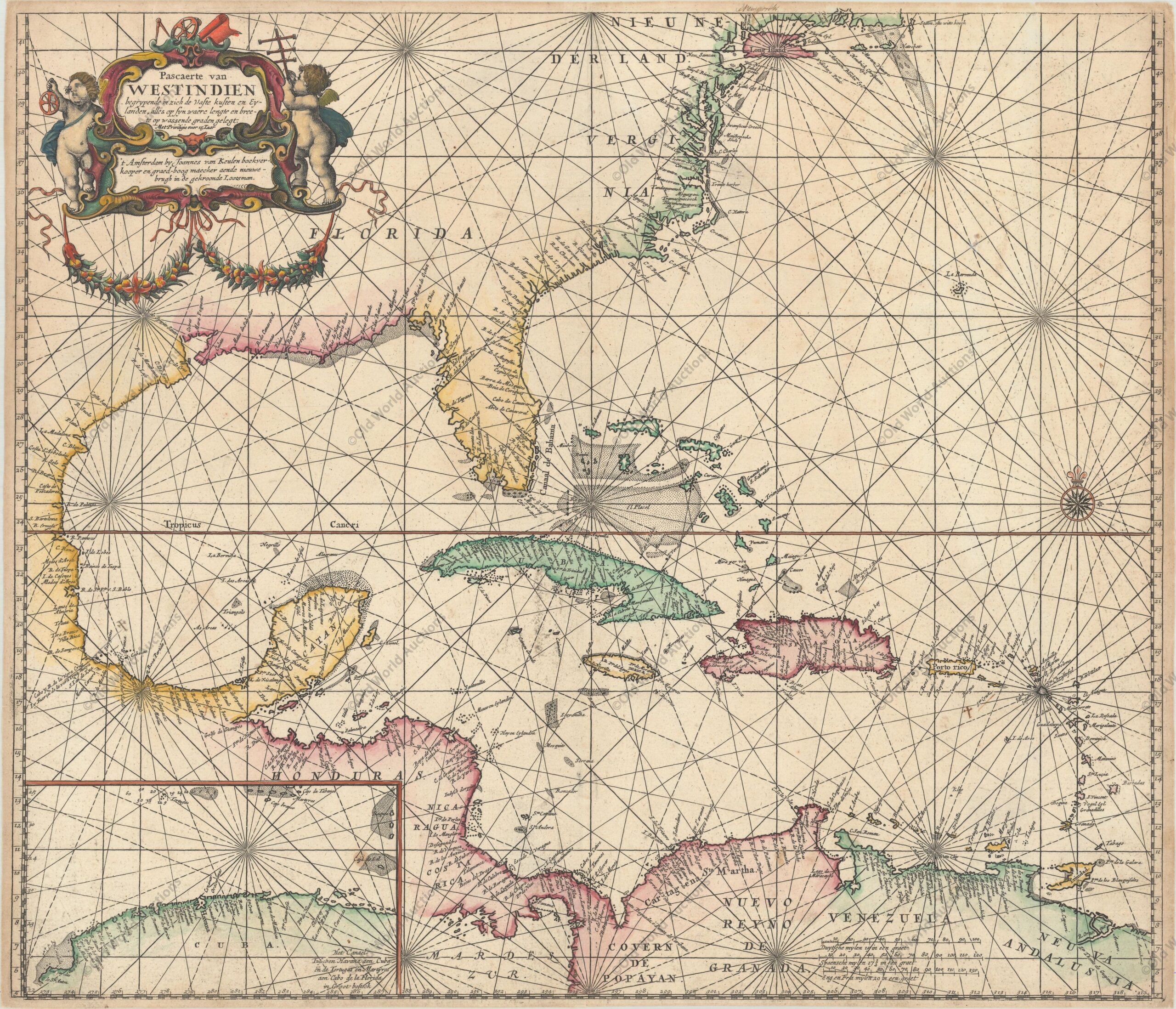 La carta marítima del golfo de México y el Caribe de Van Keulen, elegantemente grabada, se basó en el mapa de la región de Hessel Gerritsz, publicado hacia 1631, que influyó en numerosas derivadas.