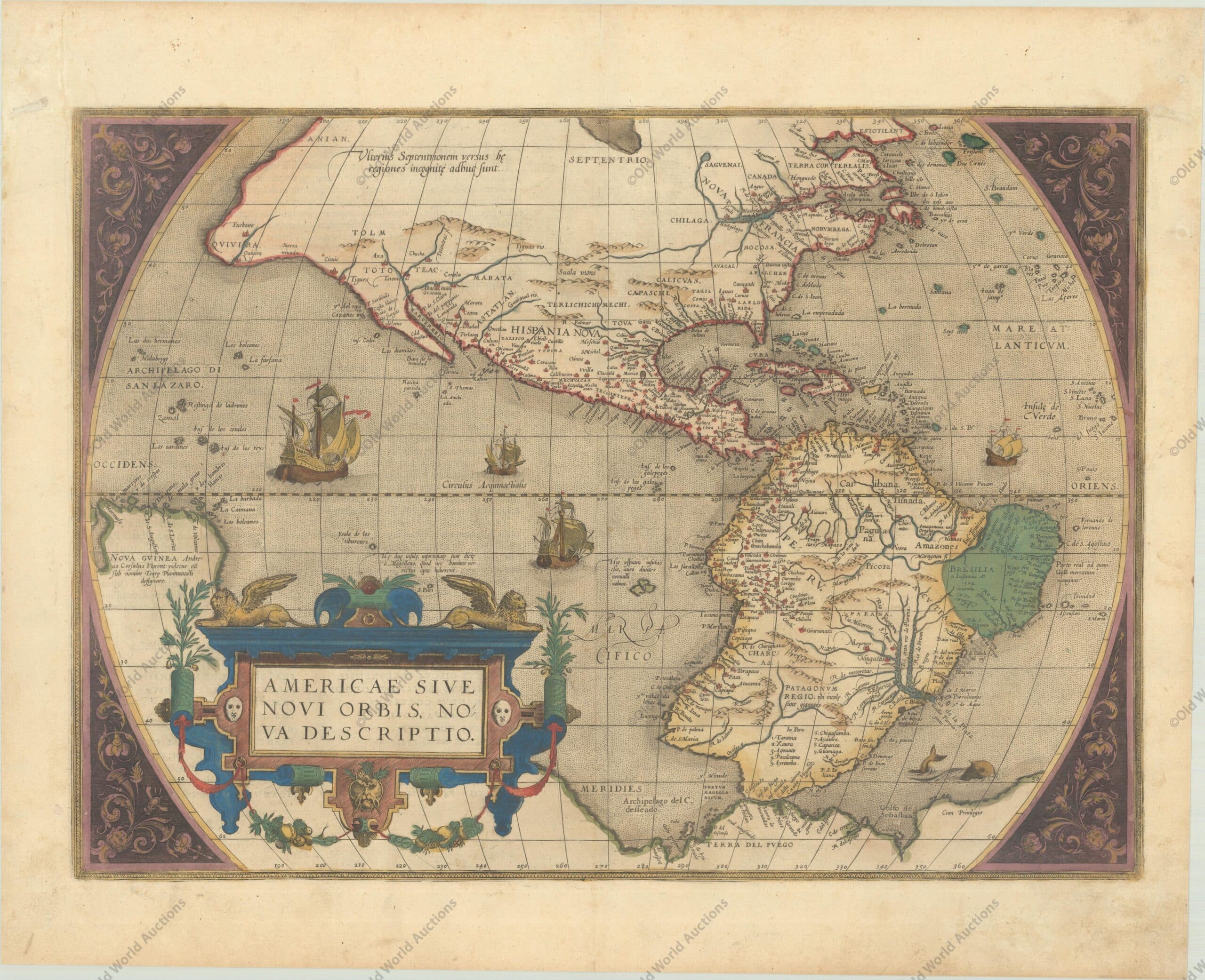 1579: Mapa del hemisferio occidental, América, Theatrum Orbis Terrarum. El influyente mapa del Nuevo Mundo de Ortelius, la segunda lámina en color contemporáneo Americae sive Novi Orbis, Nova Descriptio, Ortelius, Abraham. Este es uno de los mapas más famosos de América, que tuvo una enorme influencia en la futura cartografía del Nuevo Mundo. El mapa se basa principalmente en el gran mapamundi de varias hojas de Gerard Mercator de 1569. Los rasgos más reconocibles son la voluminosa costa chilena y la exagerada anchura del continente norteamericano. América del Norte muestra un largo río, el San Lorenzo, que atraviesa el continente hasta casi encontrarse con el ficticio río Tiguas, que fluye hacia el oeste. La cartela del título, estratégicamente situada, oculta el desconocido Pacífico Sur y, por tanto, la mayor parte del supuesto gran continente austral, que se muestra unido a Nueva Guinea y Tierra del Fuego. Este mapa procede de la segunda plancha de cobre, que contiene una geografía idéntica a la de la primera plancha de 1570. En esta plancha, el barco más grande del Pacífico navega ahora hacia el este, alejándose del observador. Debido a la persecución religiosa, Ortelius se vio obligado a abandonar Amberes y, como consecuencia, hubo un lapso de cuatro años en la publicación del Theatrum. Cuando se estableció de nuevo en Lieja, utilizó la gran imprenta de Christopher Plantin para reanudar la publicación con una serie de planchas revisadas. Esta plancha tuvo una vida relativamente corta, de solo 8 años, y fue sustituida en 1587 por la plancha que se distingue fácilmente de la forma revisada de Sudamérica. Referencias: Burden #52; Goss (NA) #11; Van den Broecke #10. Mapa del hemisferio occidental de 1579.