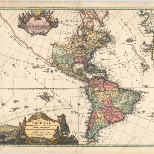 Mapa del hemisferio occidental de 1730. Este atractivo mapa es una revisión del antiguo mapa de las Américas de 1710 de Homann. Tras la muerte de su padre en 1724, su hijo (Johann Christoph Homann) volvió a grabar la plancha para corregir la costa occidental de Norteamérica, que aquí se […]
