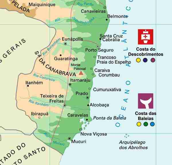 Les villes et l'archipel des Abrolhos, à l'extrémité sud de Bahia