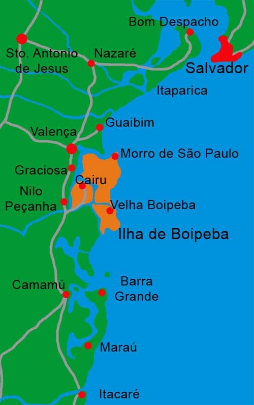 - En voiture : depuis Salvador, prenez la BR-324 en direction de Feira de Santana, puis la BR-101 en direction du sud jusqu’à l’embranchement de Valença. À Valença, vous pouvez laisser votre voiture dans l’un des parkings situés à proximité du terminal de la voie navigable, puis prendre un bateau rapide pour Boipeba.